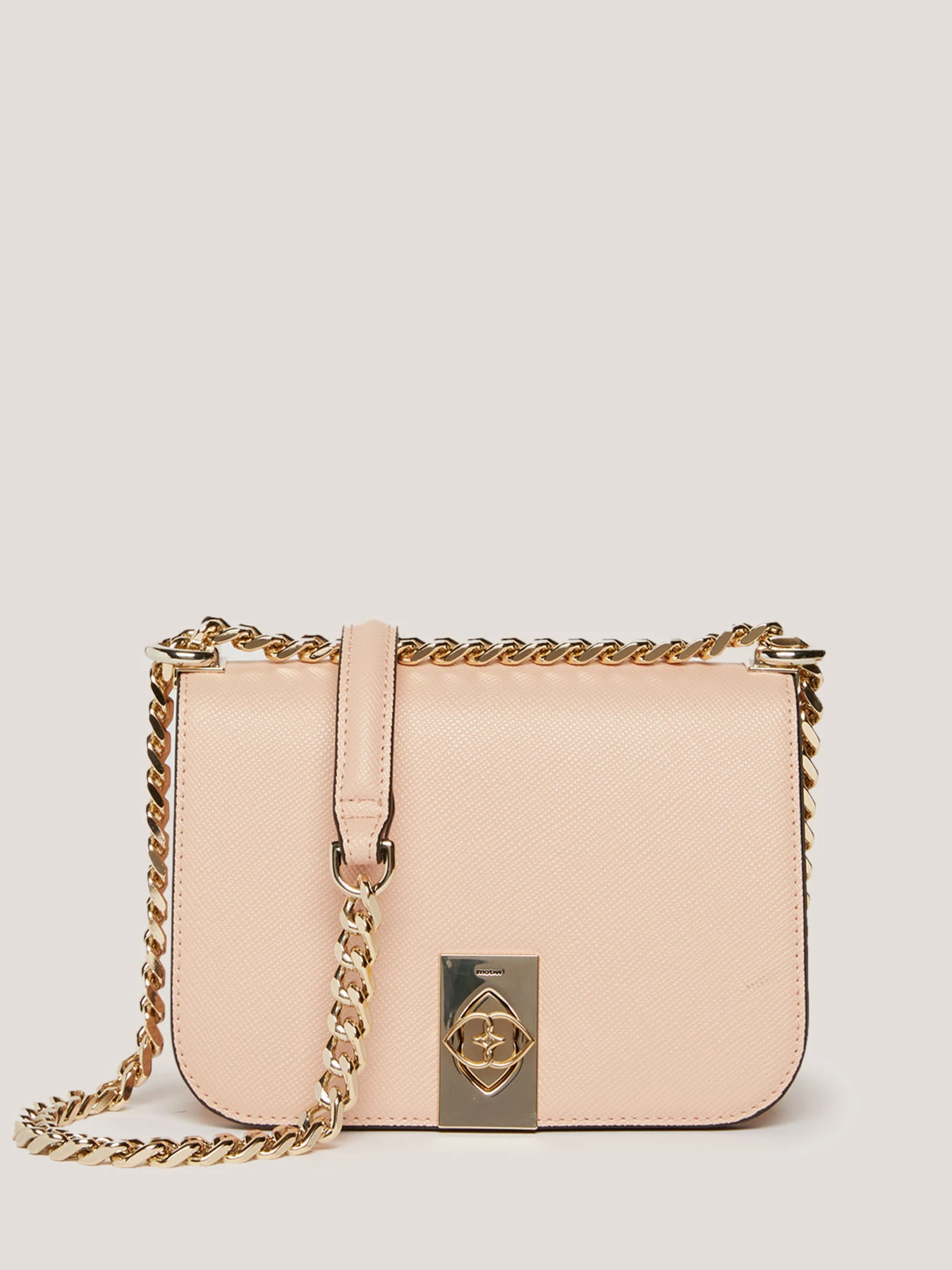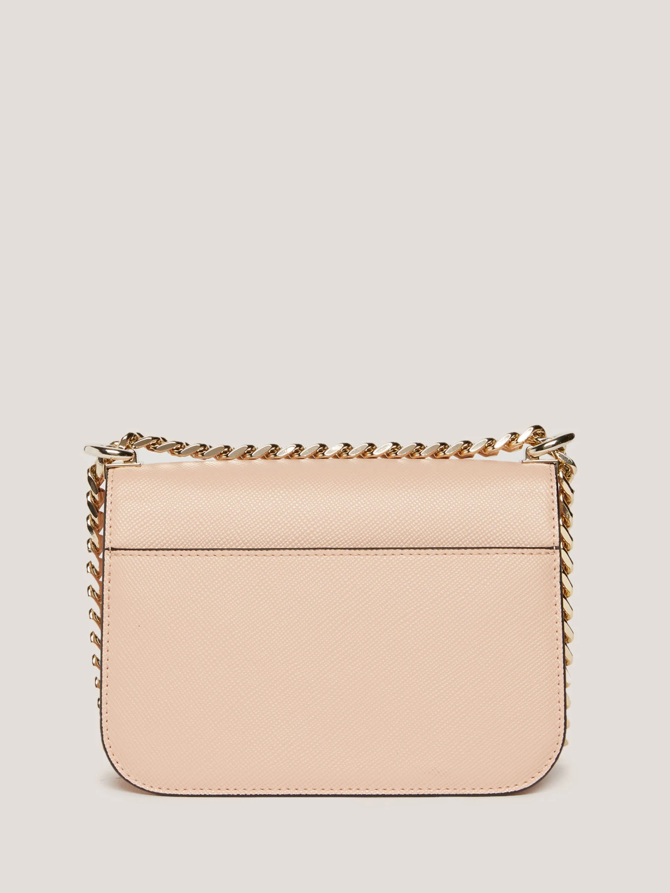 Mini City Bag in similpelle effetto saffiano; tracolla regolabile in catena metal diamantata, chiusura con nottolino Double Love, tasca interna; dimensioni: altezza 14 cm, larghezza 19 cm, ampiezza 7 cm.