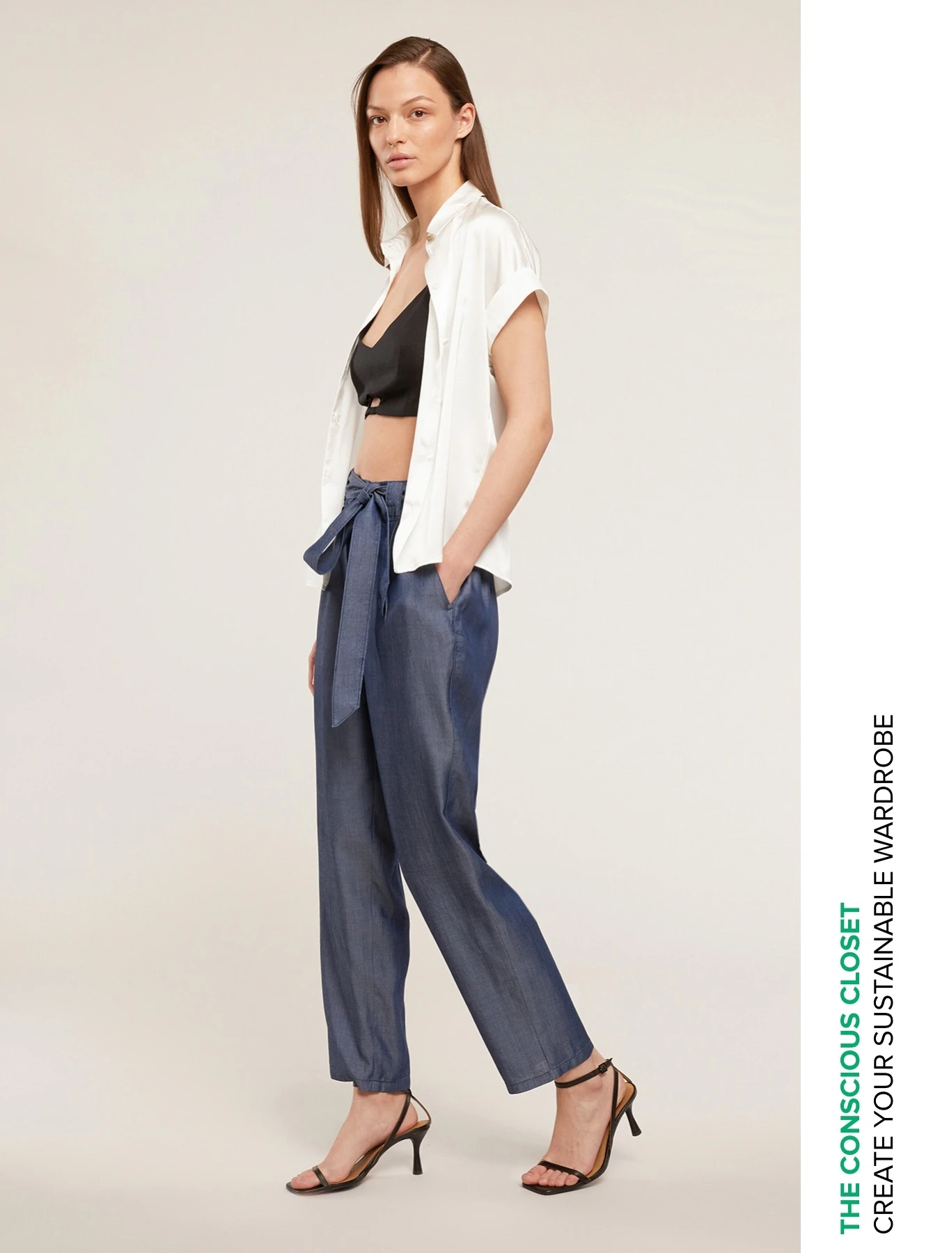 Pantaloni carrot in TENCEL™; vita con pieghe nella parte superiore e fusciacca da annodare; chiusura frontale con zip, tasche all’americana inserite nel fianco.; Le fibre di lyocell e modal a marchio TENCEL™ sono prodotte mediante processi ecologicamente responsabili dal legno, materia prima naturale proveniente da fonti sostenibili.
