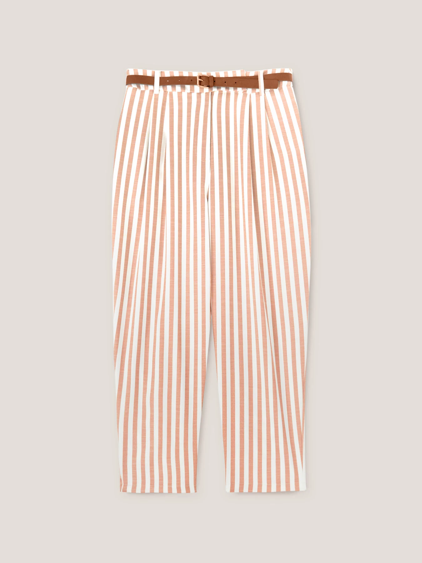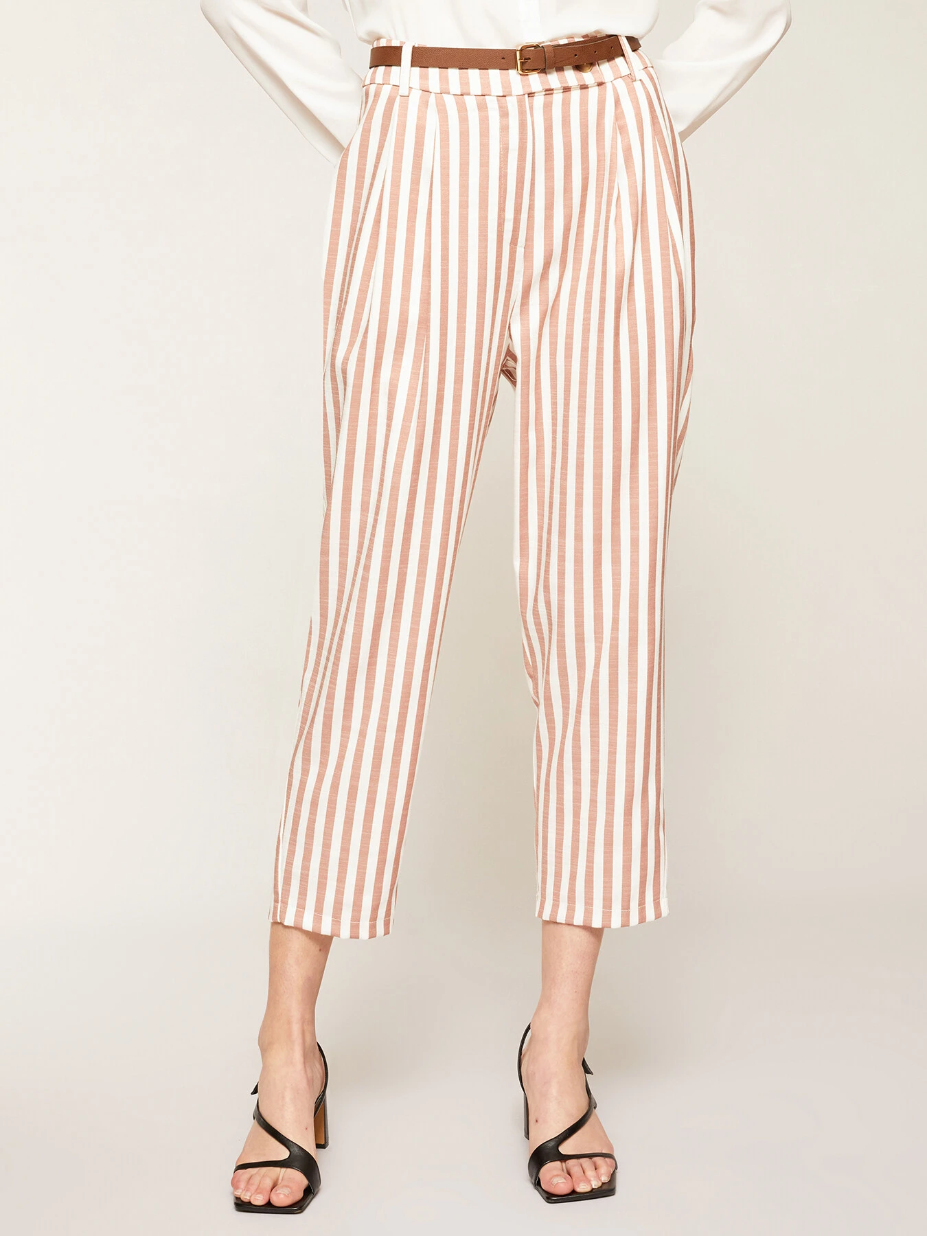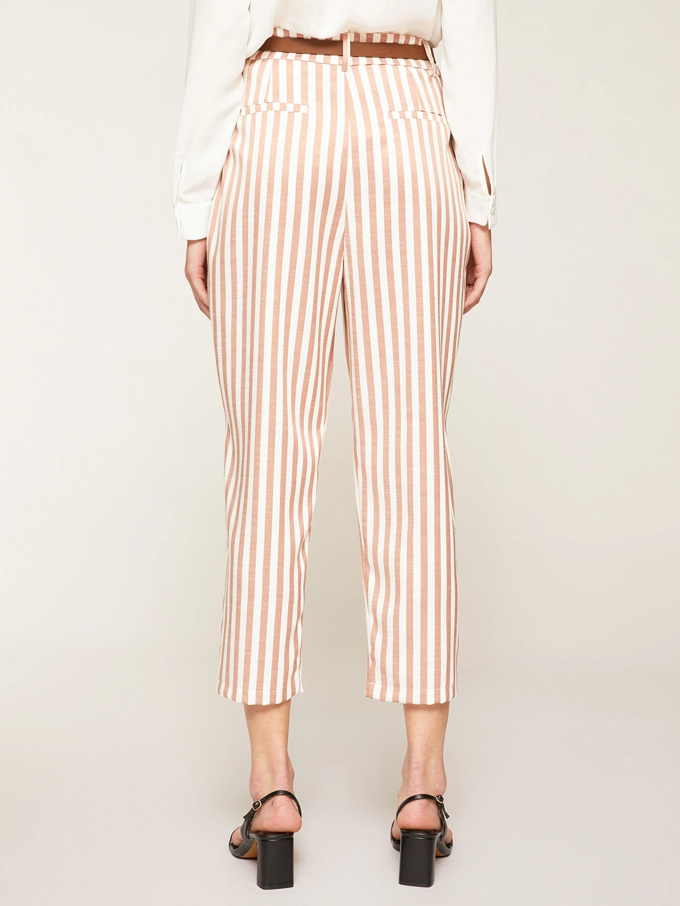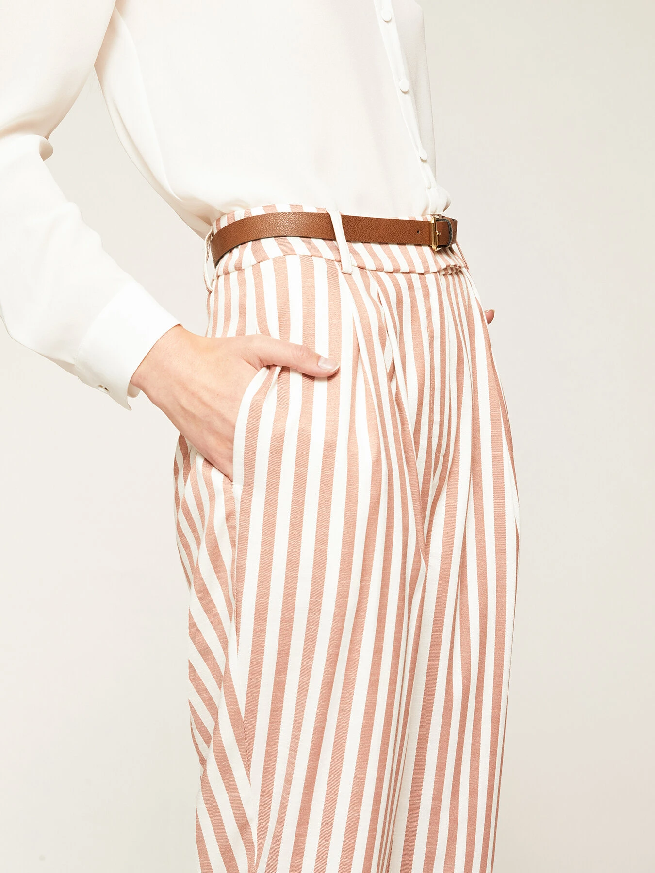 Pantaloni con pinces in tela misto viscosa fantasia a righe; chiusura sartoriale con doppio bottone e zip; tasche verticali inserite nel fianco, cinturino in similpelle in vita.