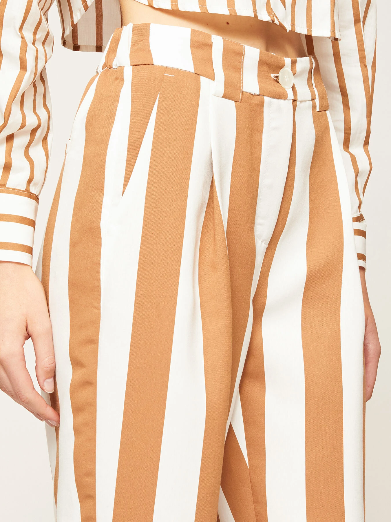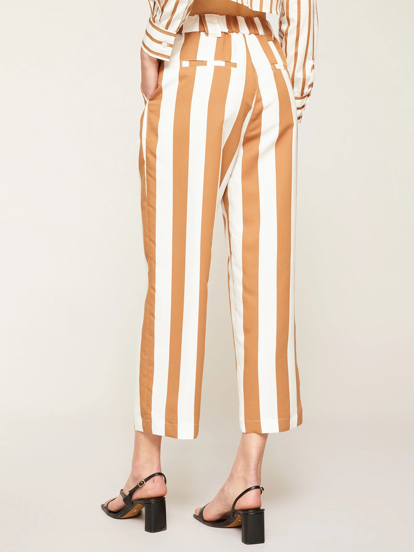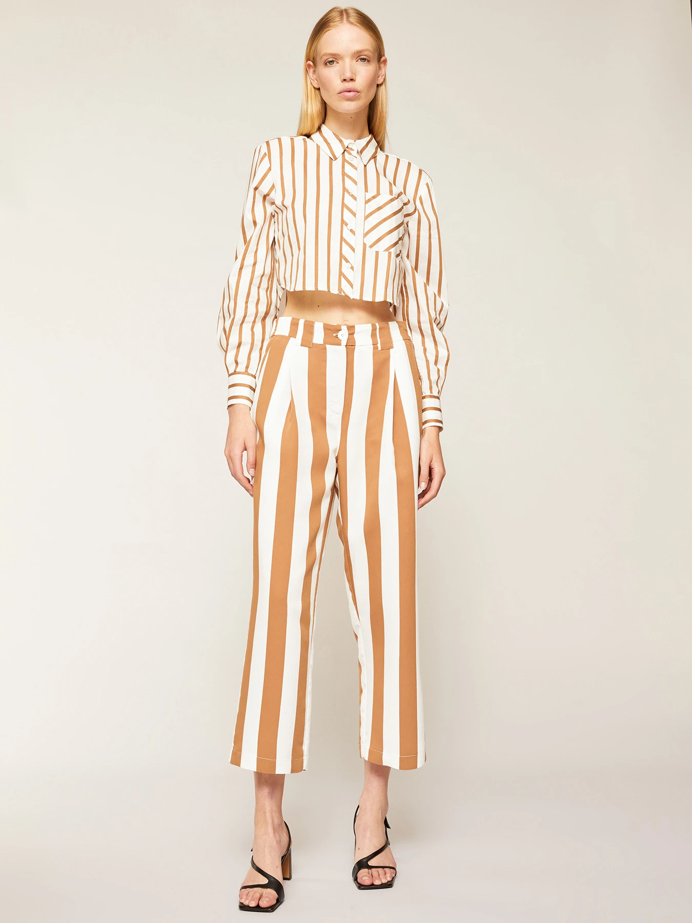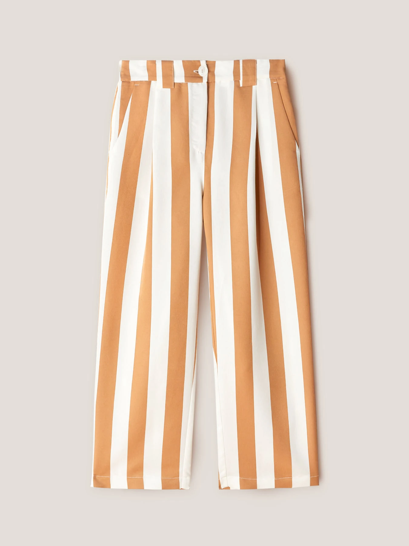 Pantaloni cropped in tessuto tinto filo fantasia maxi riga; vita alta con chiusura frontale a bottone e zip, elastico interno nella parte posteriore; tasche all’americana inserite nel fianco.
