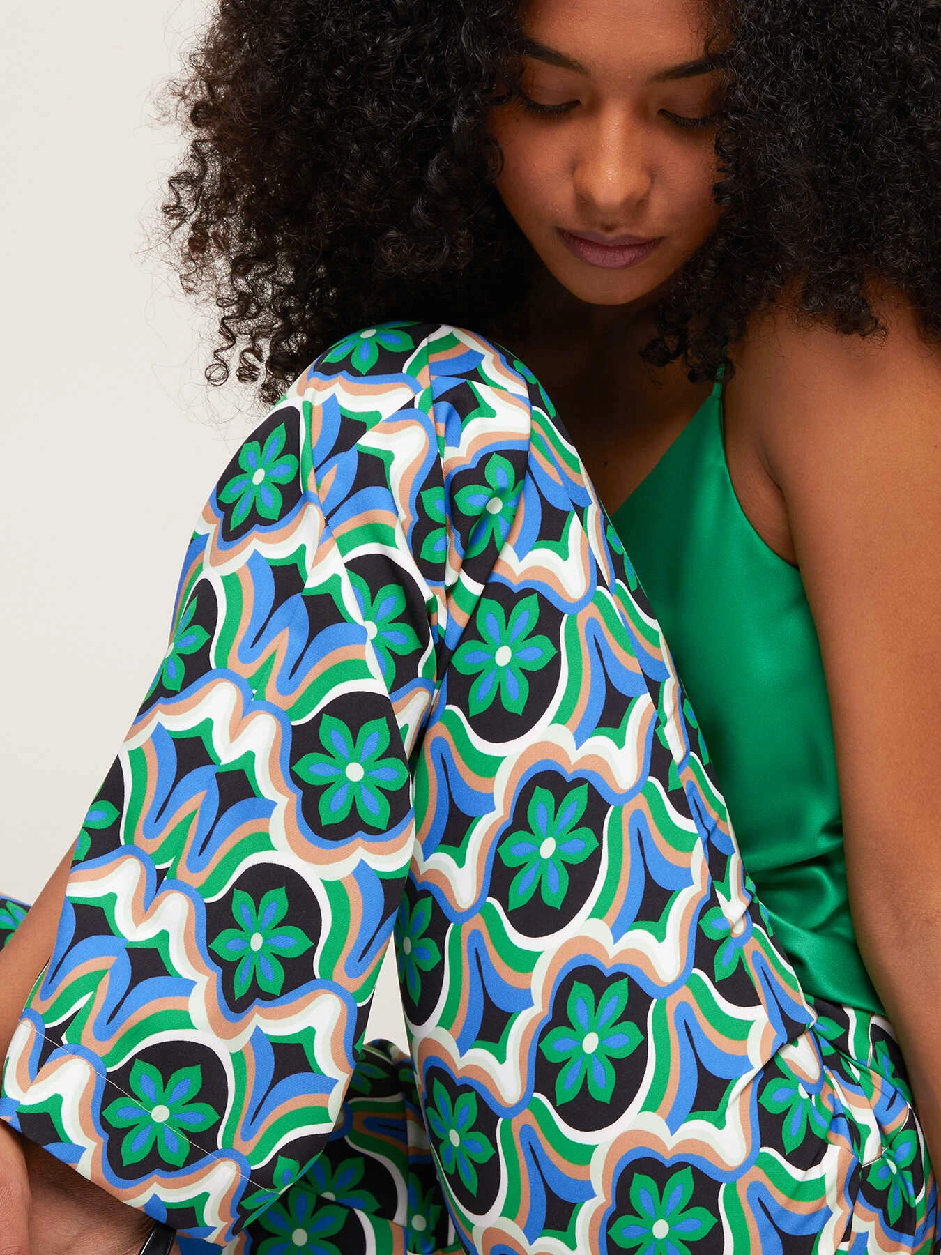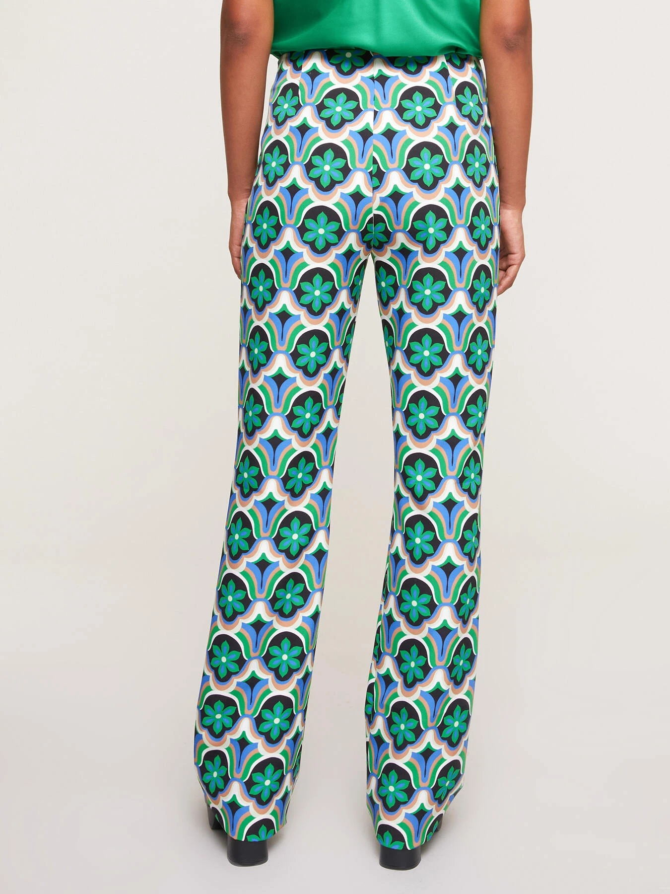 Pantaloni flare fantasia mattonella; modello senza tasche; chiusura laterale con zip.