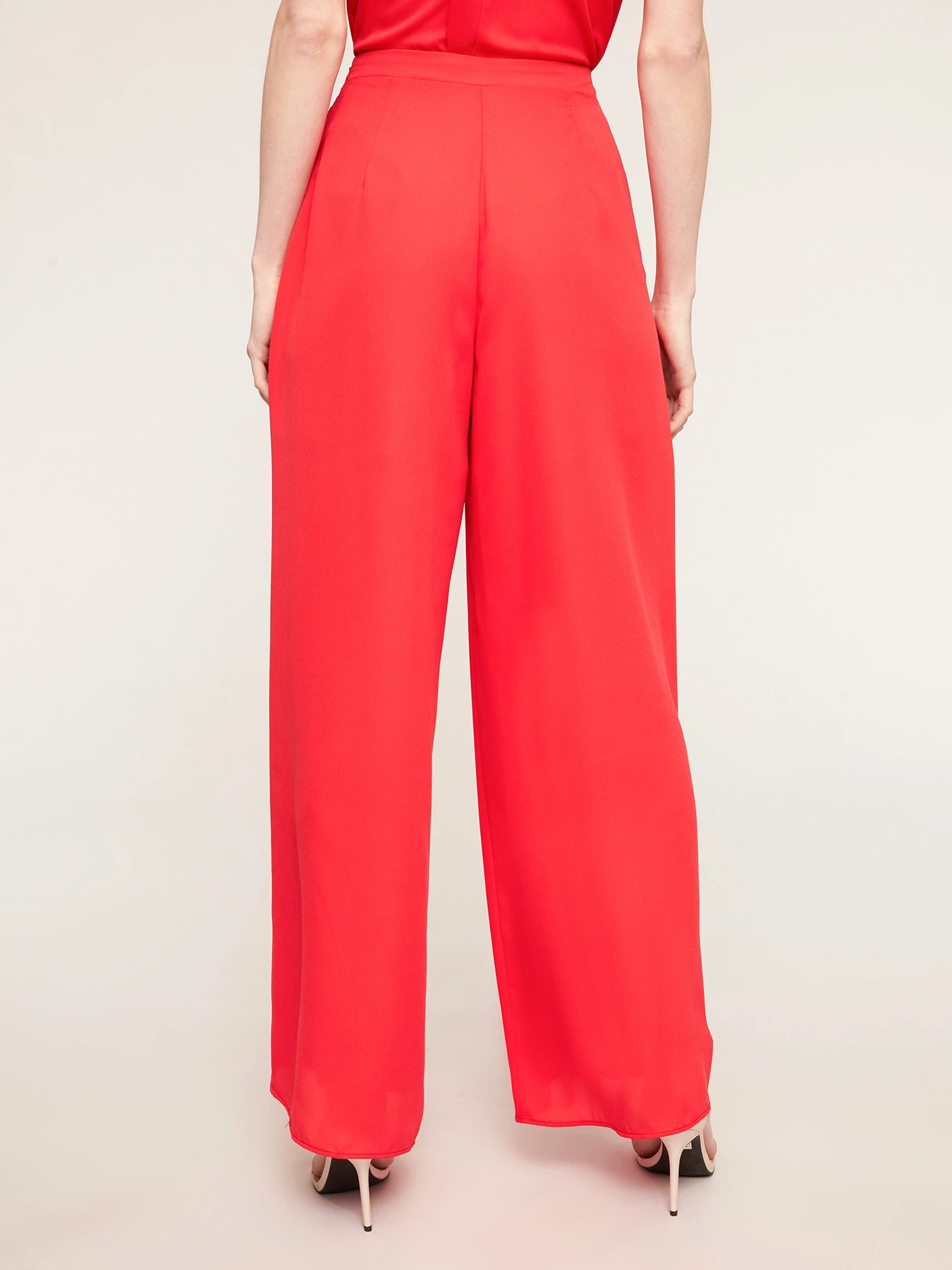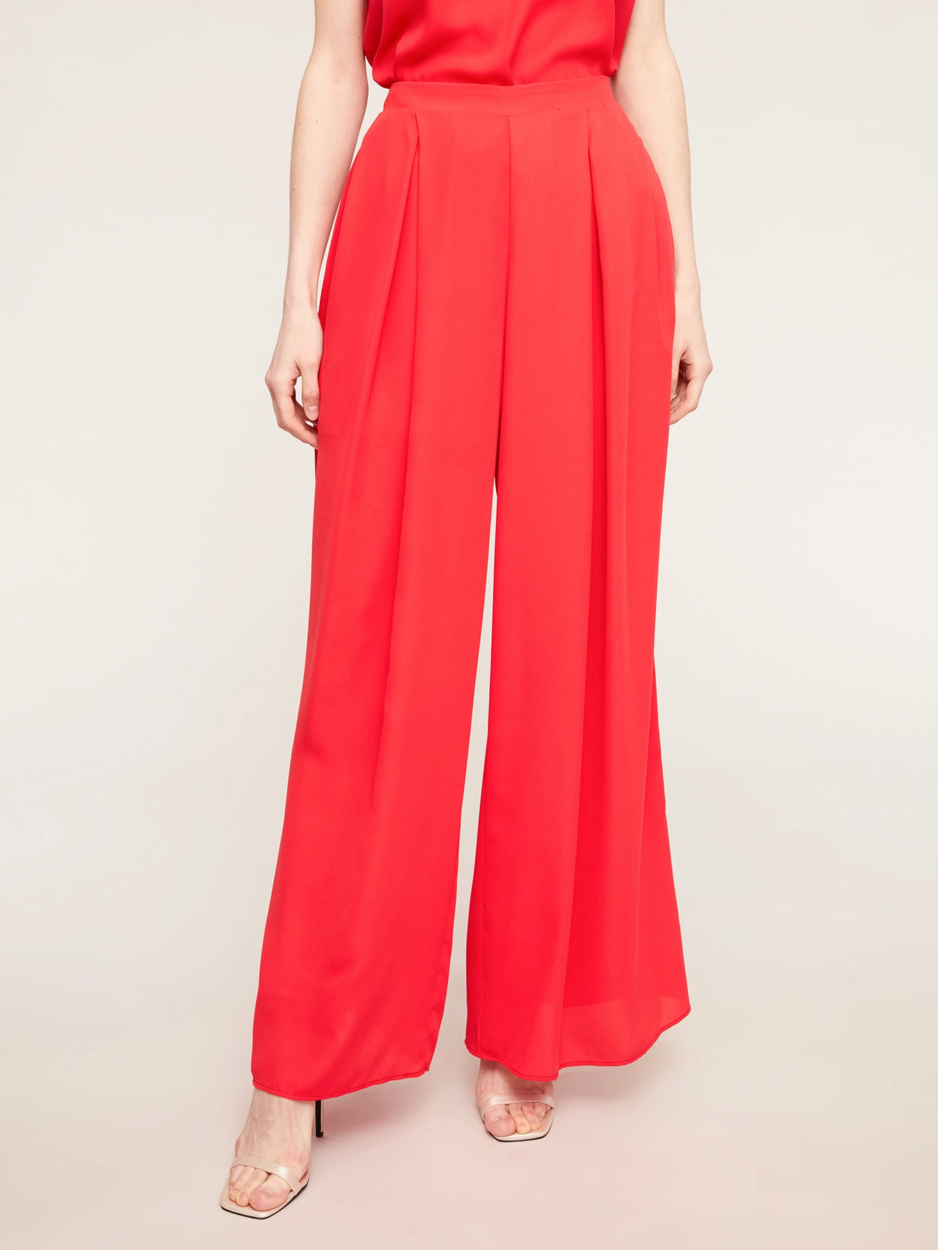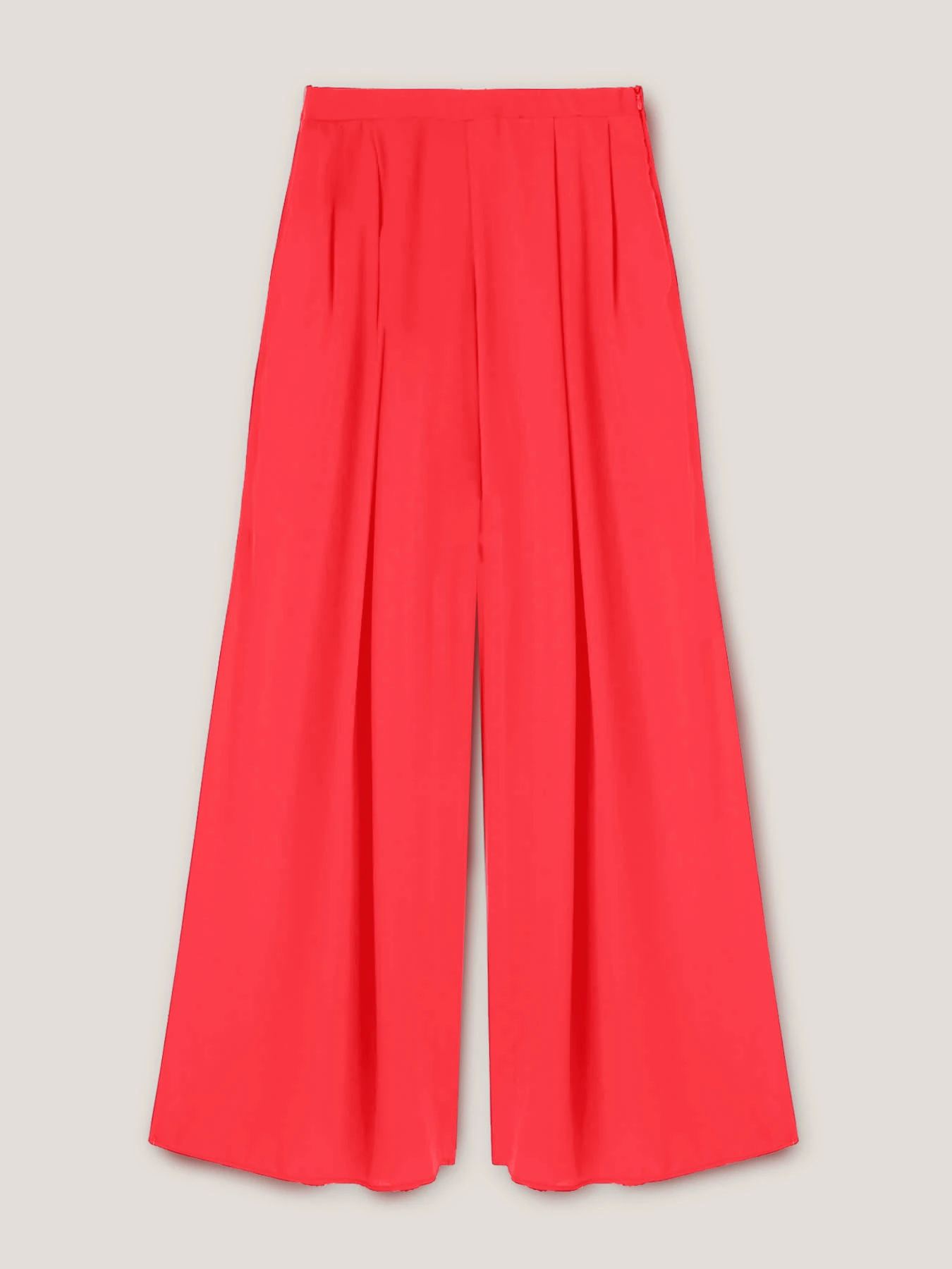 Pantaloni fluidi palazzo in doppia georgette; modello a vita alta con piega a soffietto nella parte superiore; tasche verticali nel fianco, chiusura laterale con zip invisibile.