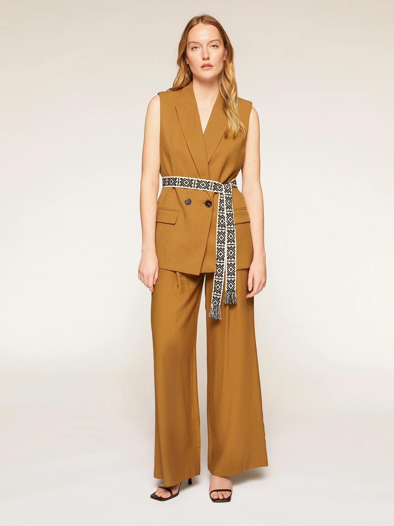 Pantaloni gamba larga in raso debacato misto viscosa; vita alta e chiusura con bottone e zip; pieghe nella parte superiore, tasche verticali inserite nel fianco.