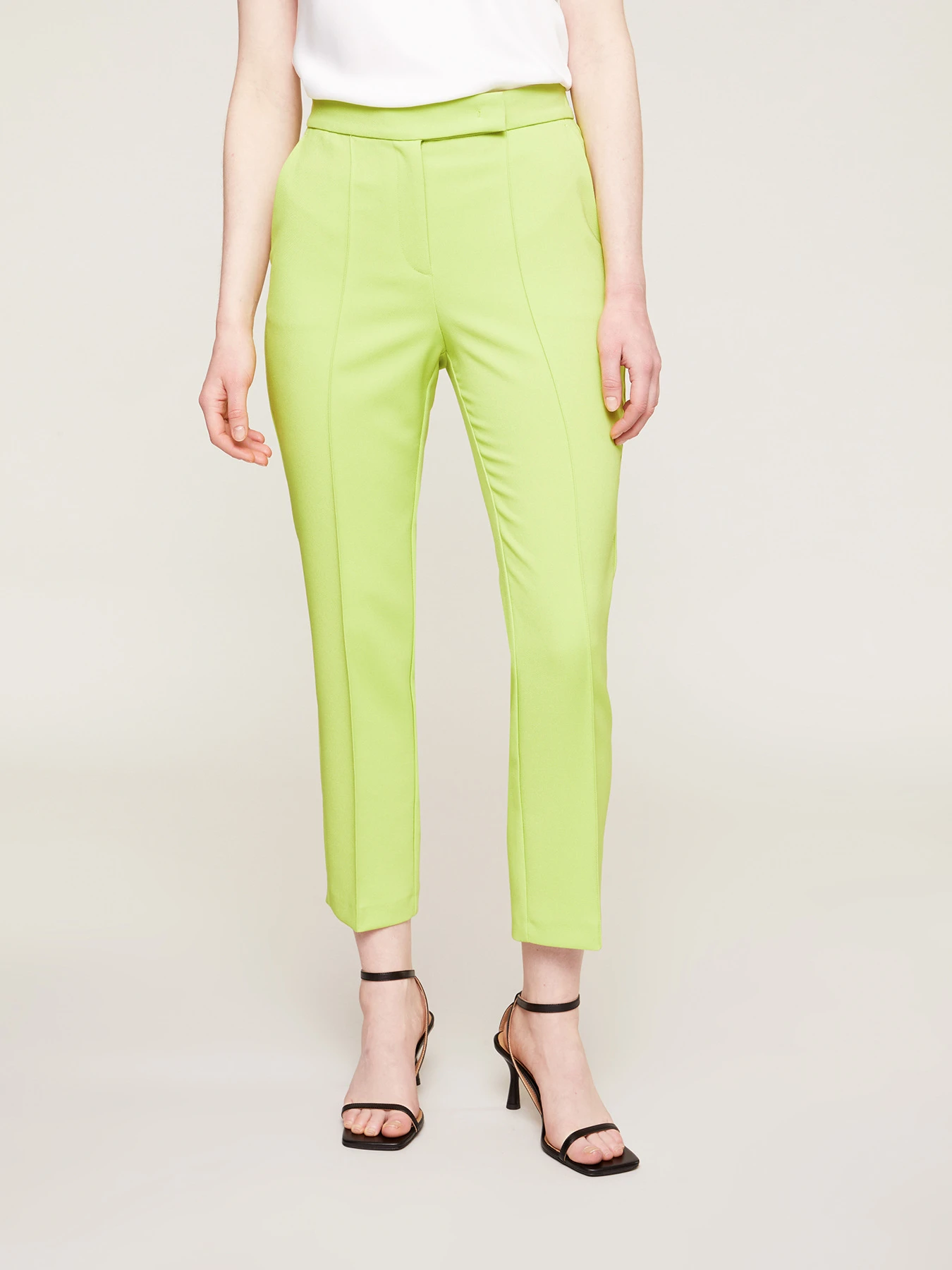 Pantaloni regular in tessuto a trama diagonale tinta unita; chiusura frontale con chiusura sartoriale; tasche all’americana, piega stirata nel centro gamba.
