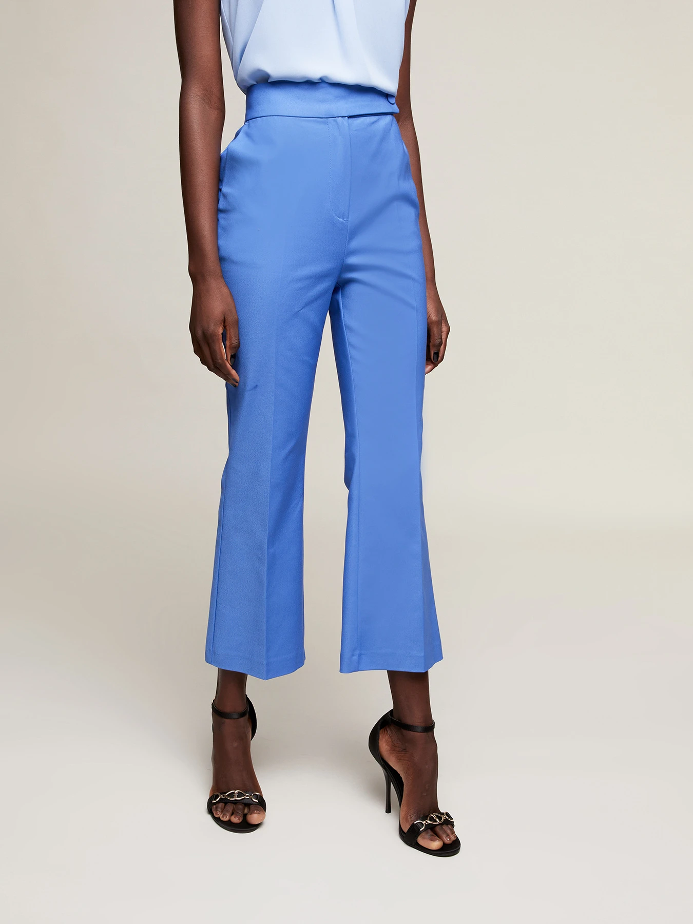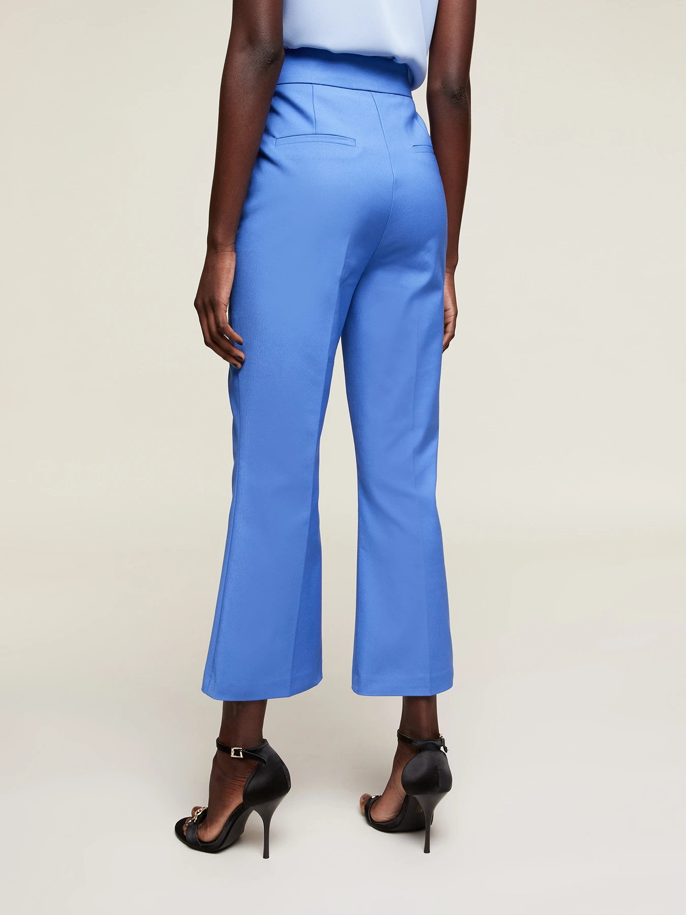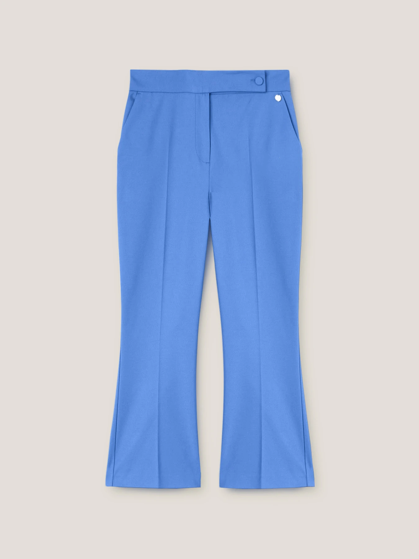 Pantaloni kick flare in tessuto tecnico misto cotone; chiusura frontale con chiusura sartoriale, tasche all’americana inserite nel fianco; piega stirata nel centro gamba, tasche a filetto posteriori.