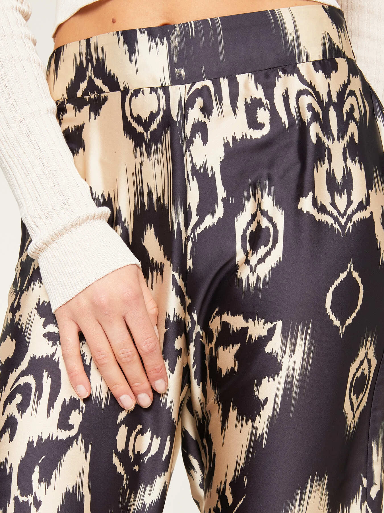 Pantaloni fluidi in raso fantasia etnica; vita elastica; gamba palazzo.