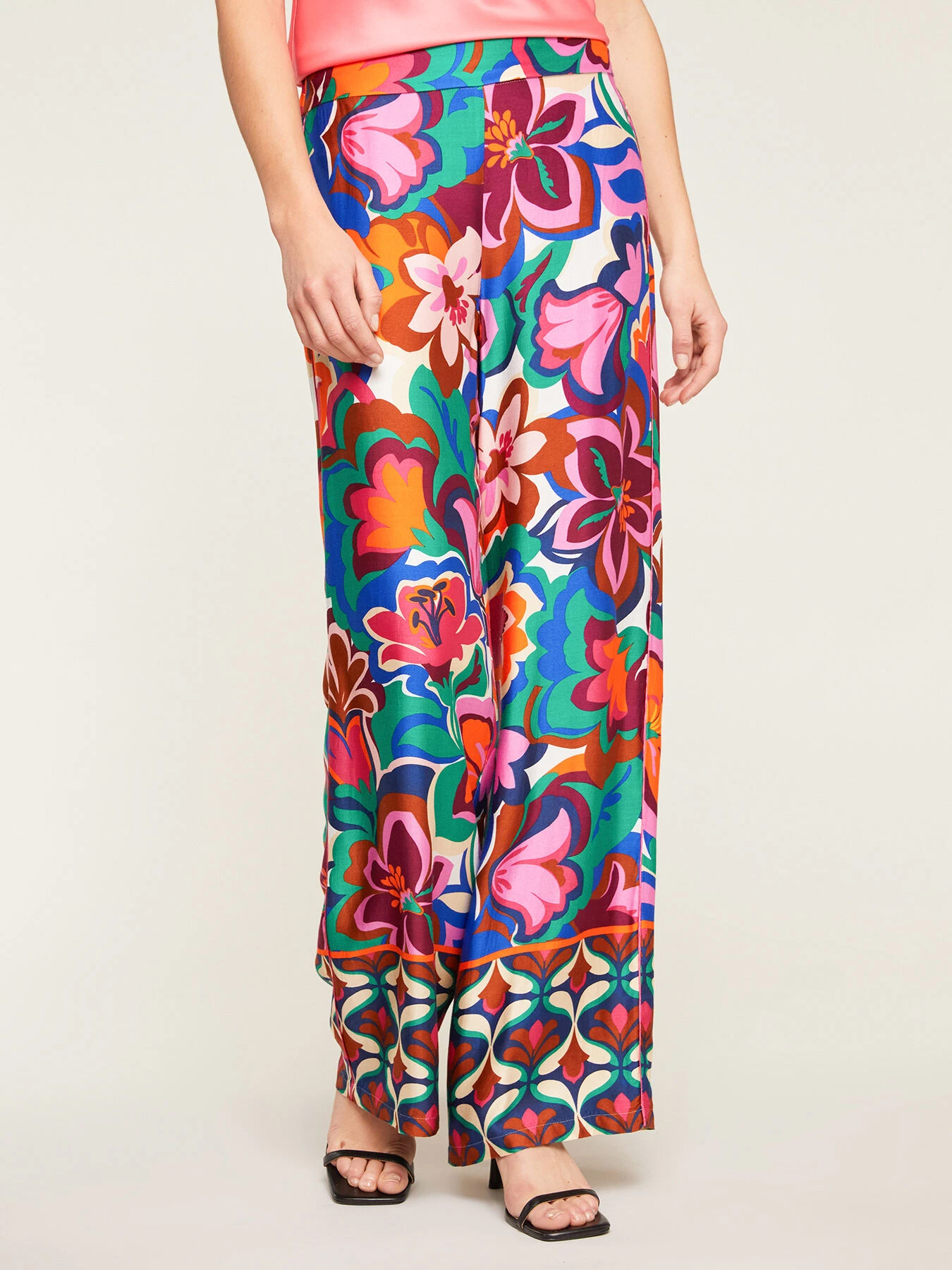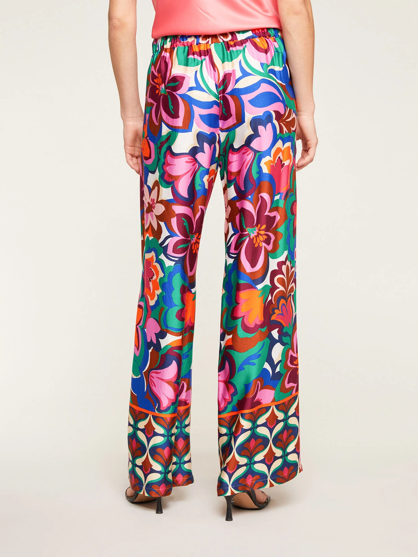Pantaloni fluidi in raso fantasia floreale; vita elastica; gamba palazzo.