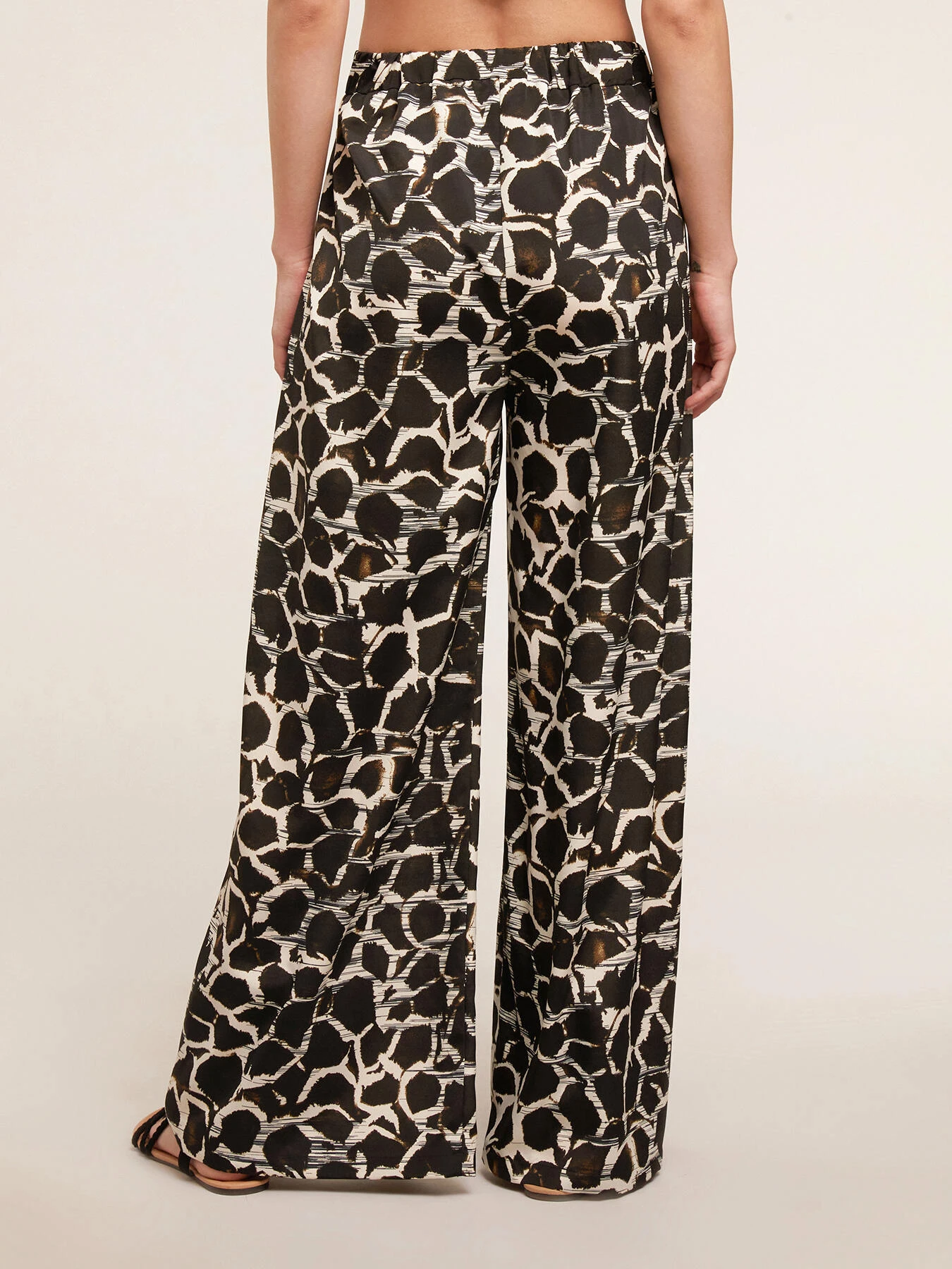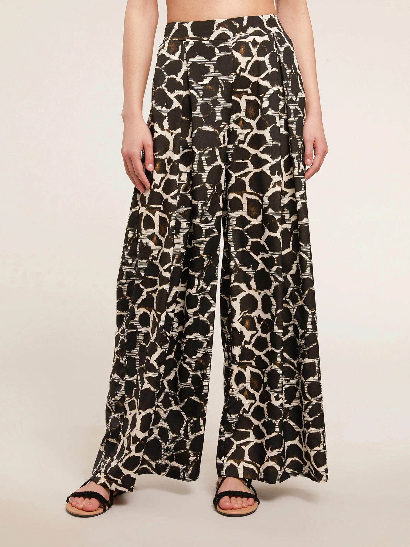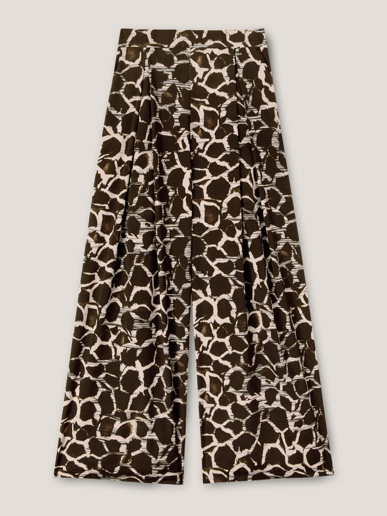 Pantaloni palazzo in raso fantasia etnica; pieghe nella parte superiore, tasche anteriori inserite nel fianco; vita con elastico inserito nella parte posteriore, zip laterale.