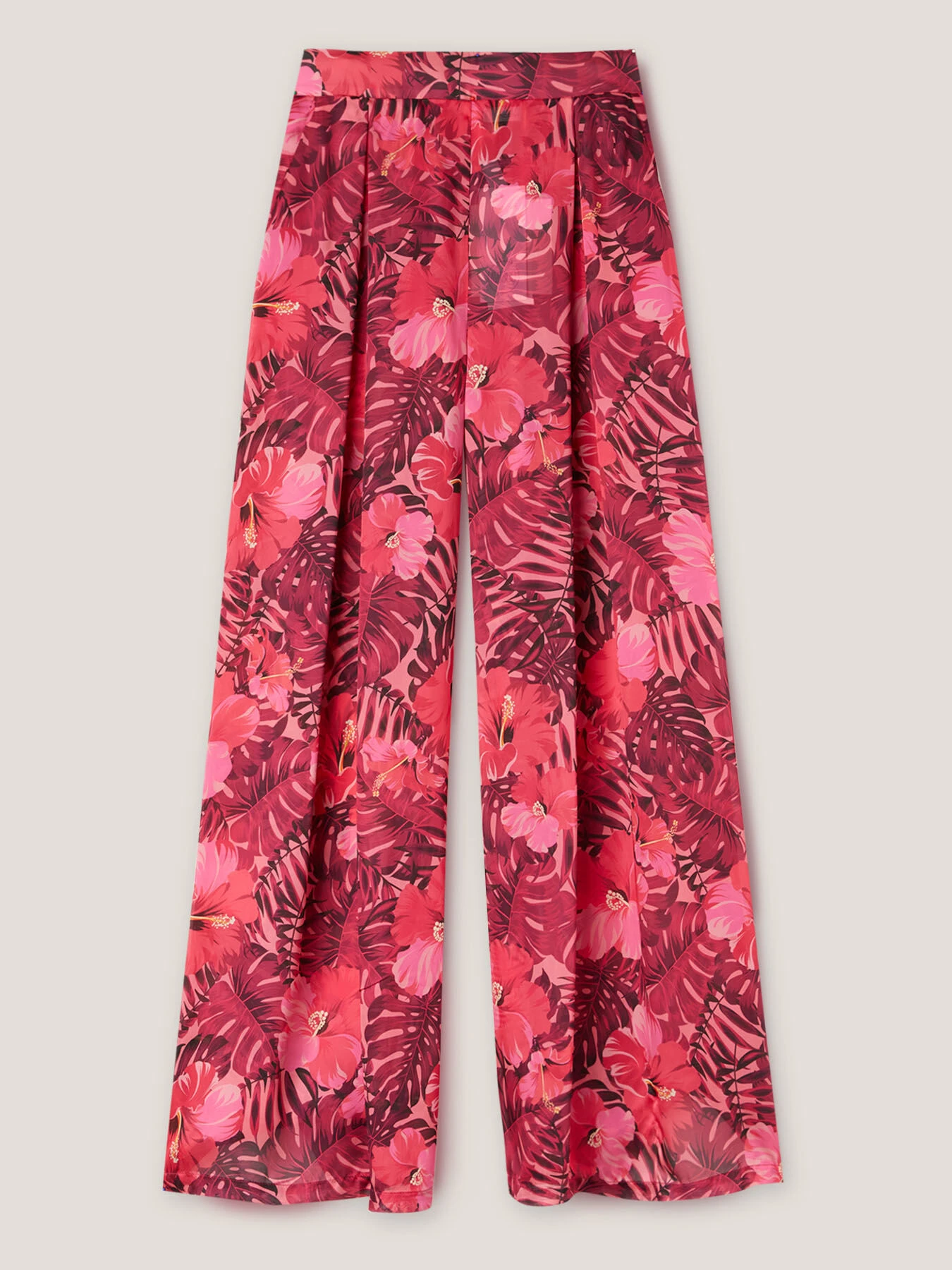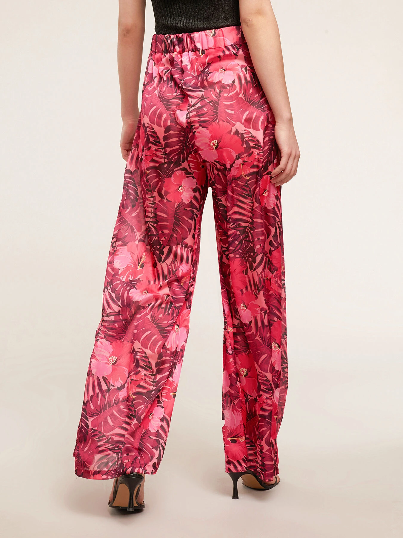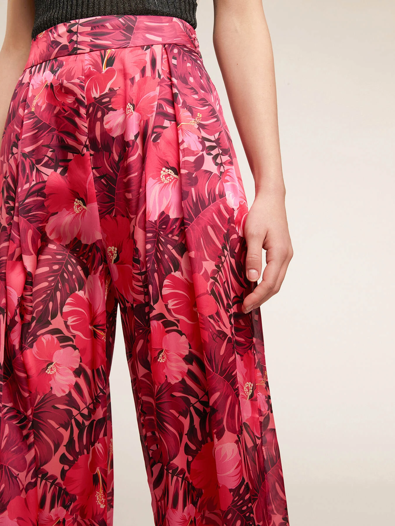 Pantaloni palazzo in raso fantasia floreale; pieghe nella parte superiore, tasche anteriori inserite nel fianco; vita con elastico inserito nella parte posteriore, zip laterale.