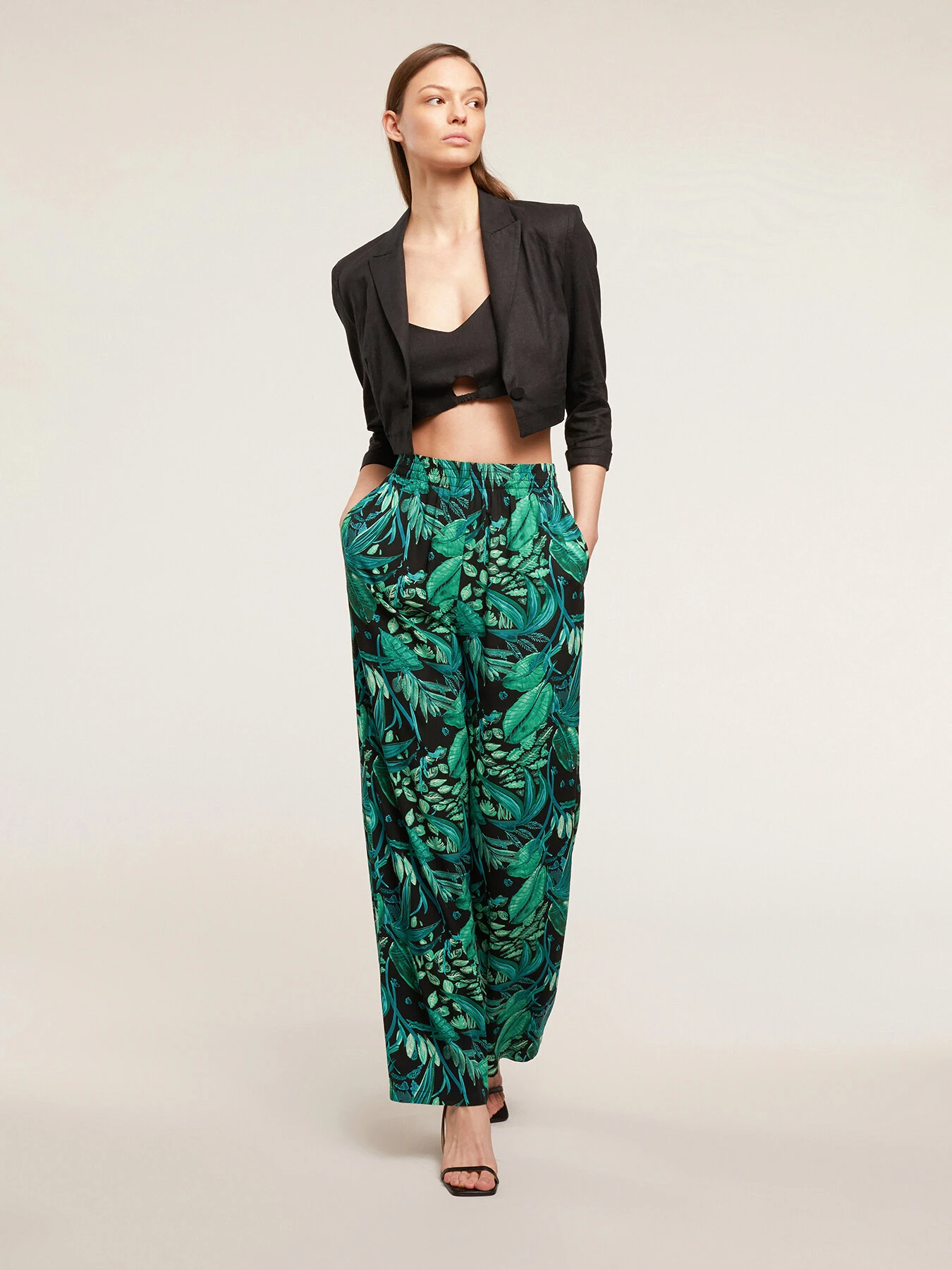 Pantaloni palazzo in tessuto fluido di viscosa fantasia jungle; vita stretch con impunture elastiche; tasche verticali inserite nel fianco.