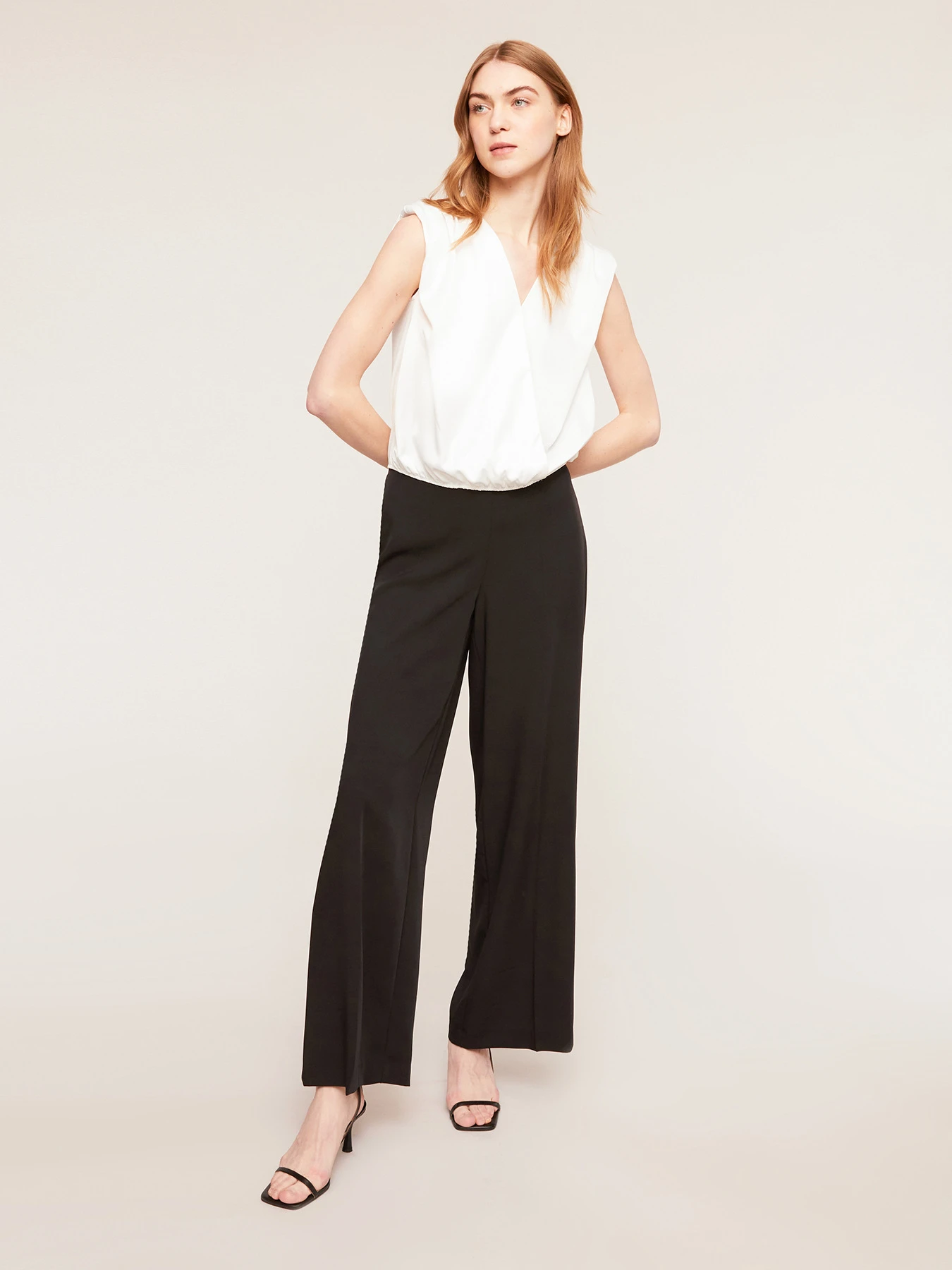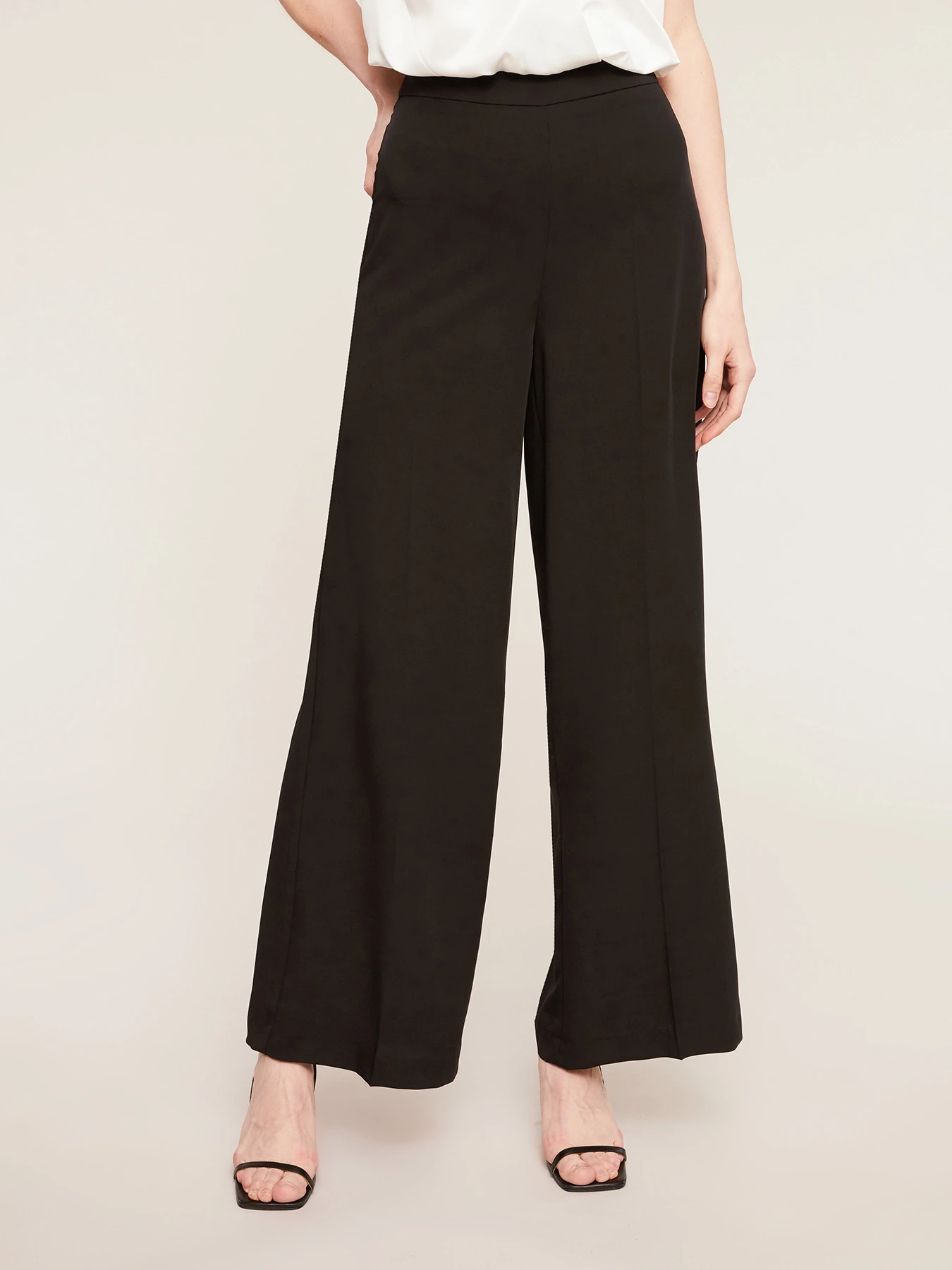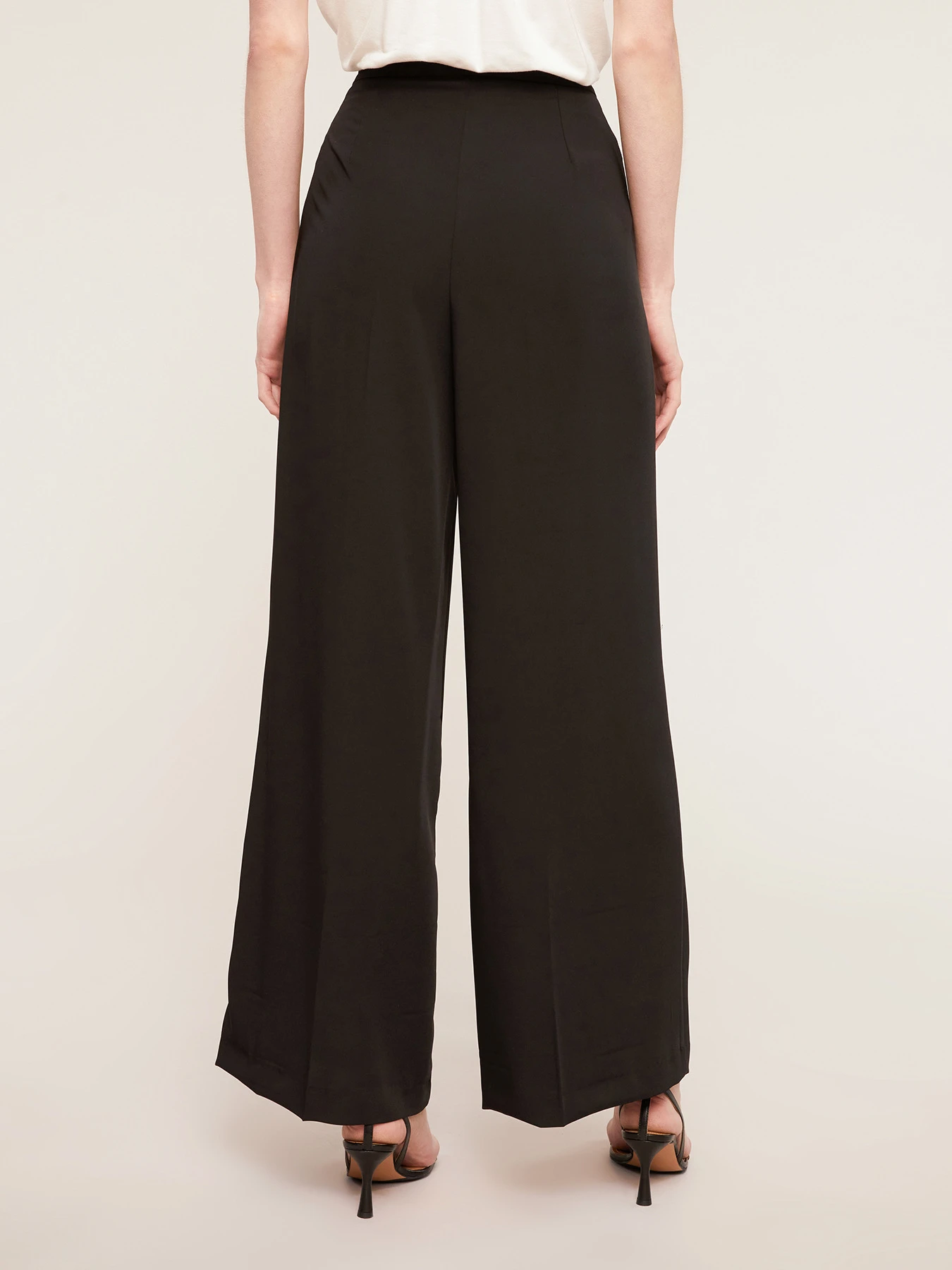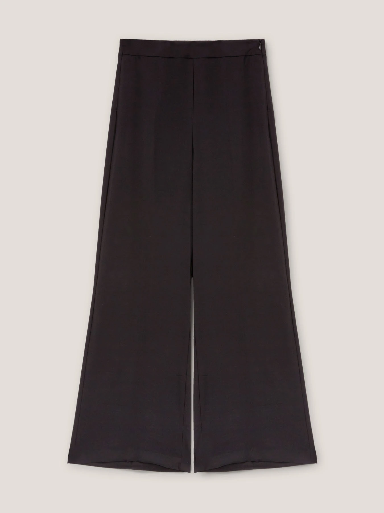 Pantaloni palazzo fluidi; piega stirata nel centro gamba; chiusura laterale con zip invisibile.