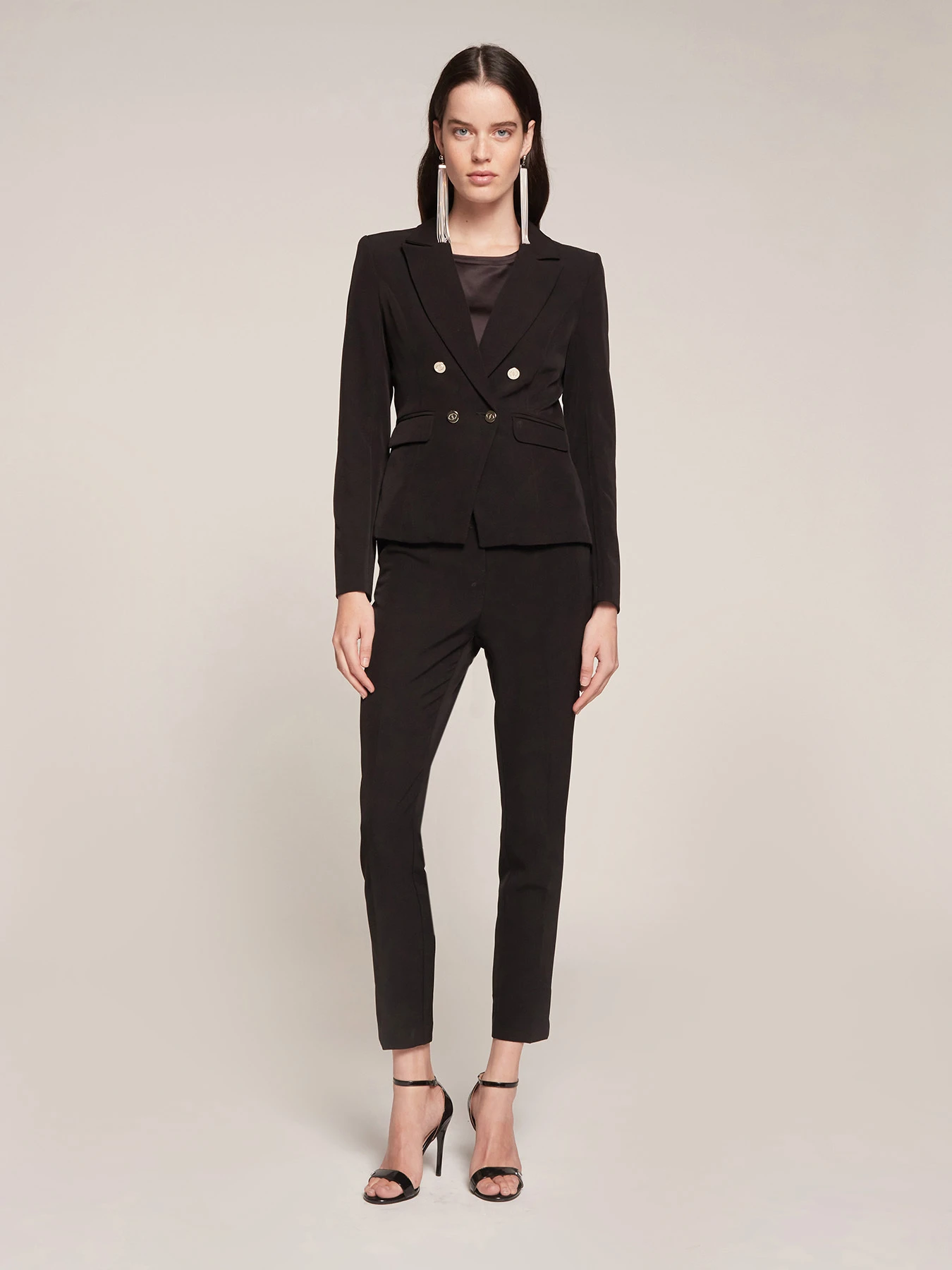 Pantaloni in tessuto tecnico bistretch con mano crêpe; gamba regular con piega stirata nel centro, tasche sul fianco; apertura frontale con chiusura sartoriale con zip e gancetto; cintura interna foderata, tasche a filetto sul dietro.