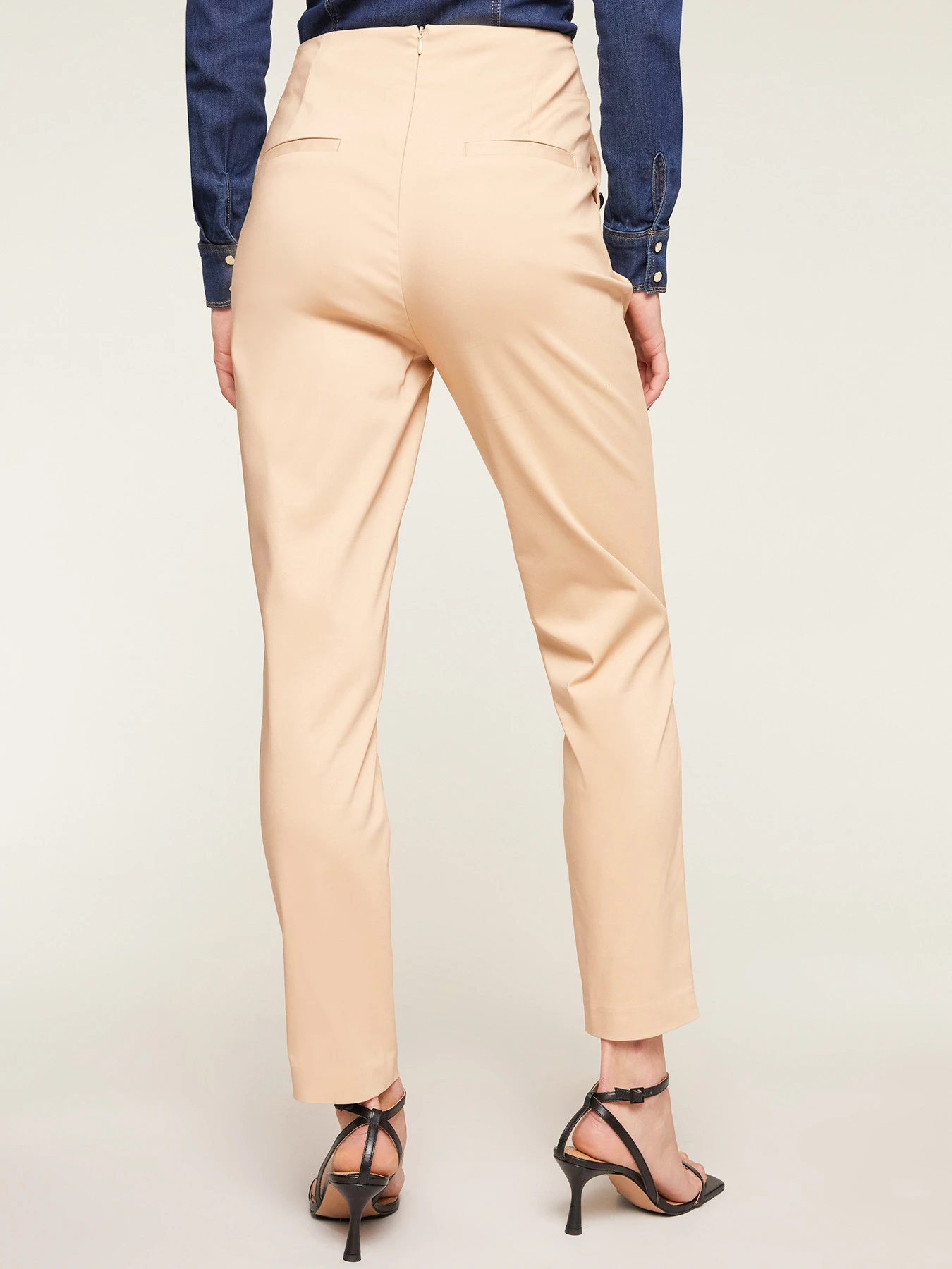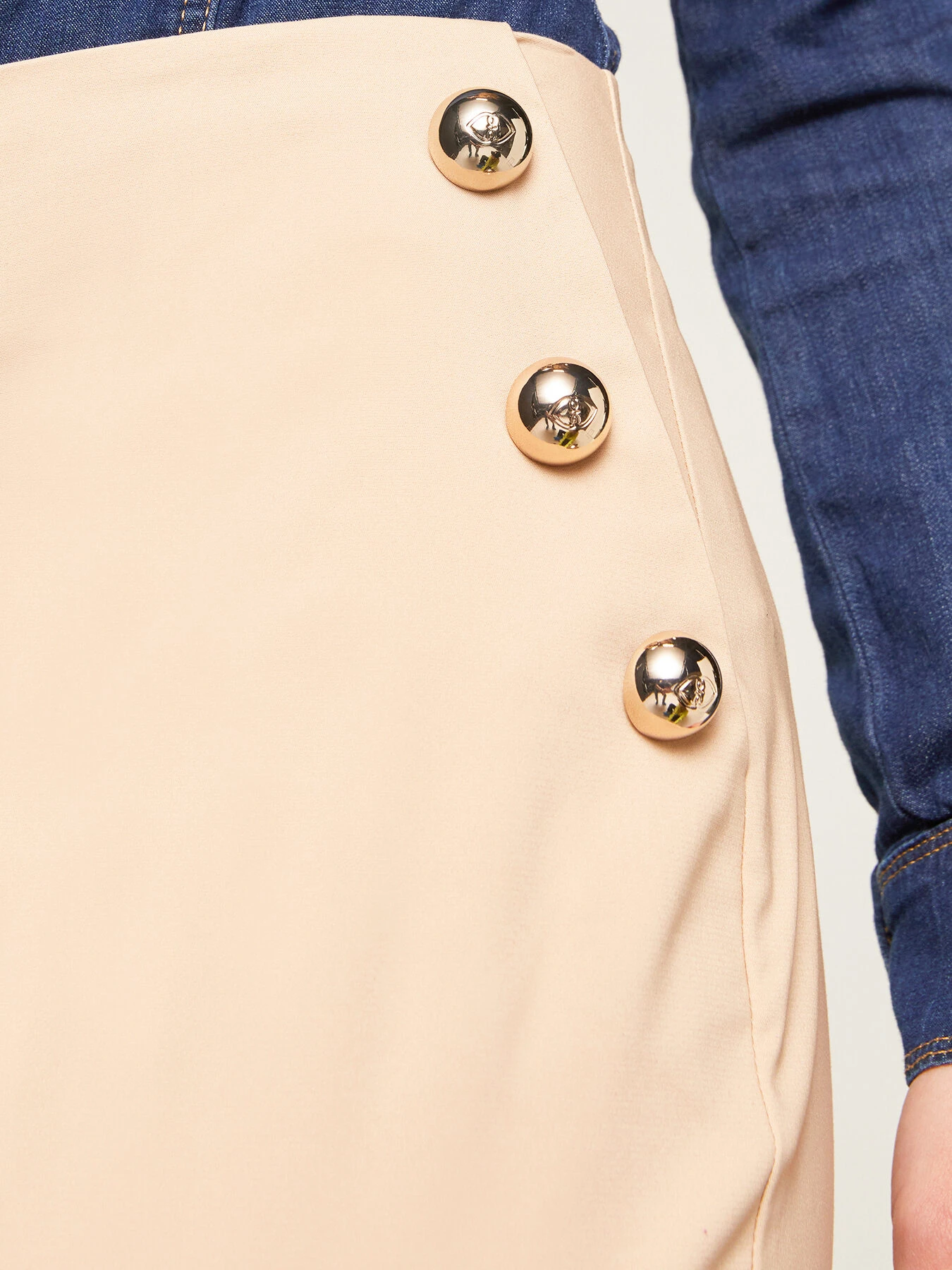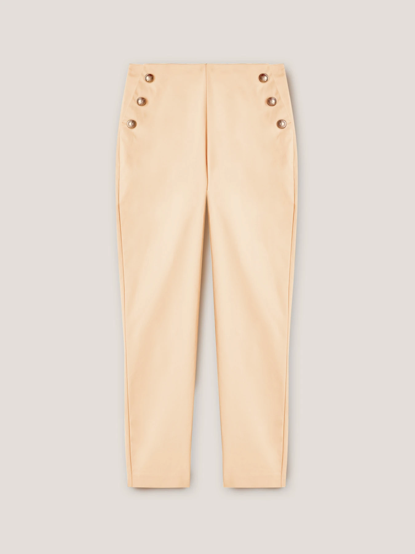 Pantaloni skinny in tessuto tecnico tinta unita; vita alta con chiusura con zip posteriore; tasche all’americana finte con motivo laterale di bottoni.