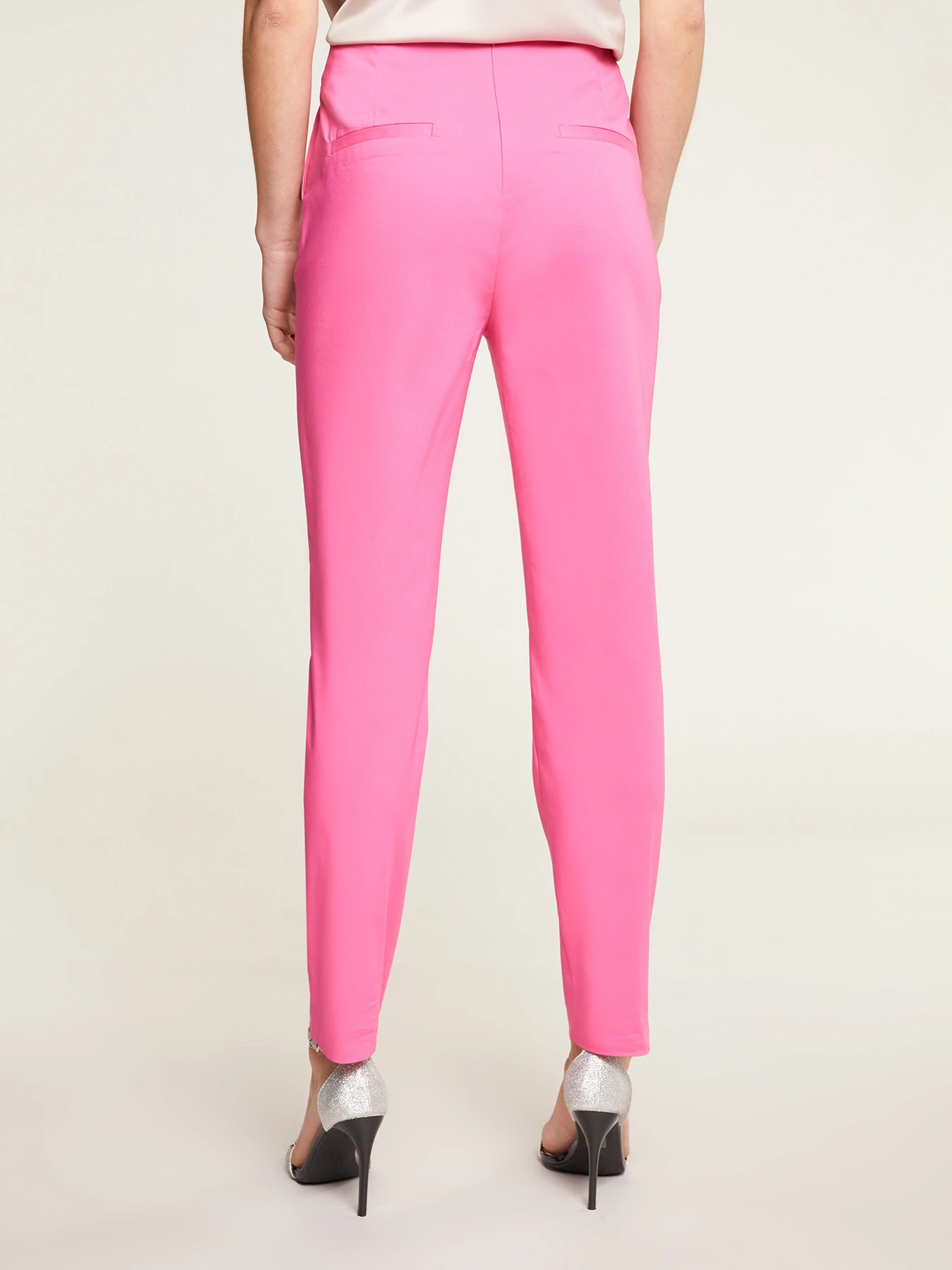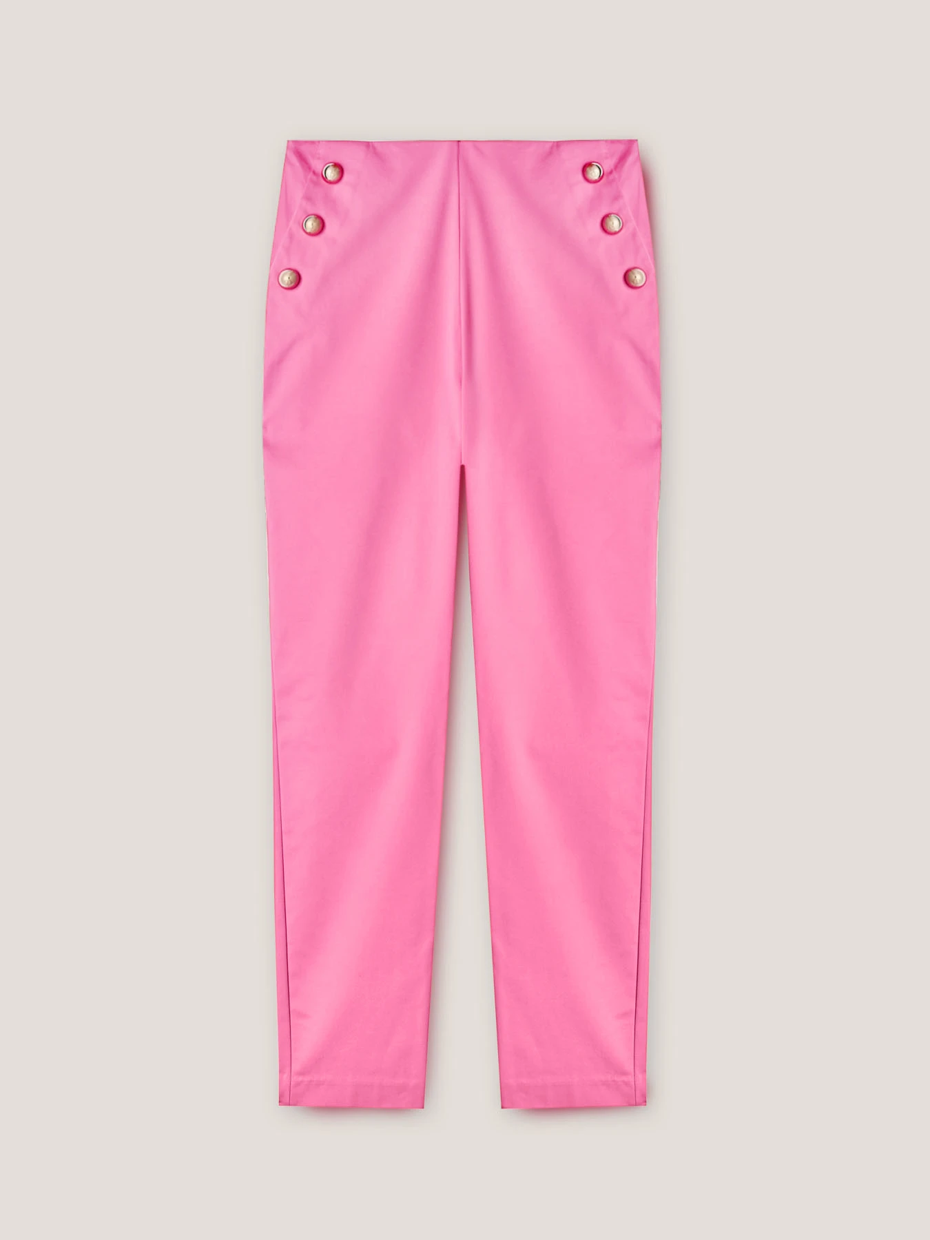 Pantaloni skinny in tessuto tecnico tinta unita; vita alta con chiusura con zip posteriore; tasche all’americana finte con motivo laterale di bottoni.