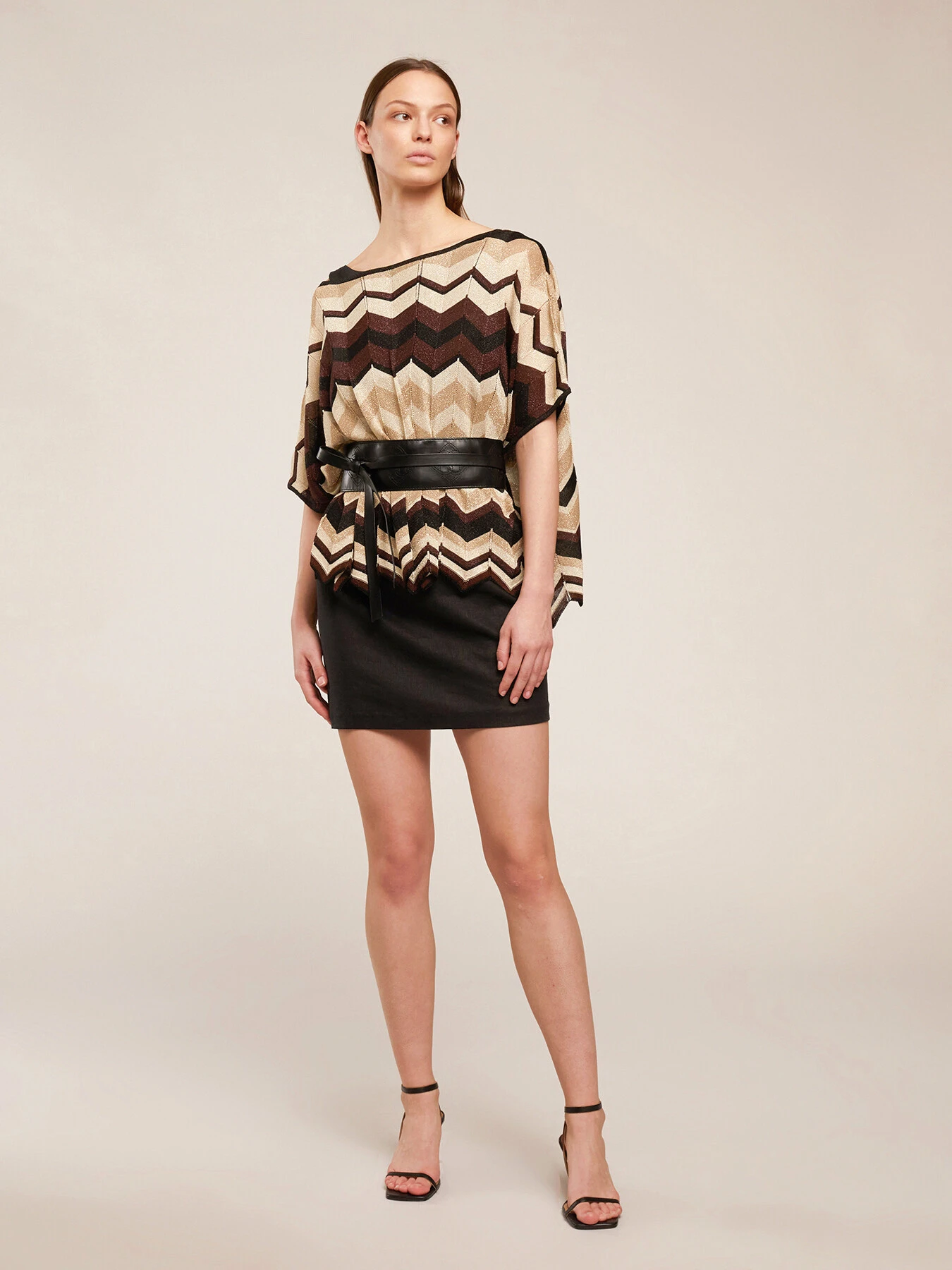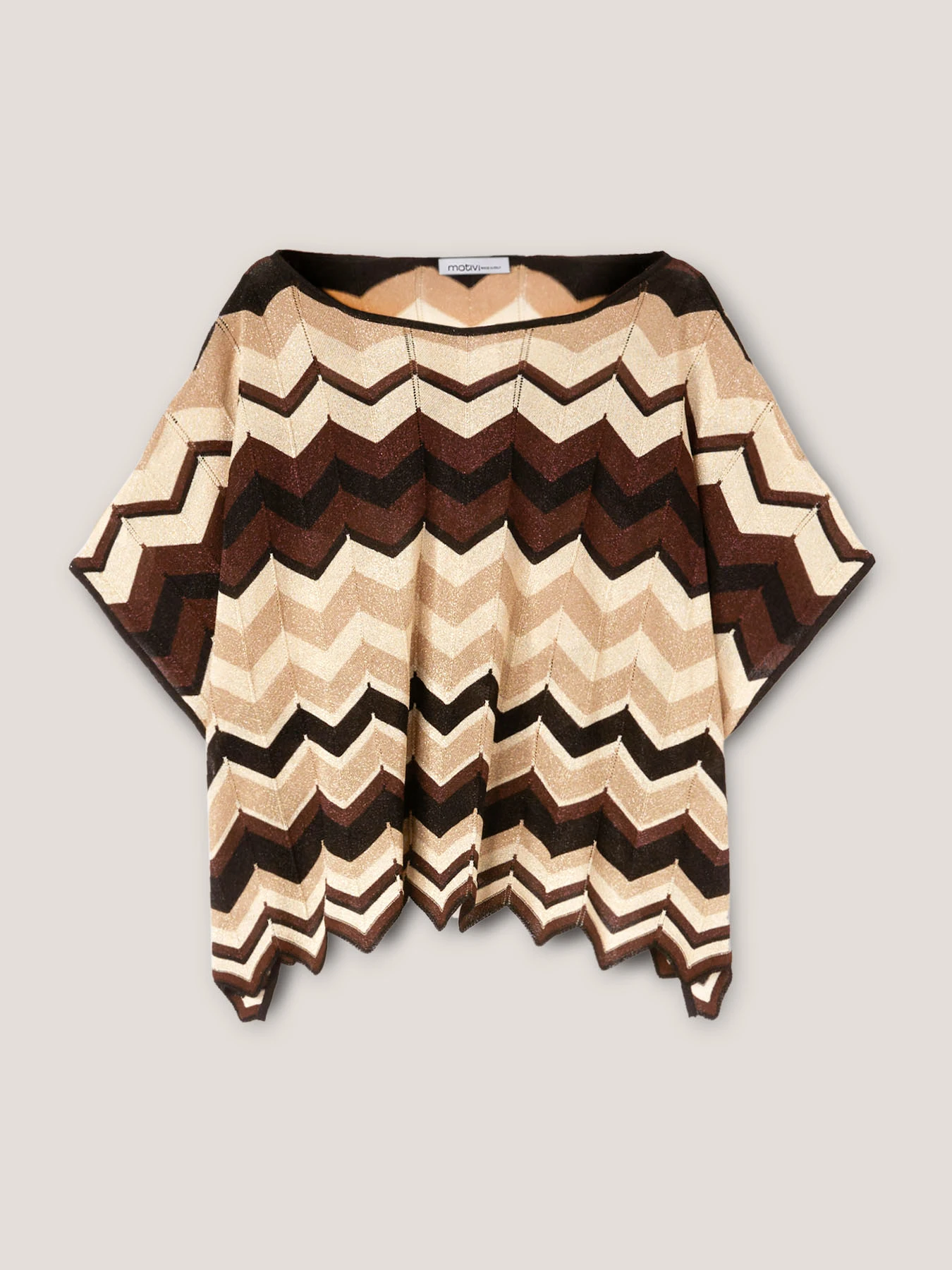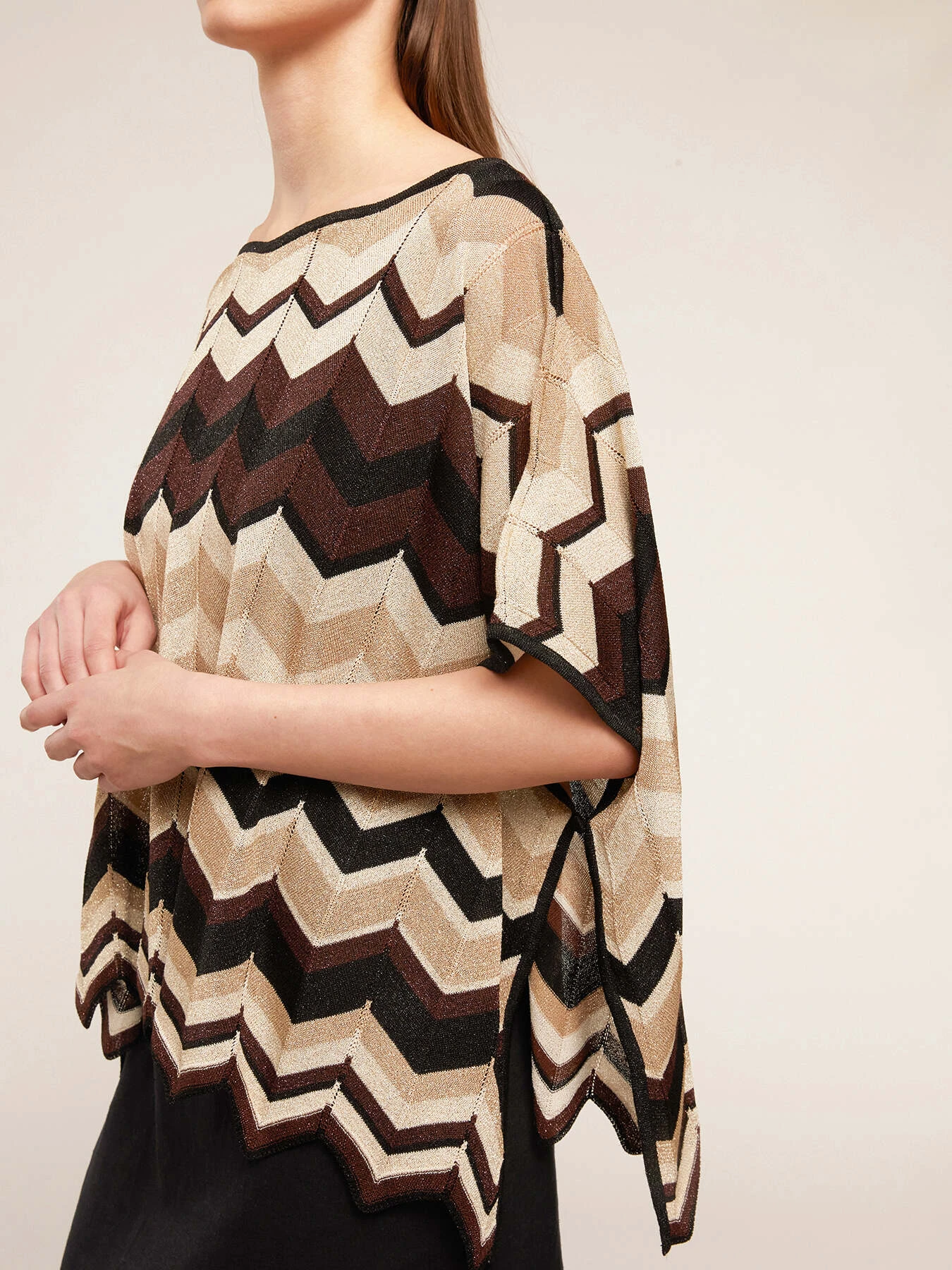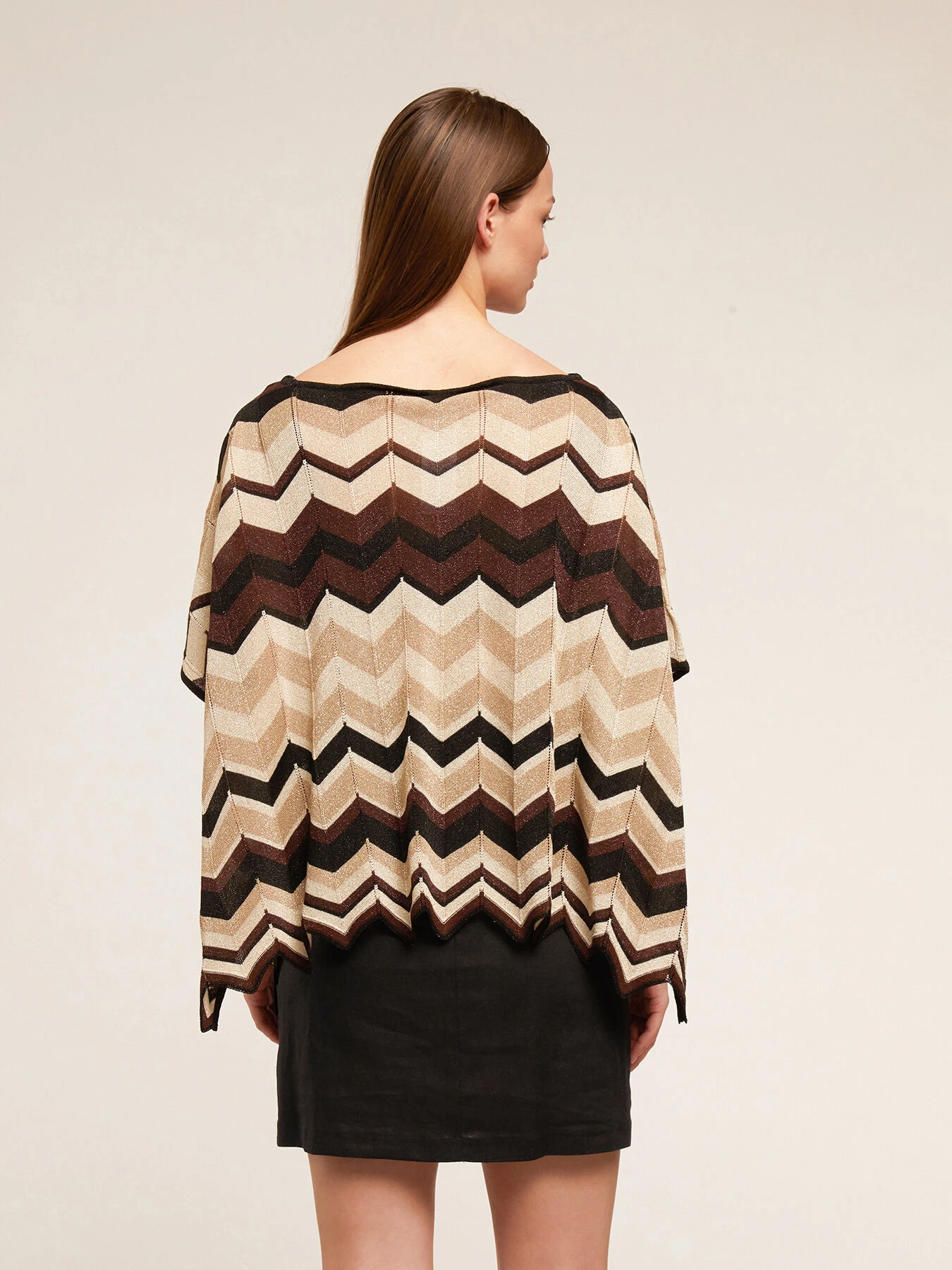 Poncho in maglia lurex fantasia chevron; ampio scollo a barca; maniche a kimono corte.