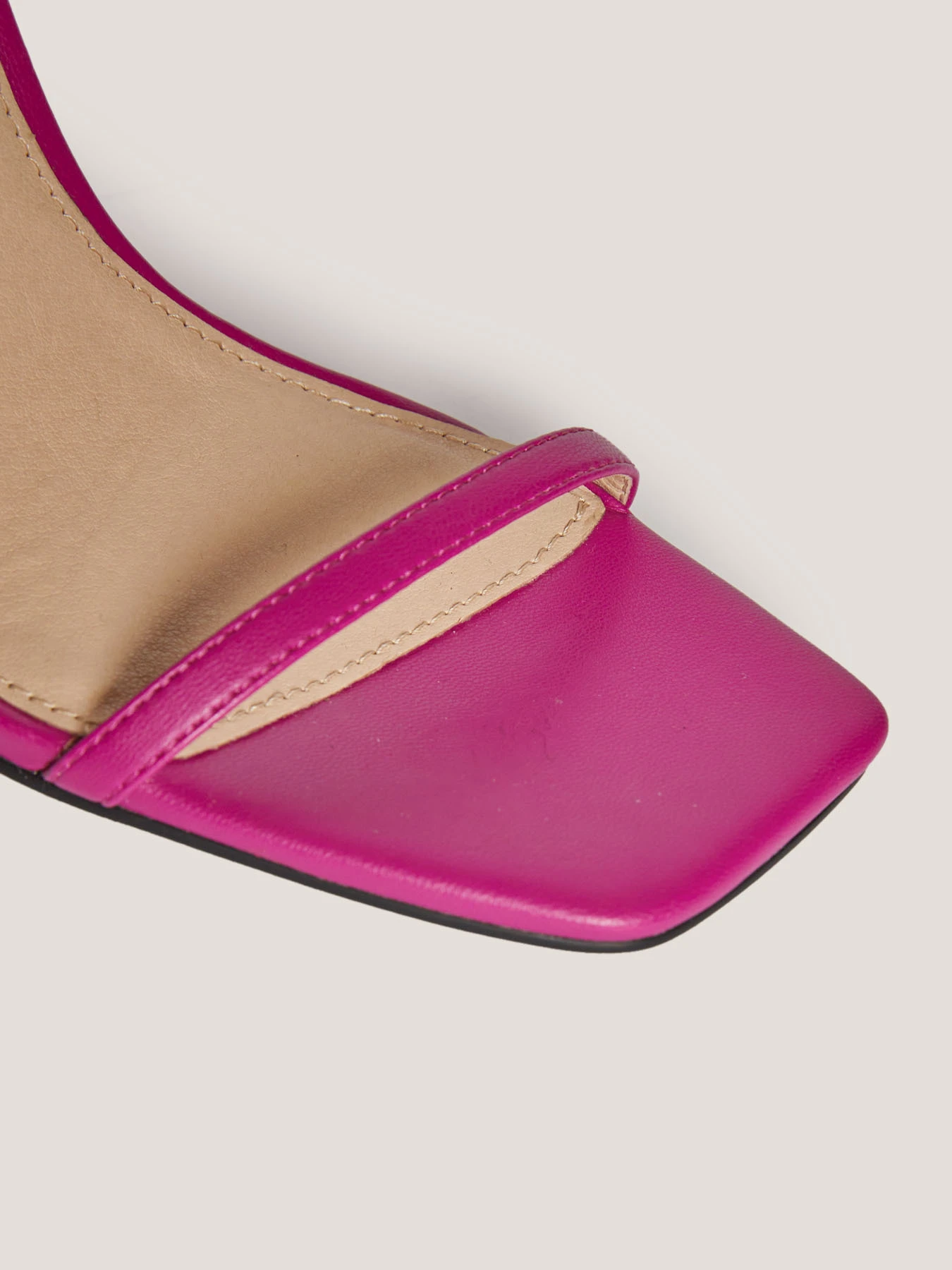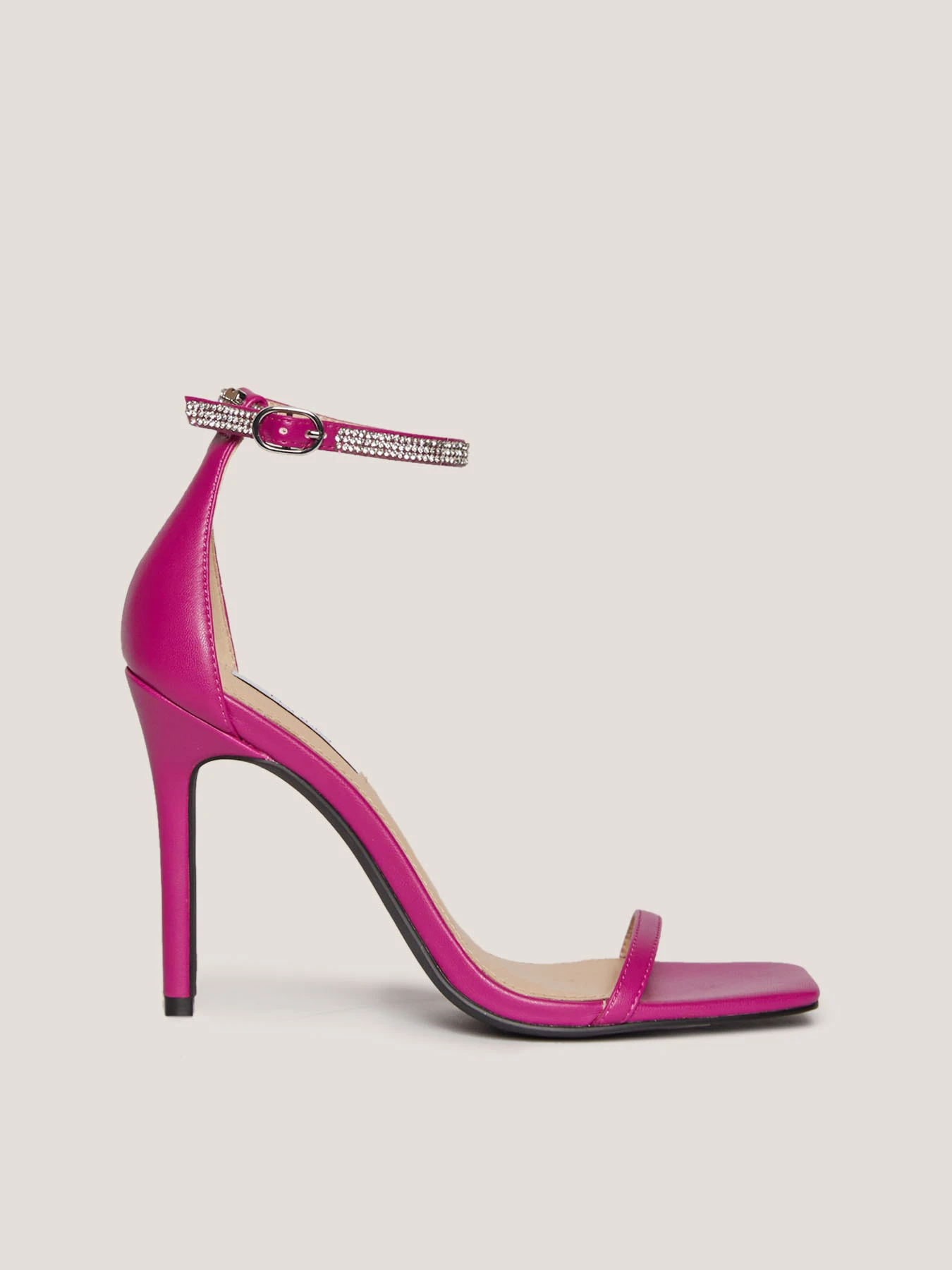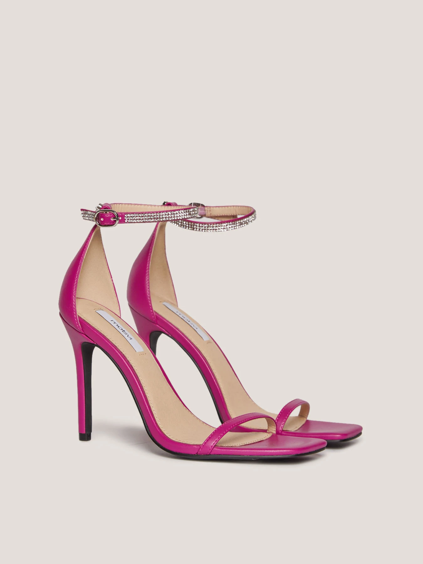 listino sottile sul dorso del piede e punta squadrata; cinturino alla caviglia con strass e placca metallica Double Love; tacco sottile alto 11 cm.