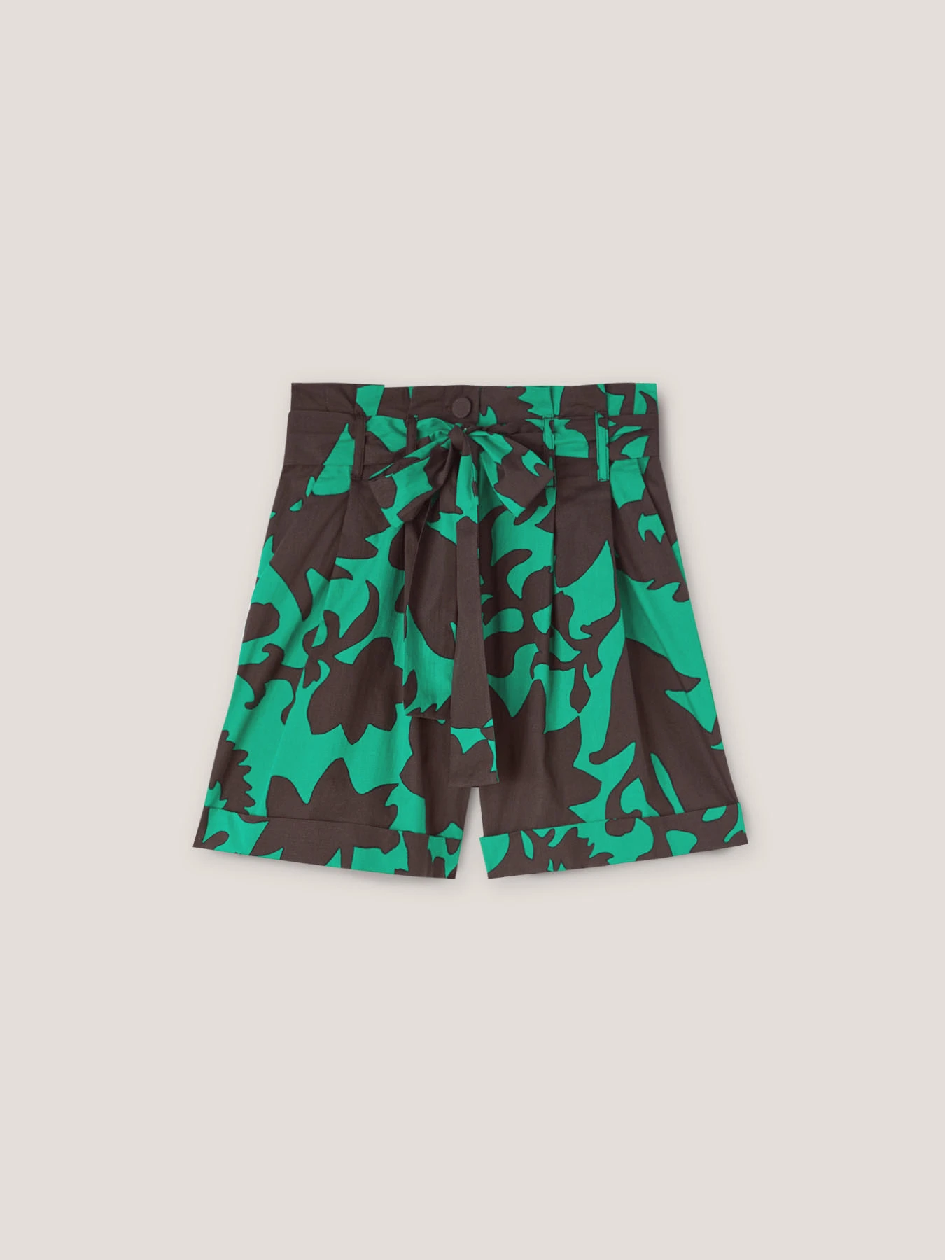 Shorts in popeline di cotone fantasia floreale; vita alta con pieghe nella parte superiore, chiusura frontale con bottone e zip; tasche all’americana, cintura tono su tono.