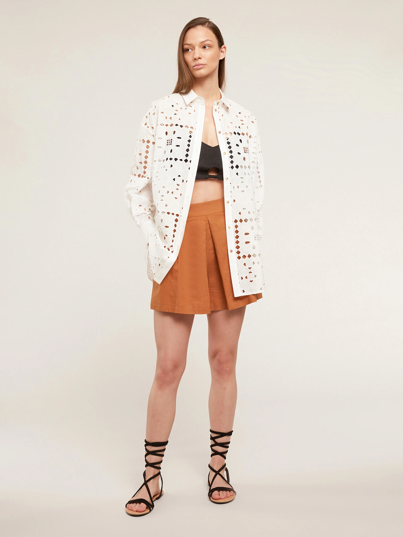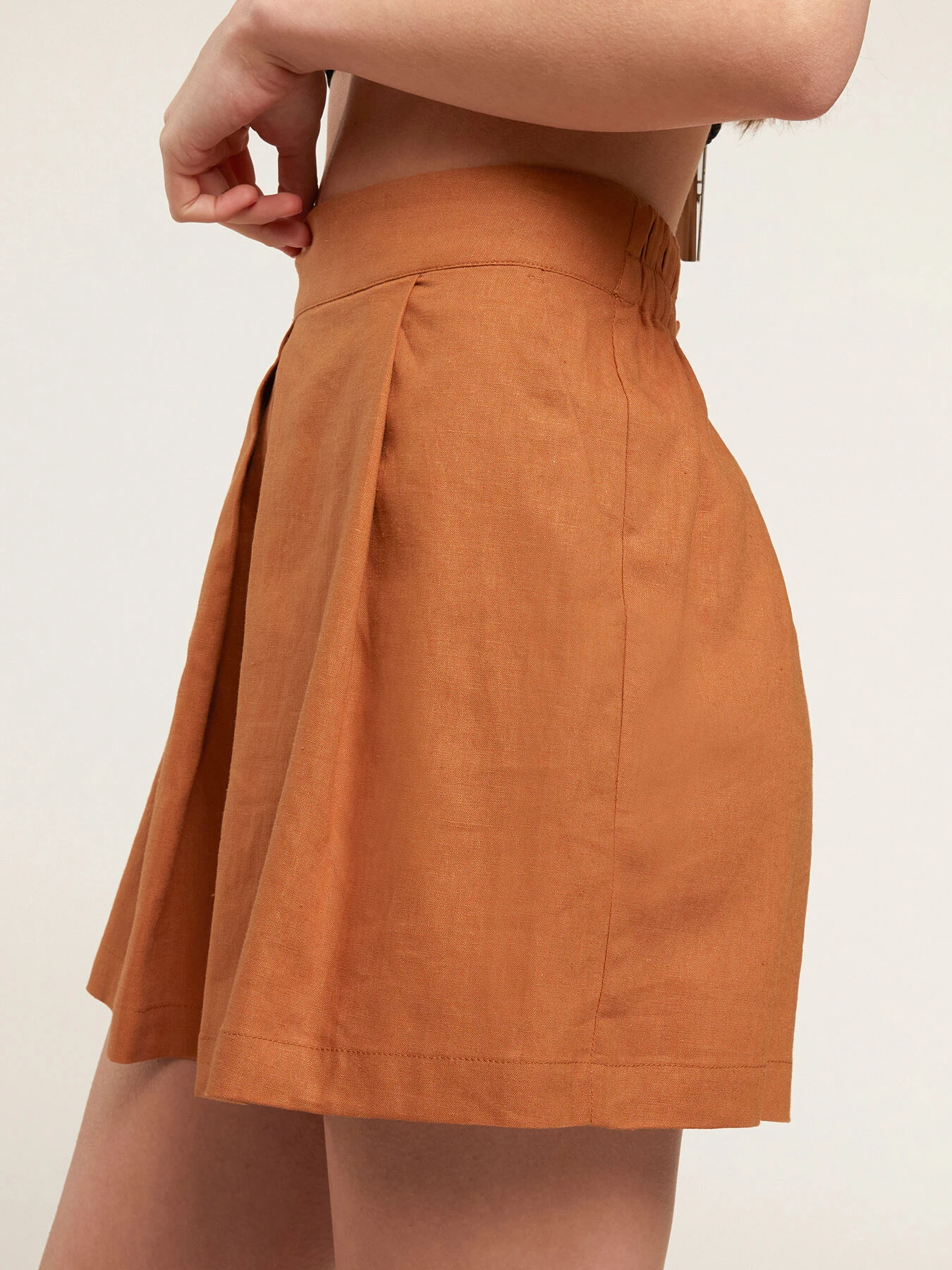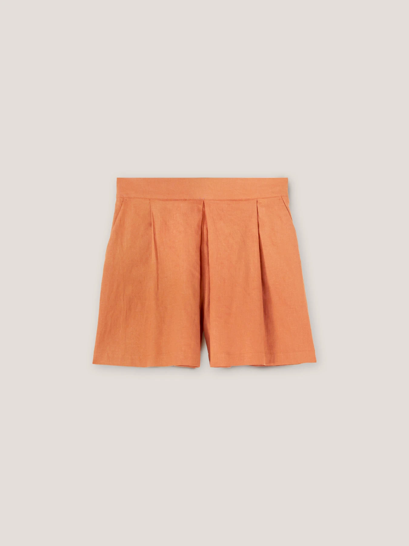 Shorts in tela di lino misto viscosa; vita stretch con elastico interno nella parte posteriore; pieghe nella parte superiore.