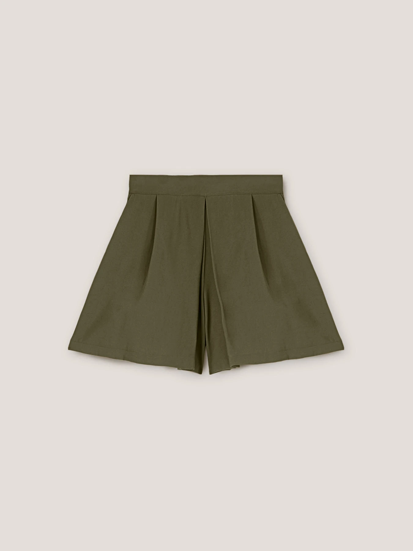 Shorts in tessuto fluido di viscosa; cintura elastica, pieghe nella parte superiore; tasche all’americana inserite nel fianco.