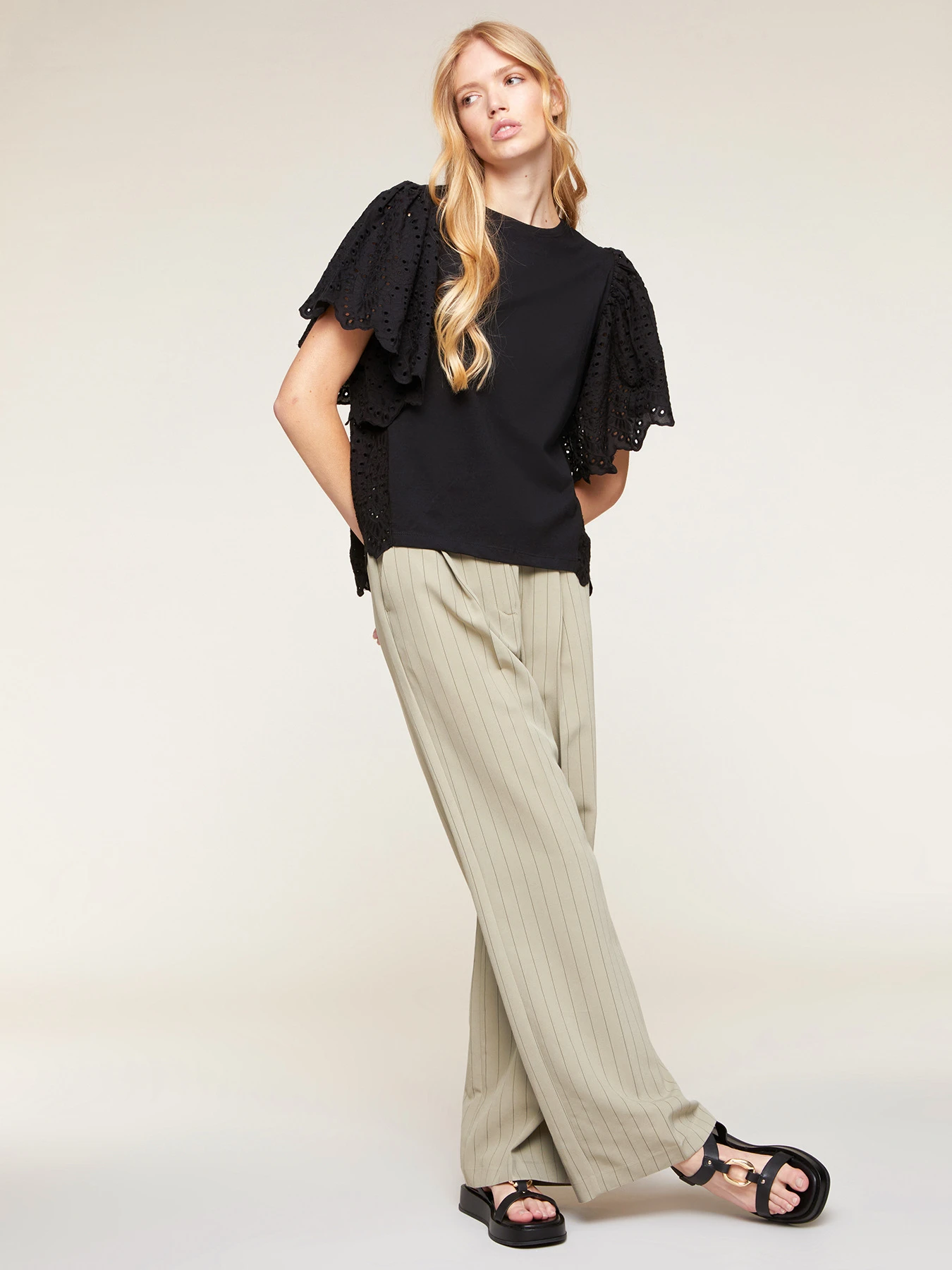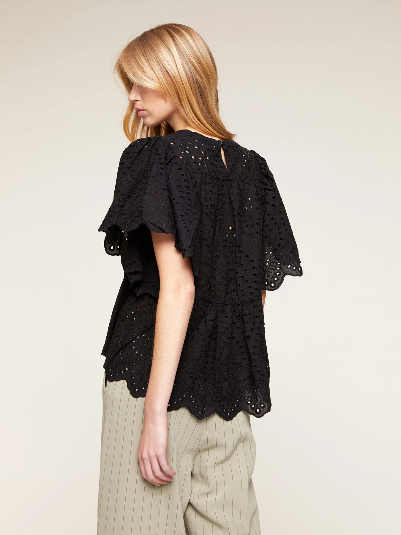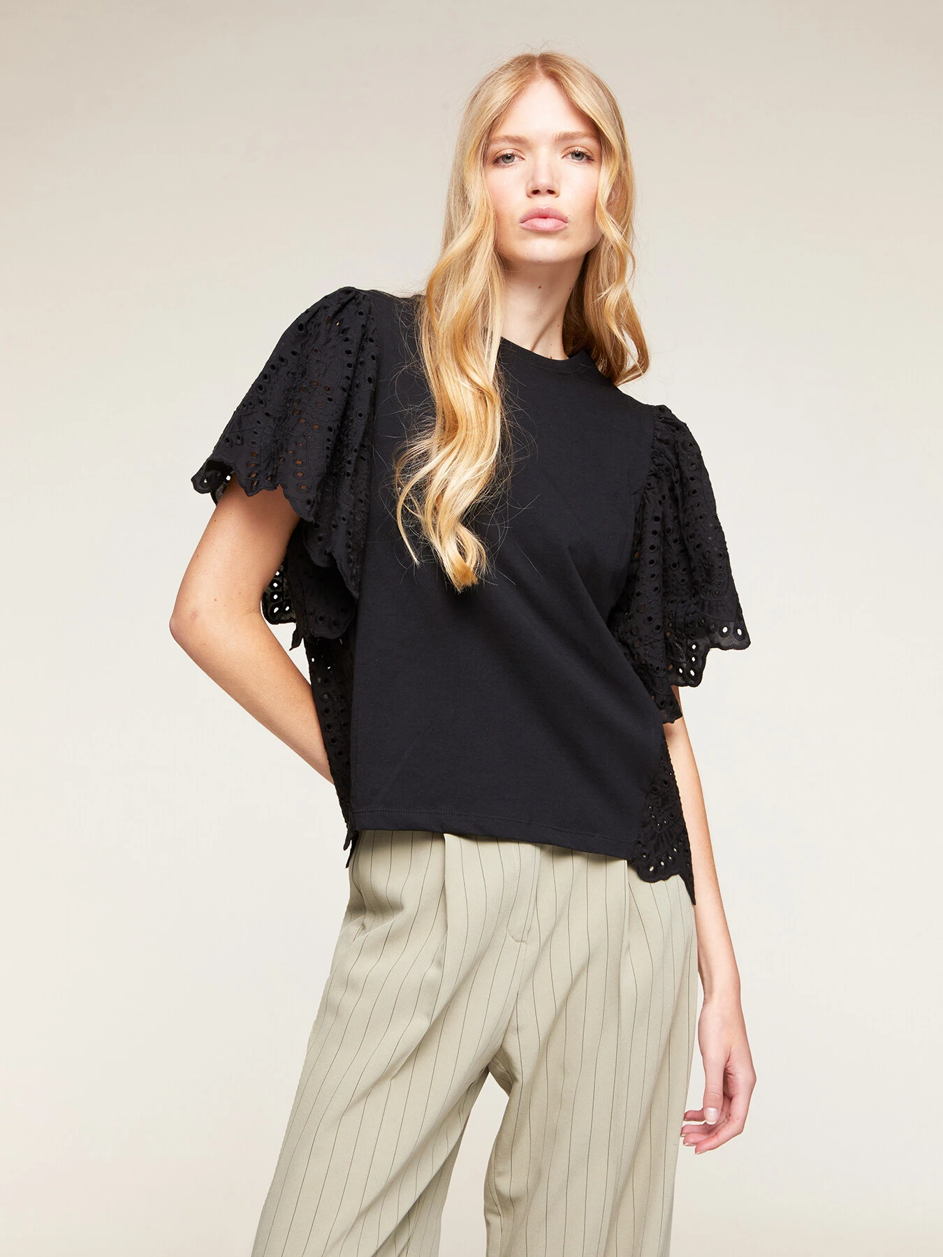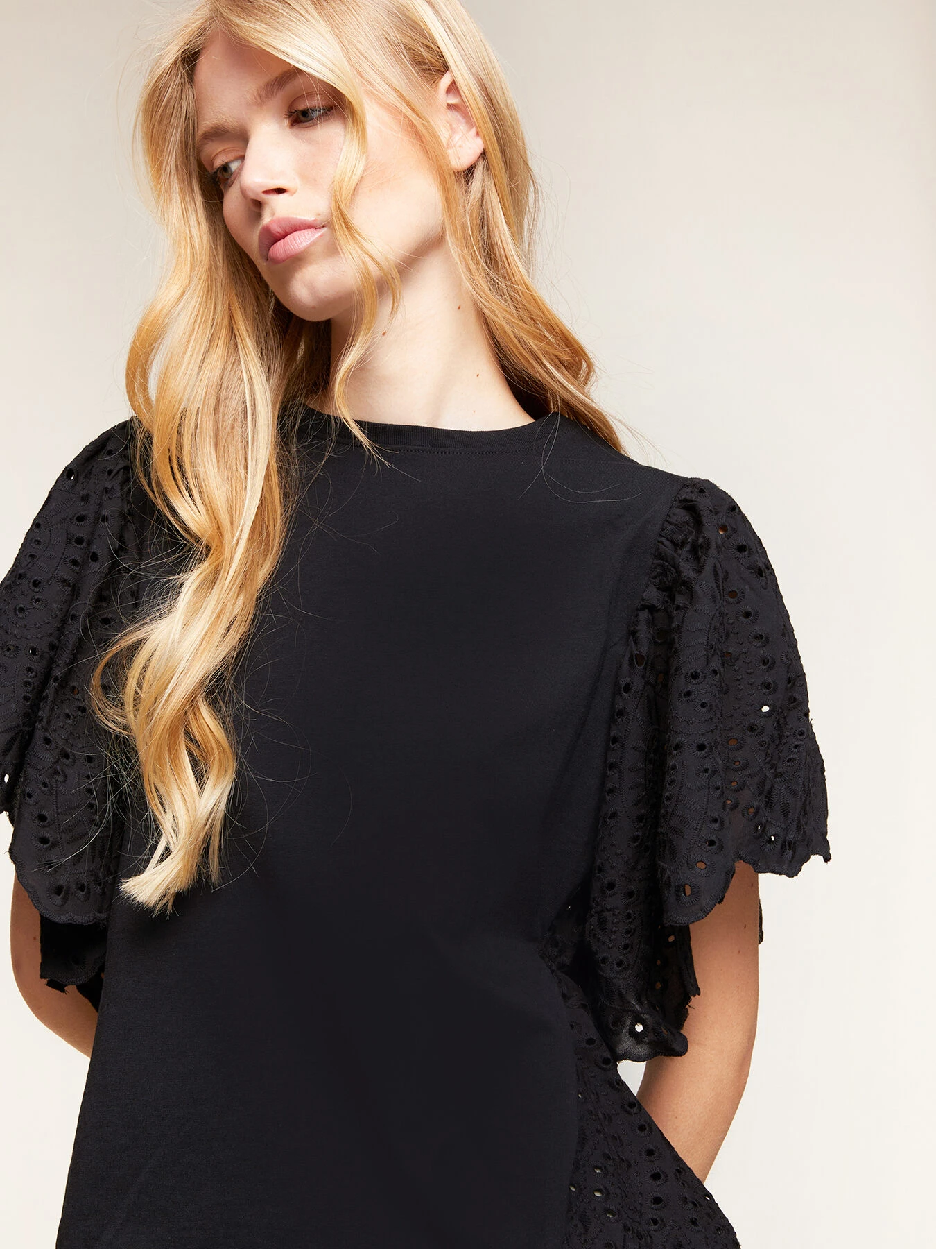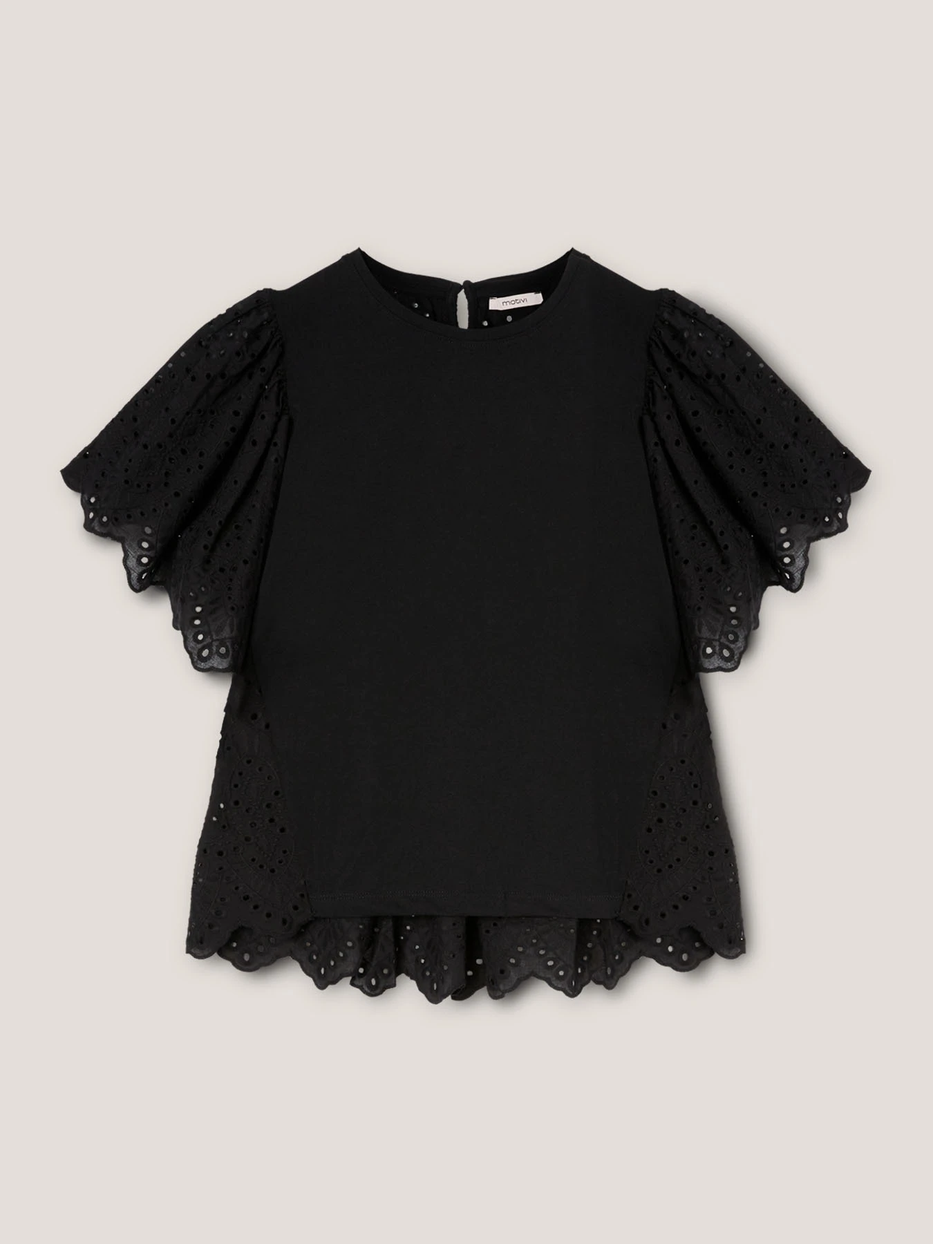 T-shirt bimaterica in jersey di cotone ed inserti in sangallo; scollo tondo con apertura a goccia nel centro dietro; maniche ampie a maxi volant, linea svasata con balza al fondo posteriore arricciata.; Scegliendo i nostri prodotti in cotone state supportando il nostro contributo alla missione di Better Cotton promuovendo una produzione più responsabile del cotone. Questo prodotto proviene da un sistema di bilancio di massa e pertanto potrebbe non contenere Better Cotton.