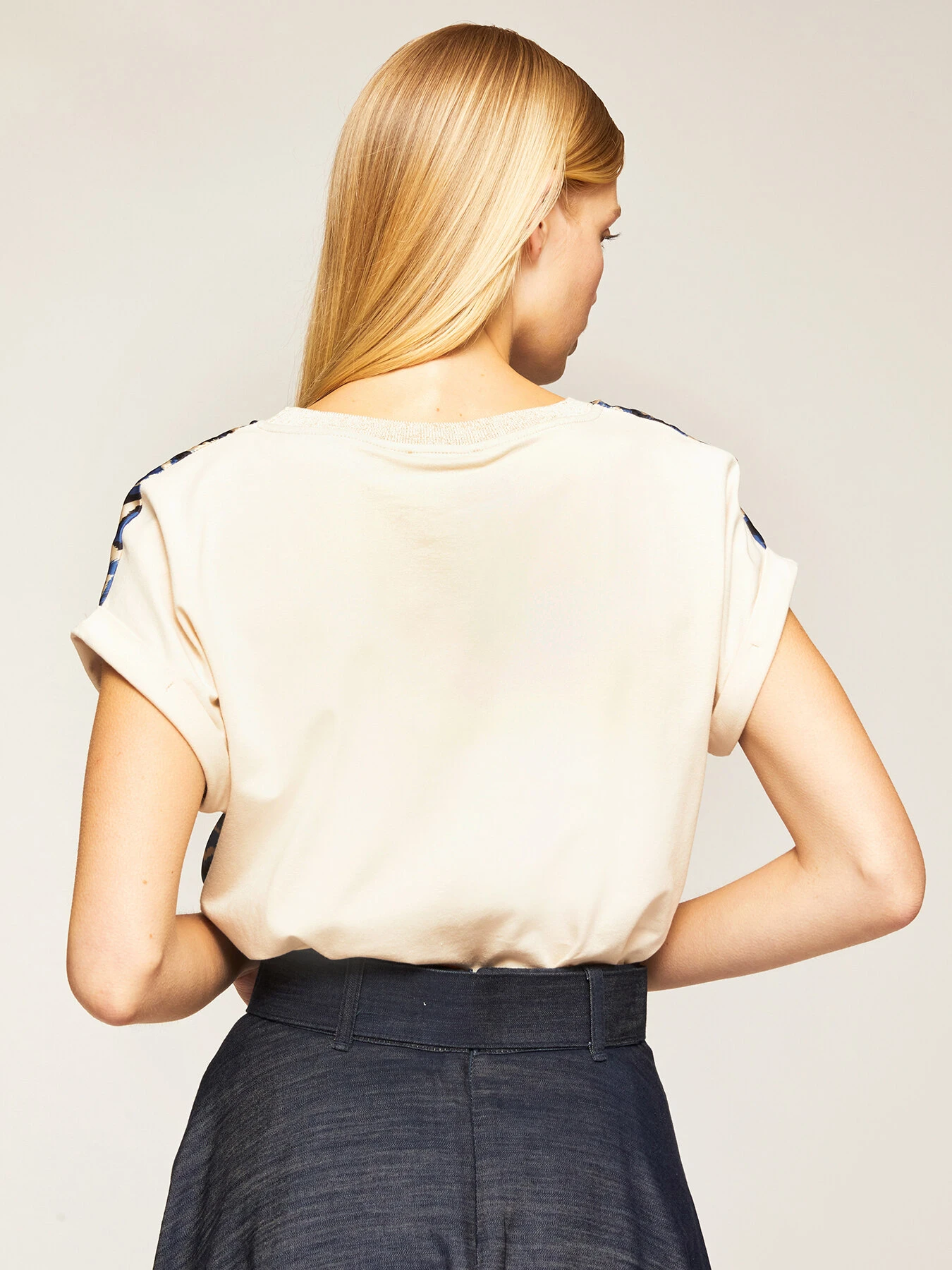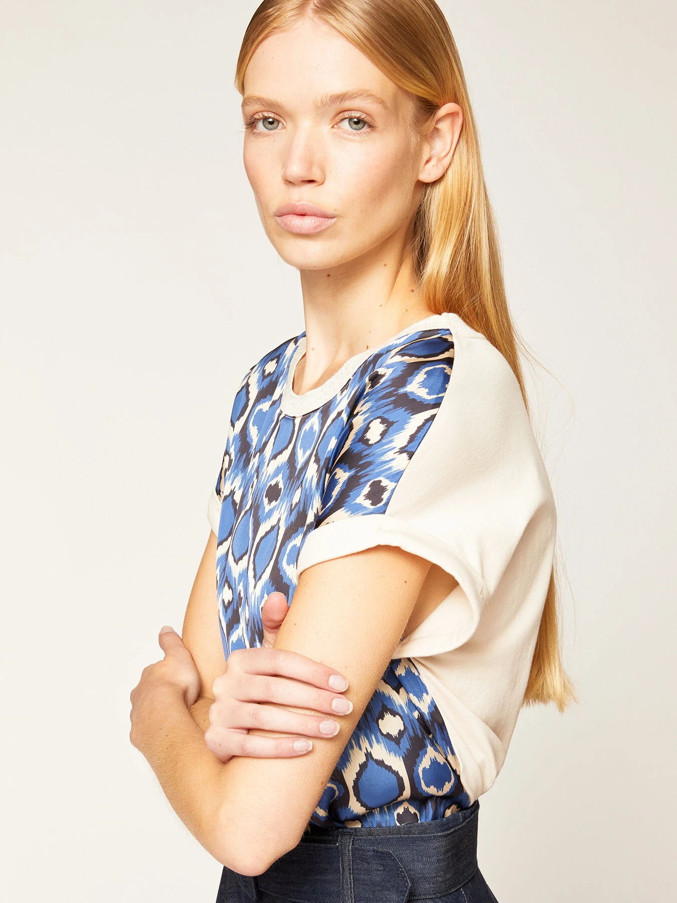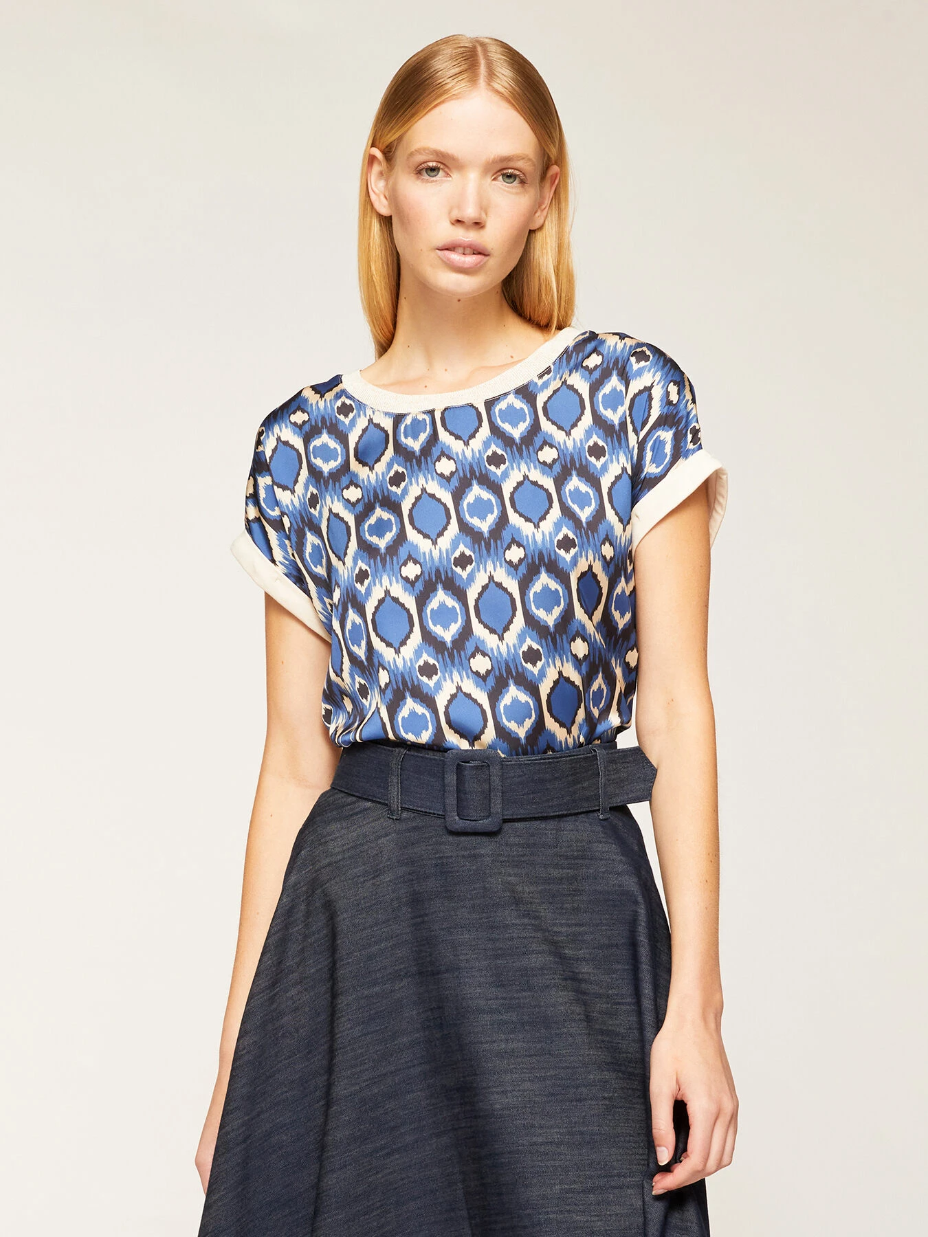 T-shirt bimaterica fantasia etnica; modello a kimono con maniche corte e risvolto sul fondo; scollo tondo con bordo lurex.