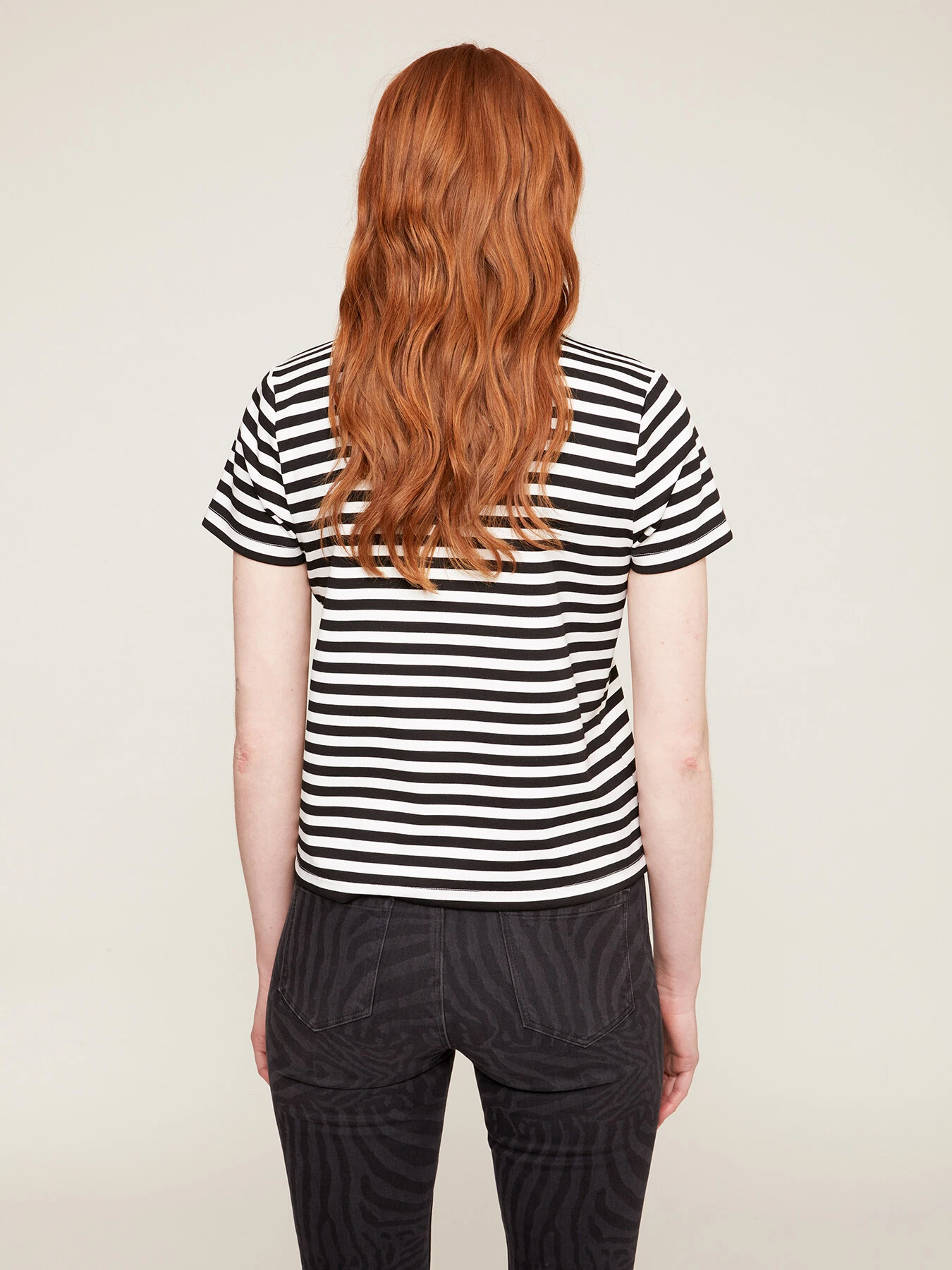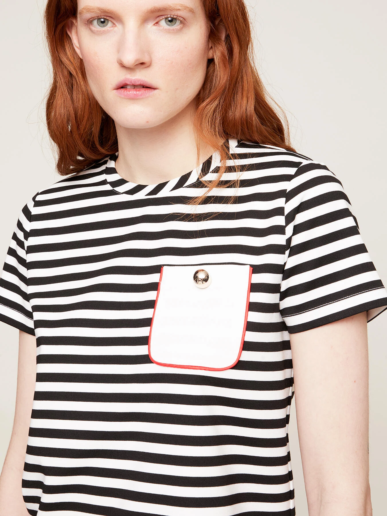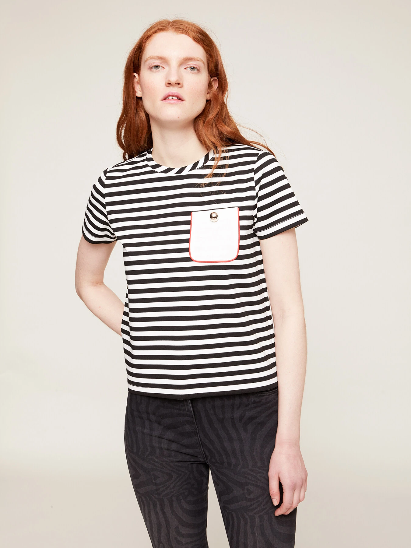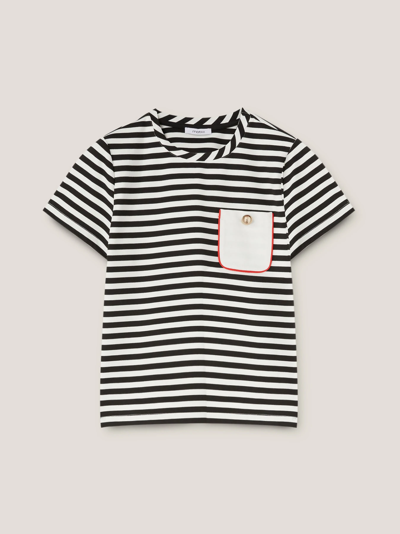 T-shirt boxy a righe in punto milano fantasia a righe; scollo tondo e maniche corte; tasca applicata tinta unita con bordo in contrasto colore e bottone.