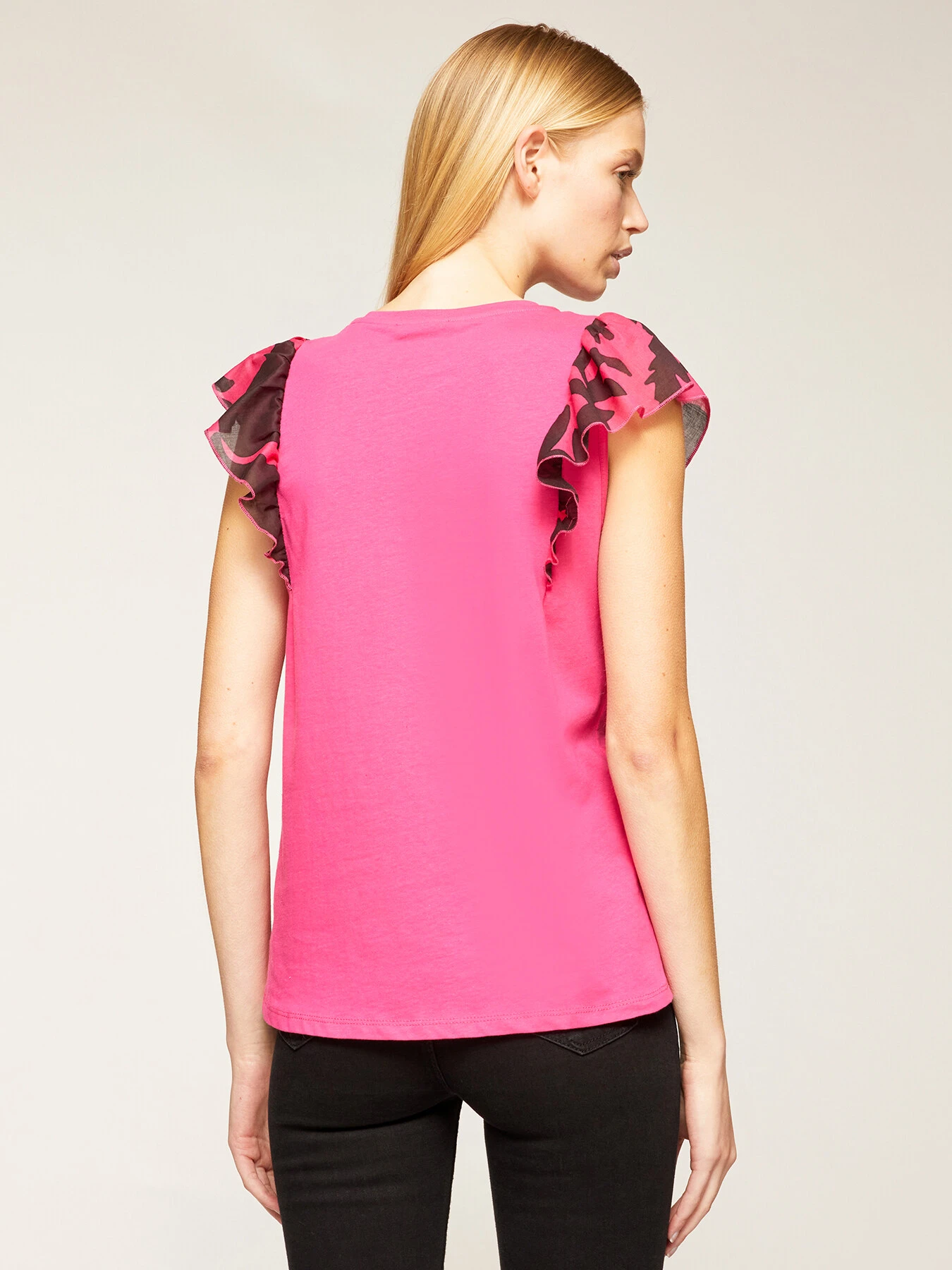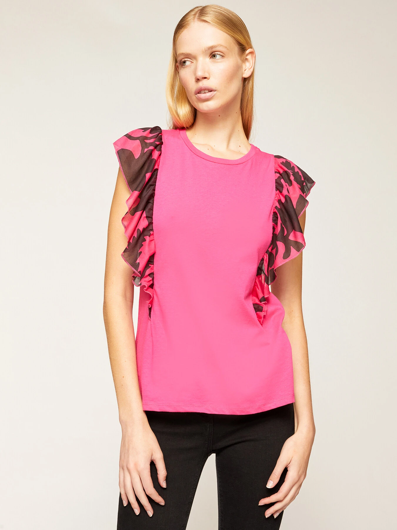 T-shirt in jersey di cotone tinta unita; scollo tondo; maniche corte a volant in mussola fantasia floreale.