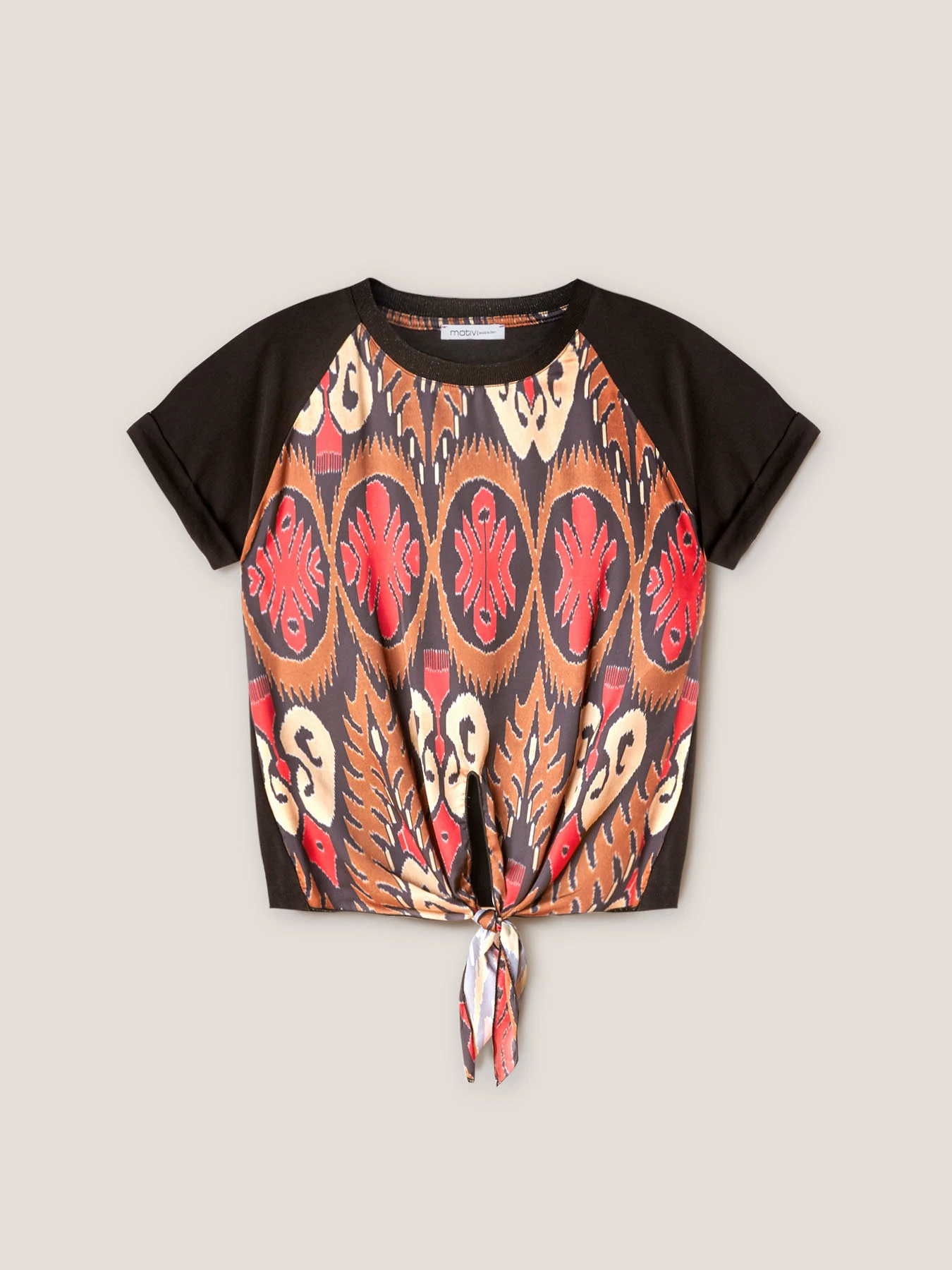 T-shirt bimaterica fantasia etnica; scollo tondo con bordo lurex, maniche corte con taglio raglan; motivo frontale a nodo.