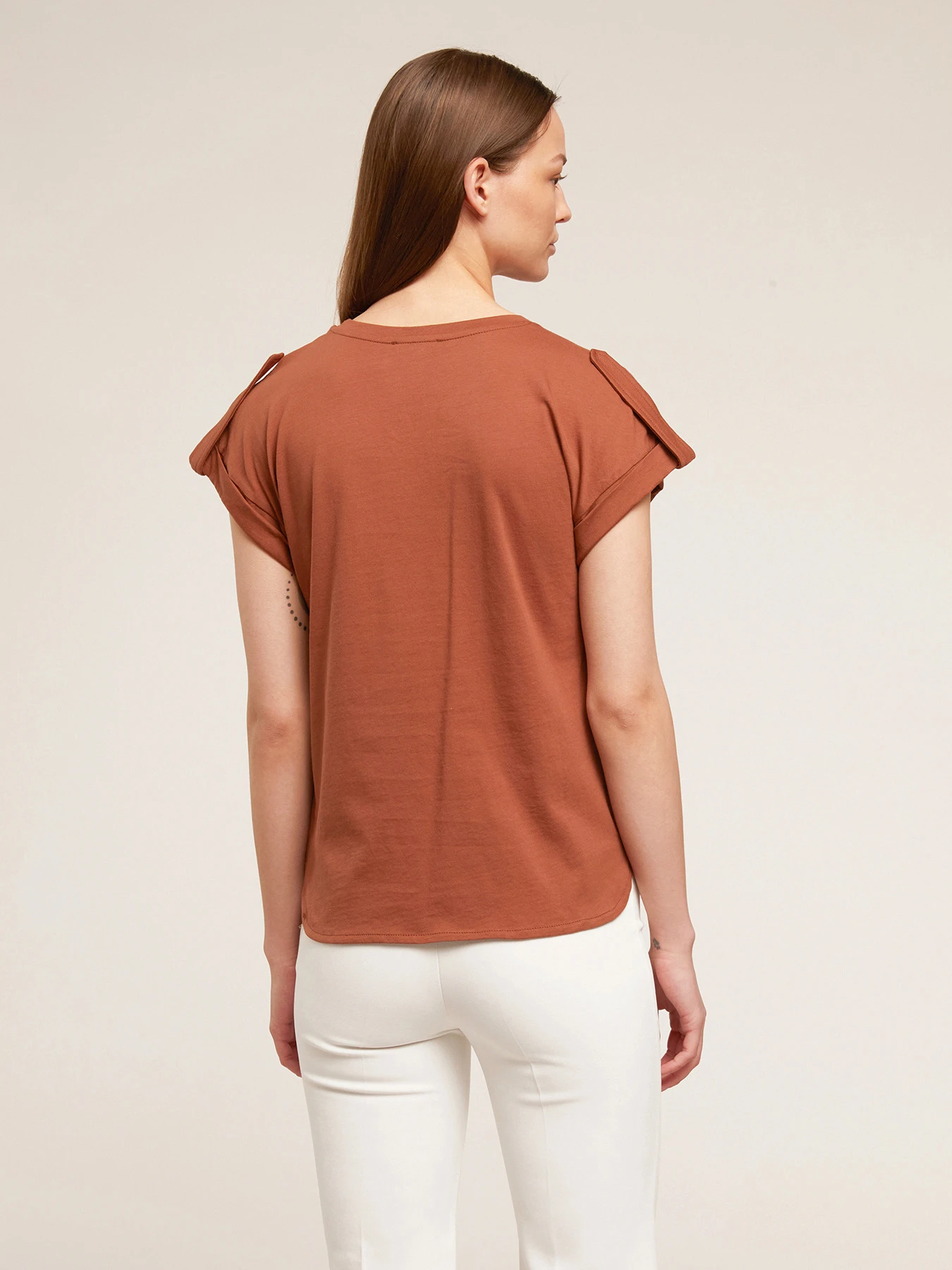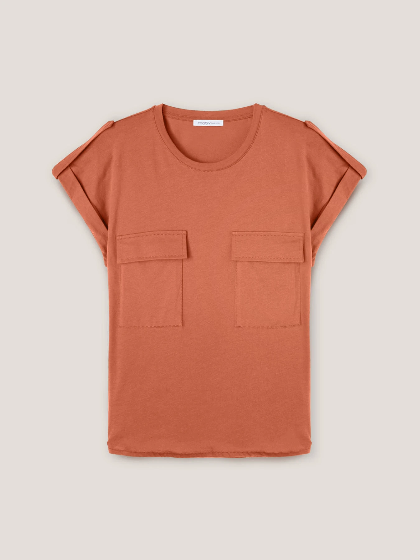 T-shirt in jersey di cotone tinta unita con scollo tondo; modello a kimono con maniche corte, risvolto sul fondo e mostrine; maxi tasche applicate frontalmente.