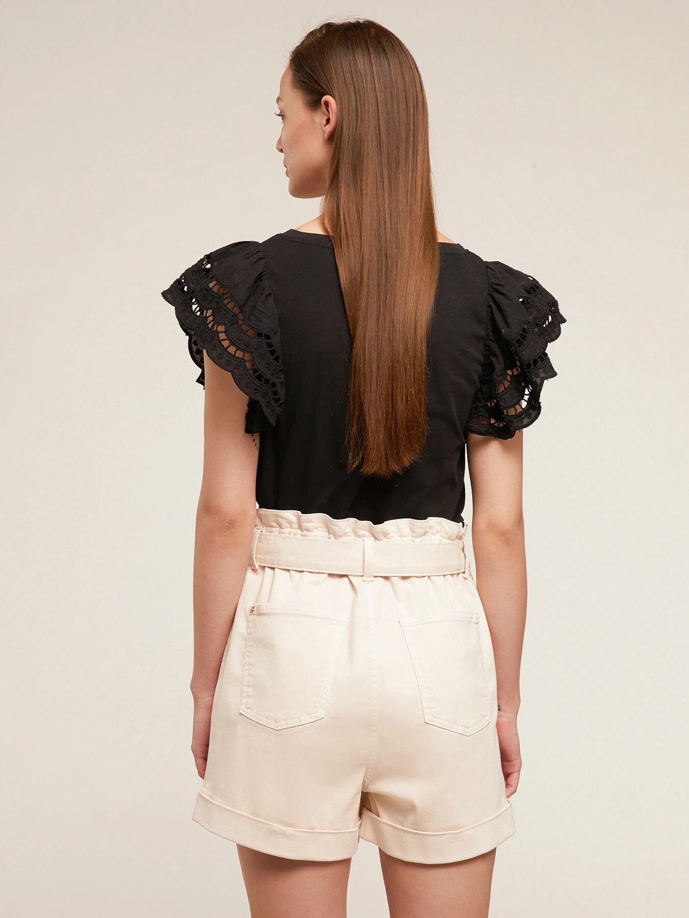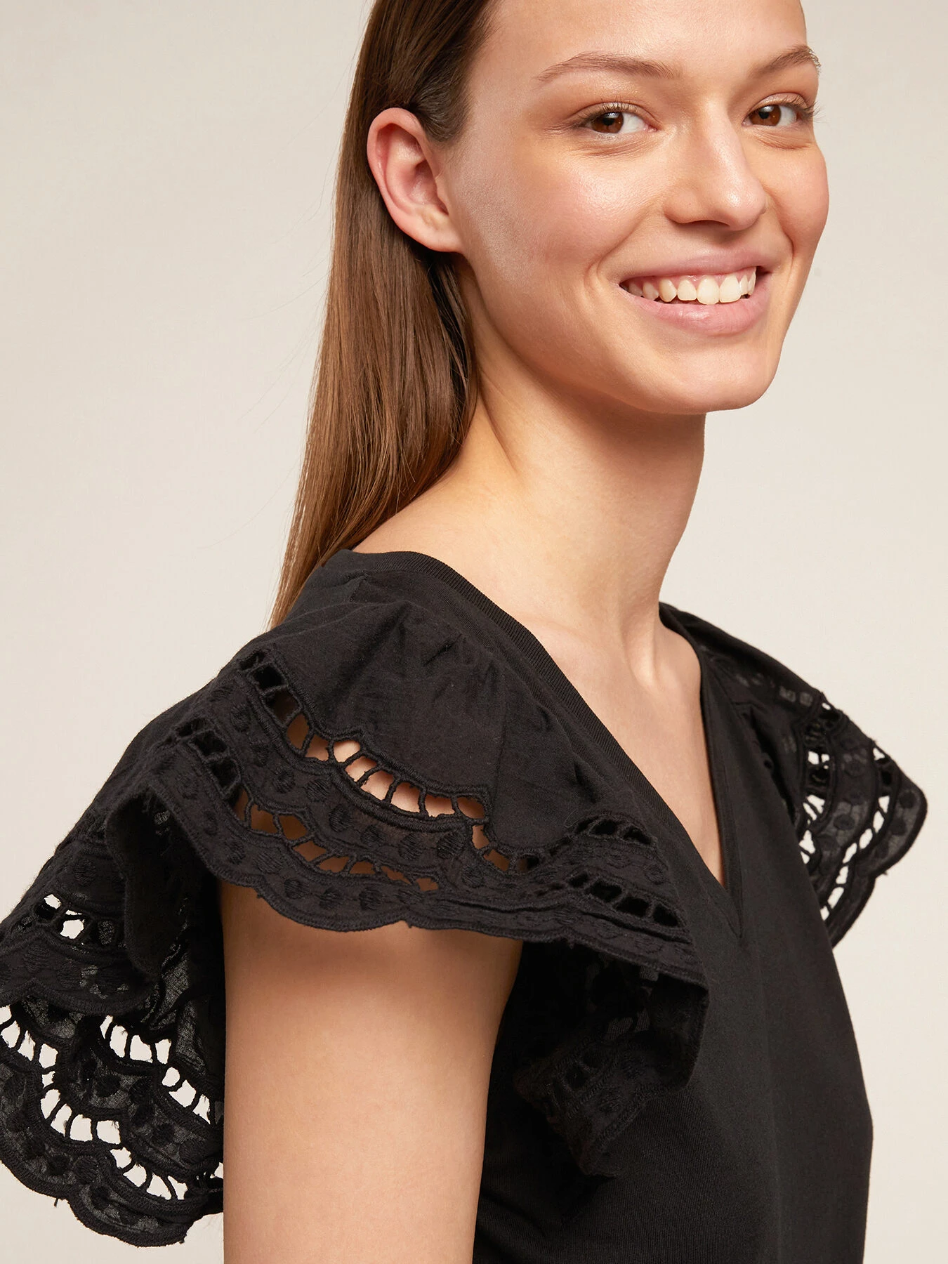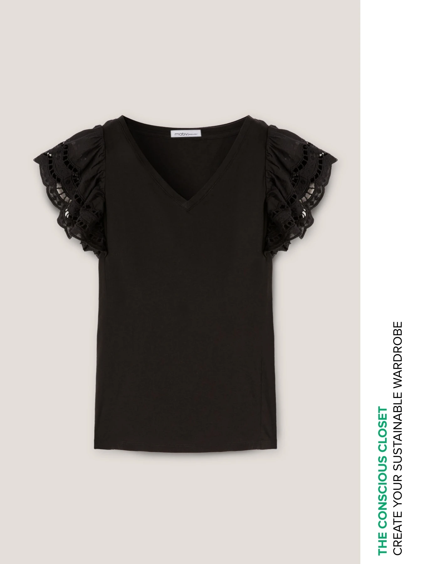 T-shirt in jersey di cotone; scollo a v frontale; maniche a volant in pizzo sangallo tono su tono.; Scegliendo i nostri prodotti in cotone state supportando il nostro contributo alla missione di Better Cotton promuovendo una produzione più responsabile del cotone. Questo prodotto proviene da un sistema di bilancio di massa e pertanto potrebbe non contenere Better Cotton.