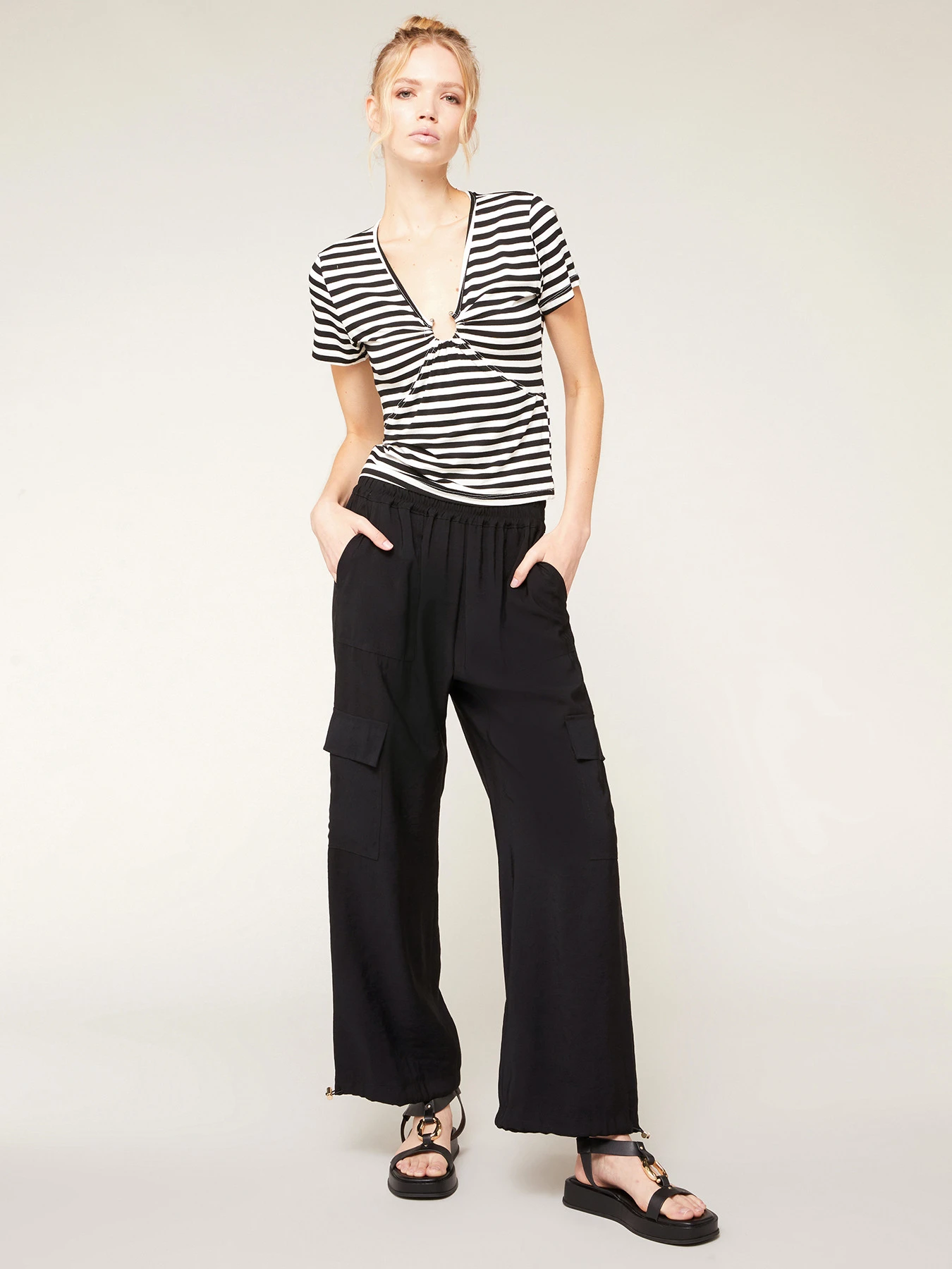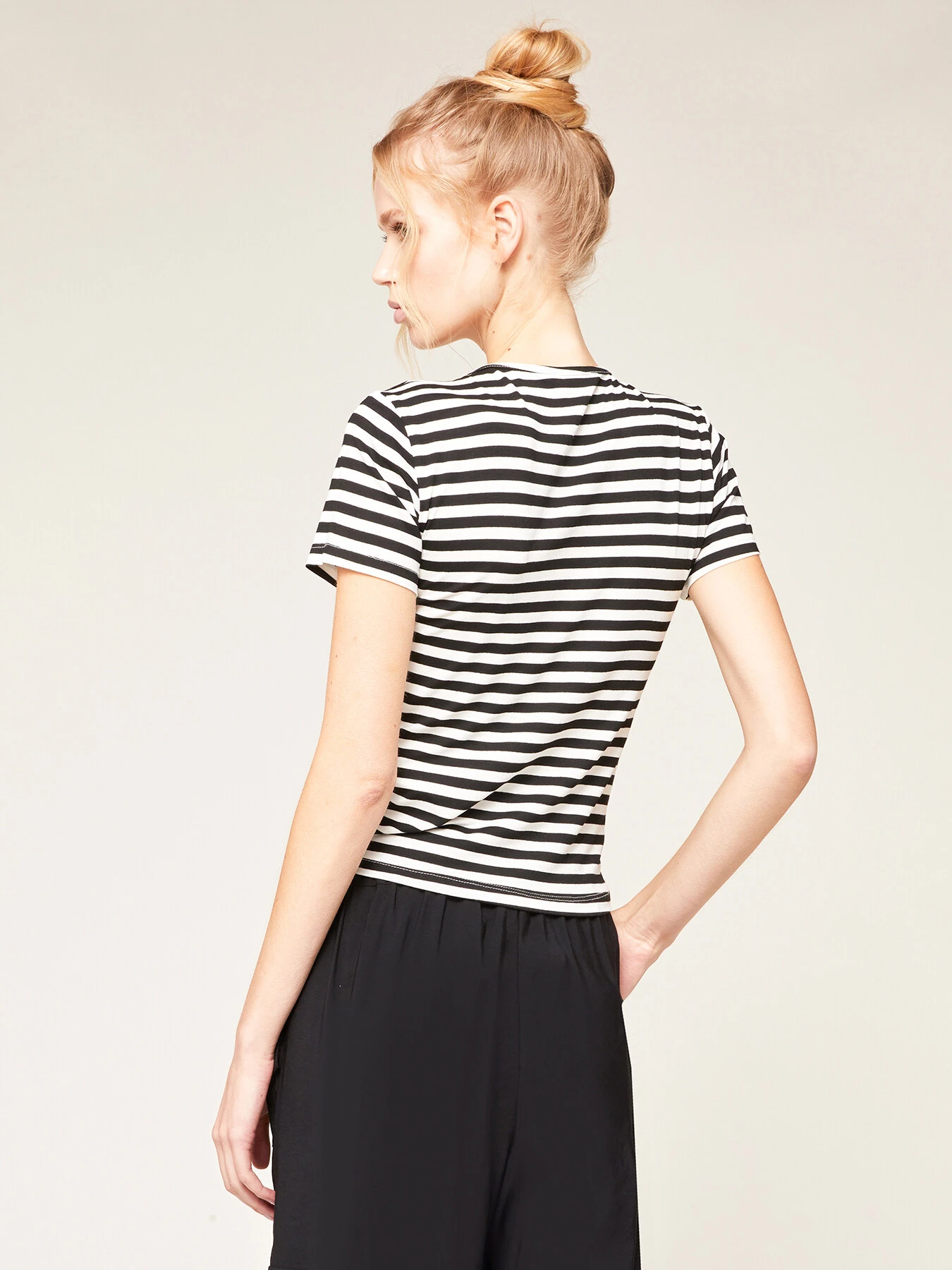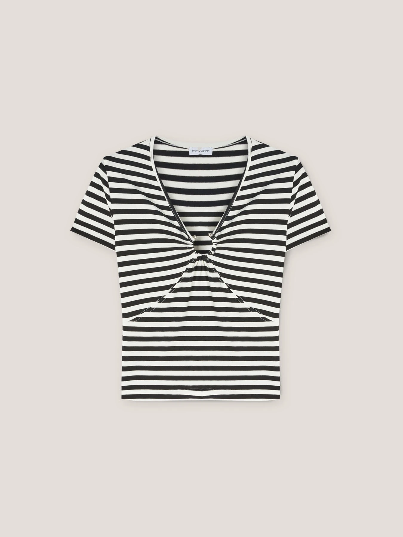 T-shirt in filato misto viscosa fantasia a righe; profondo scollo a v frontale con motivo ad arriccio; maniche corte, vestibilità slim.