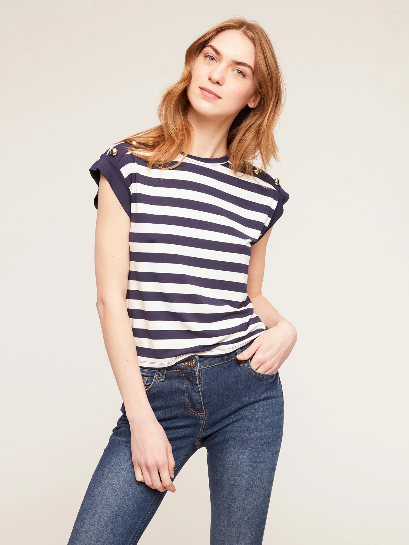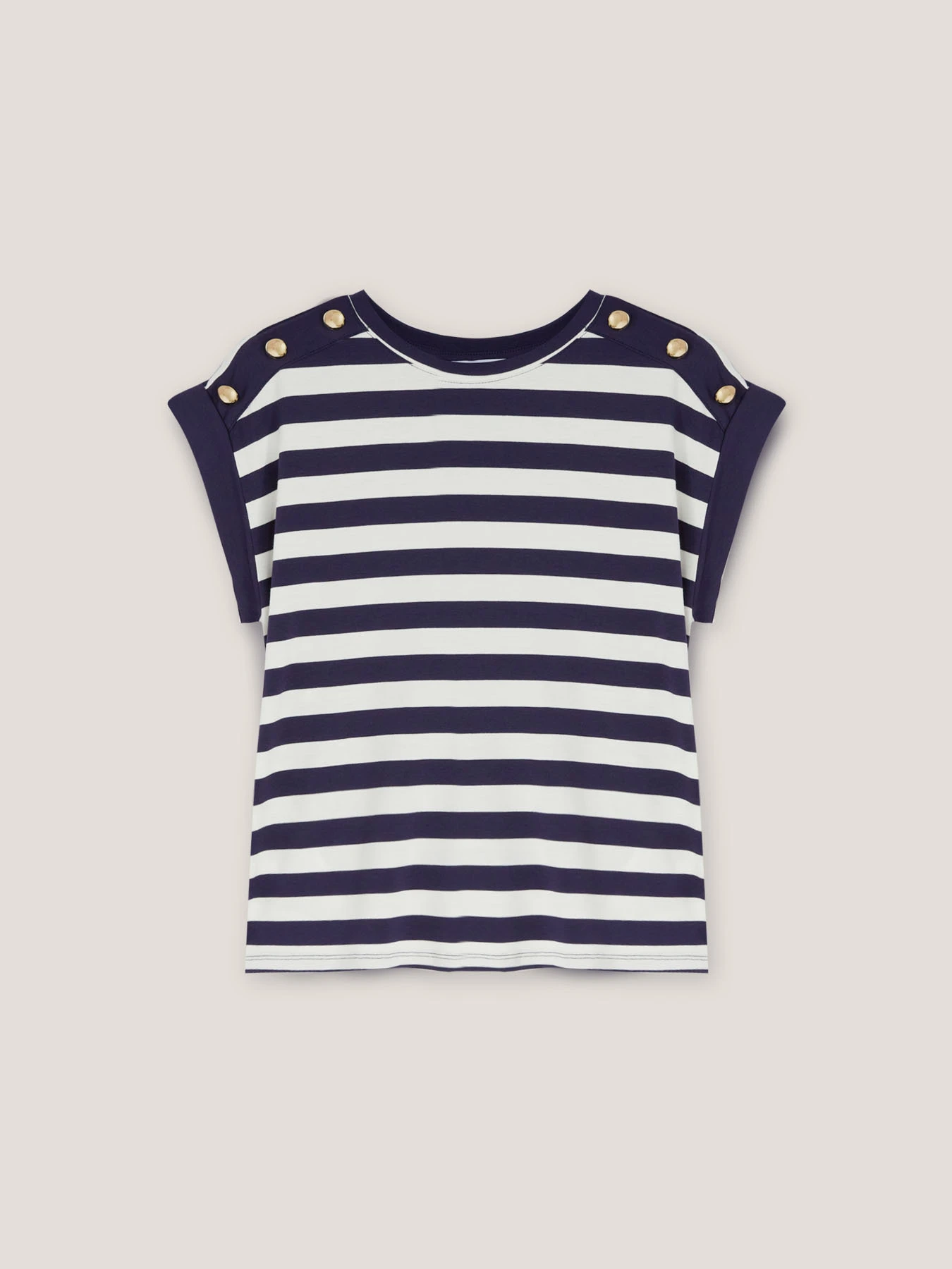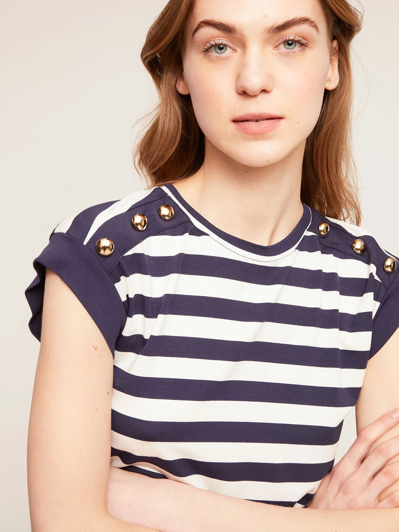 T-shirt navy in jersey misto viscosa a righe; modello a kimono con maniche corte e scollo a barca; motivo di bottoni metallici sulle spalle.