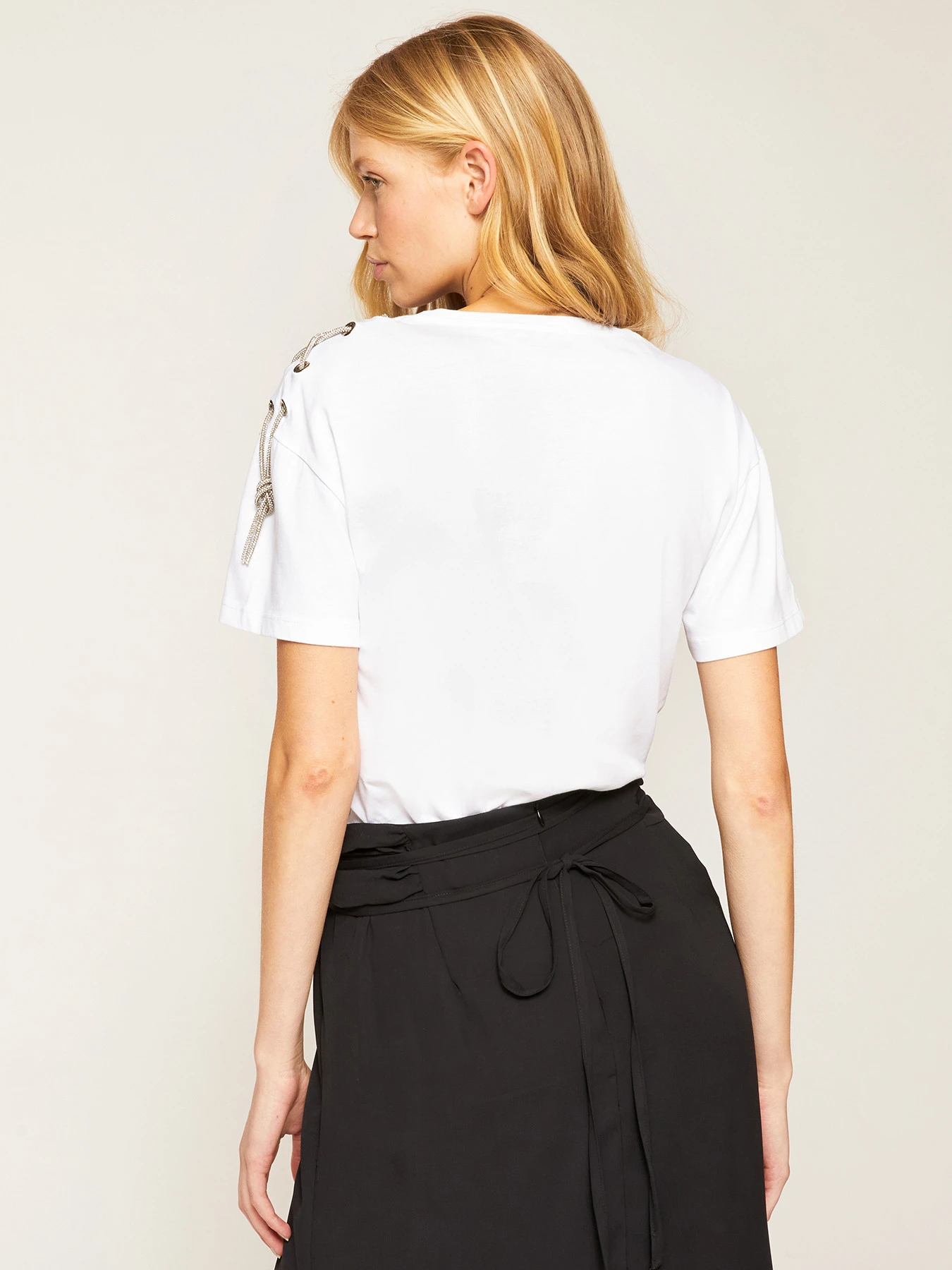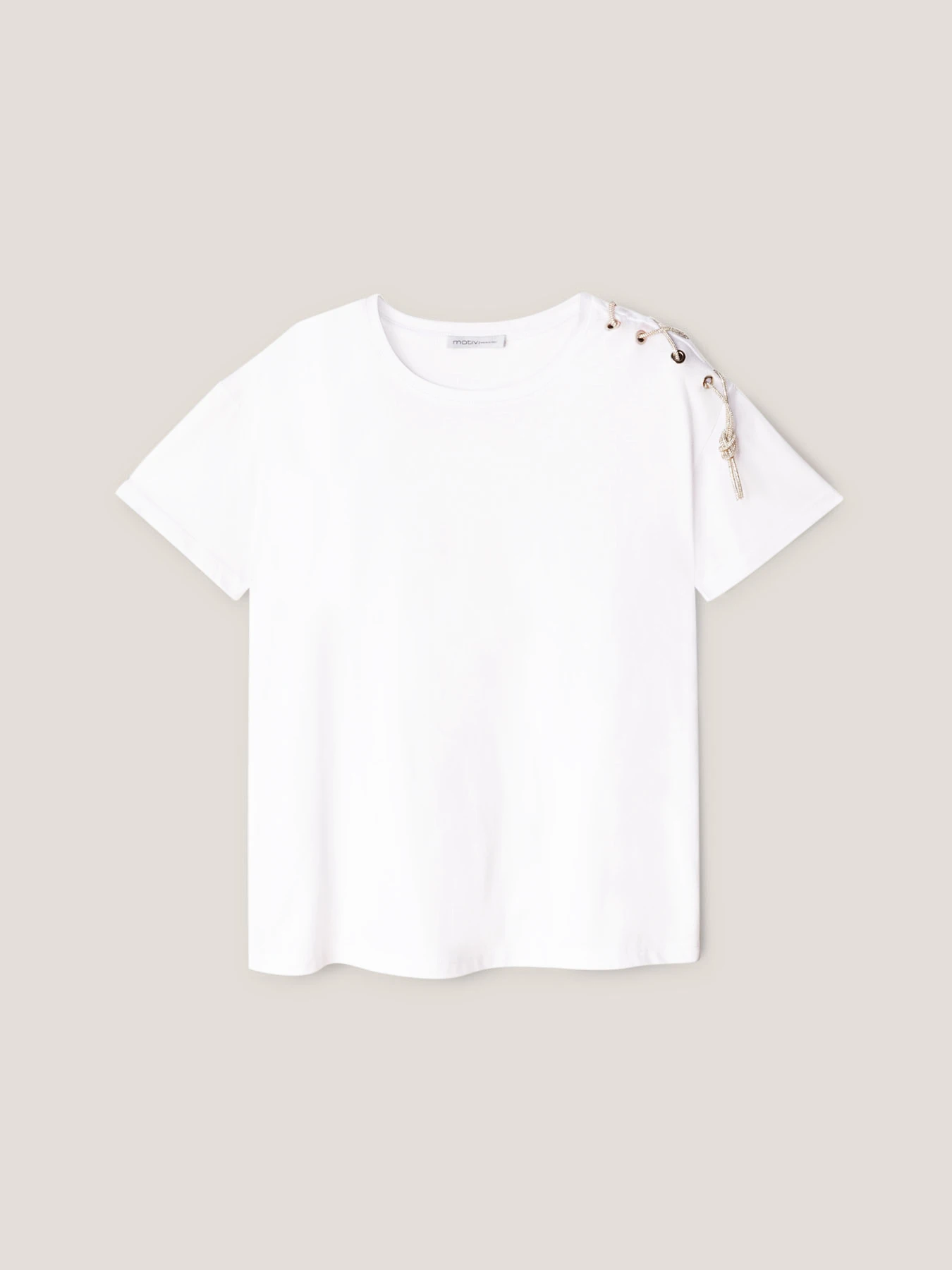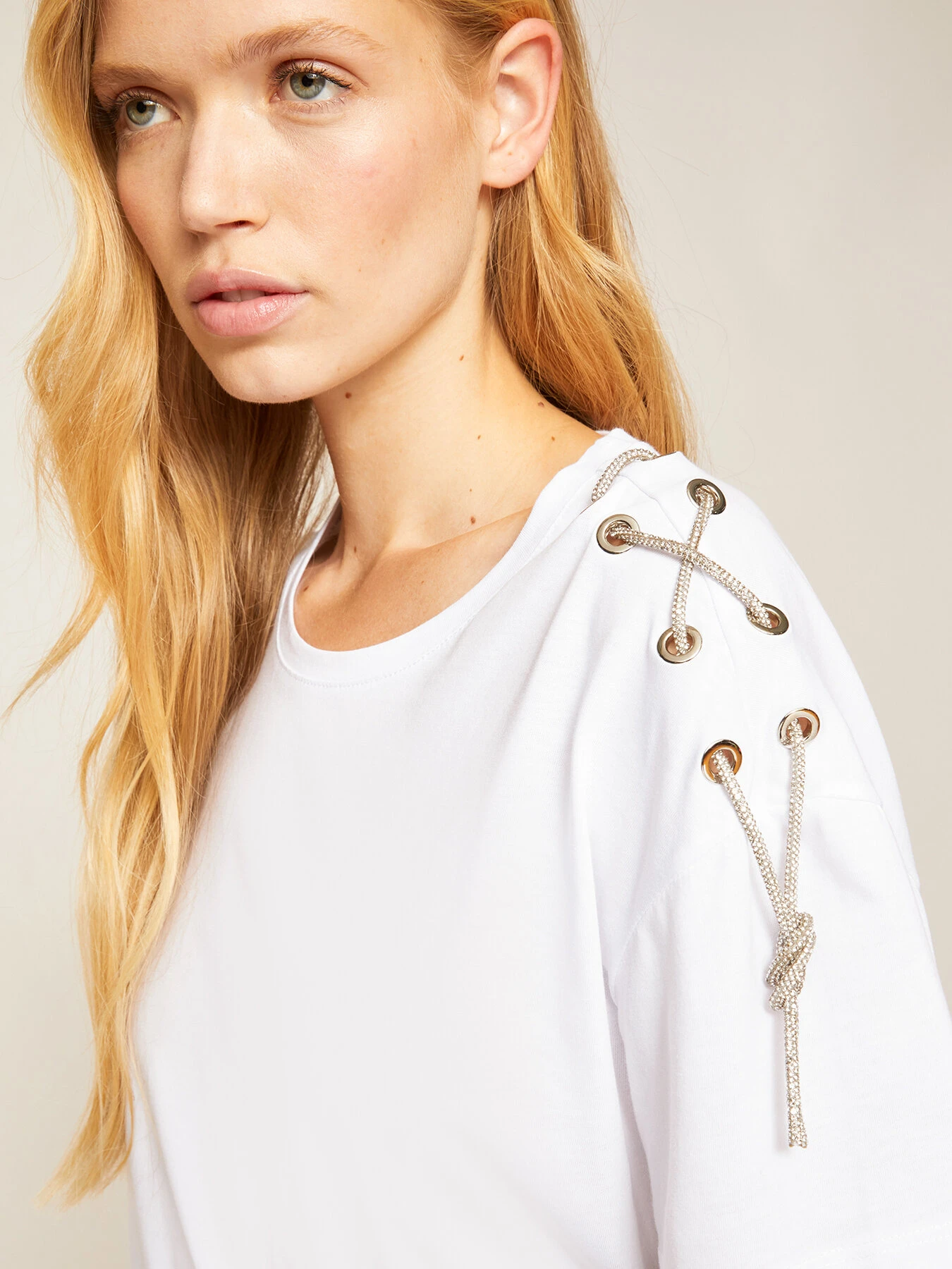 T-shirt over in jersey di cotone tinta unita; scollo tondo; maniche corte con taglio spalla sceso e motivo asimmetrico ad occhielli e catenella gioiello.