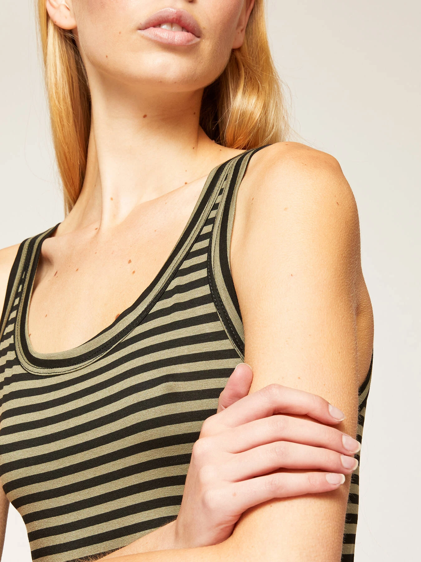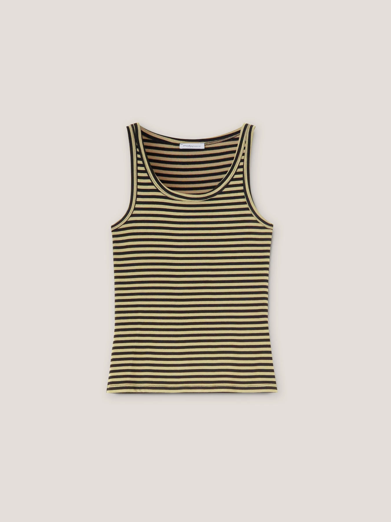 Top a canotta in jersey misto viscosa elastane a righe; modello a spalla larga; scollo tondo.