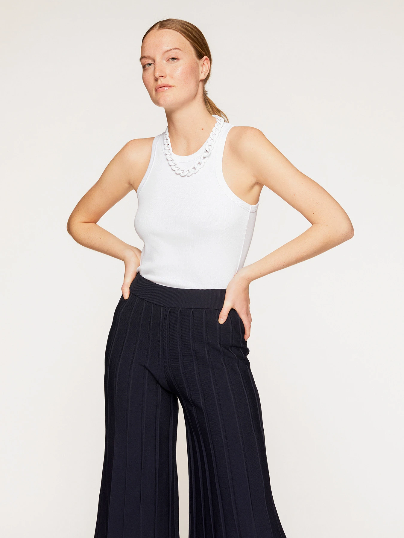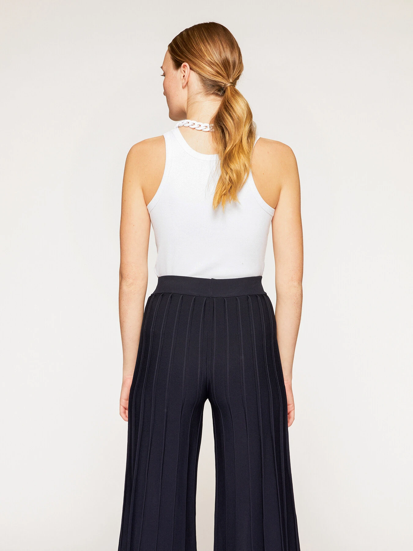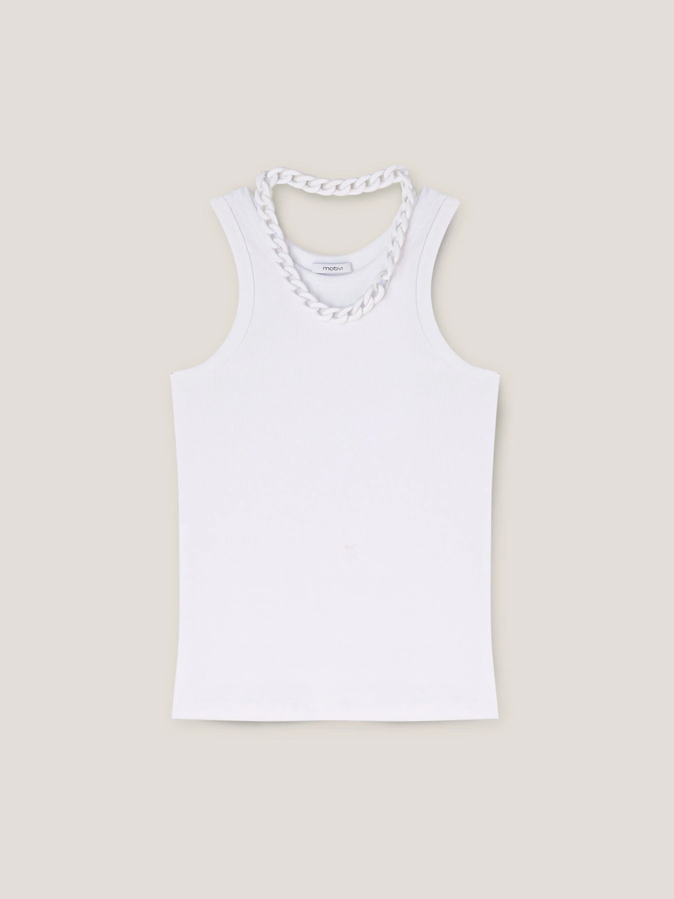 Top in jersey misto cotone a coste; scollo all’americana; collana a catena tono su tono.