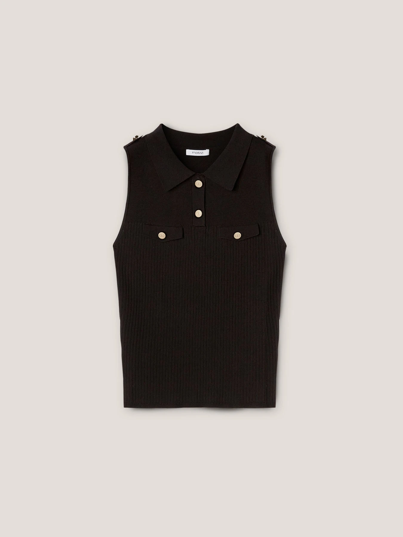 Top a polo in maglia a coste misto viscosa; colletto a vela e bottoni metallici; motivo tasche a patta anteriori, vestibilità slim.