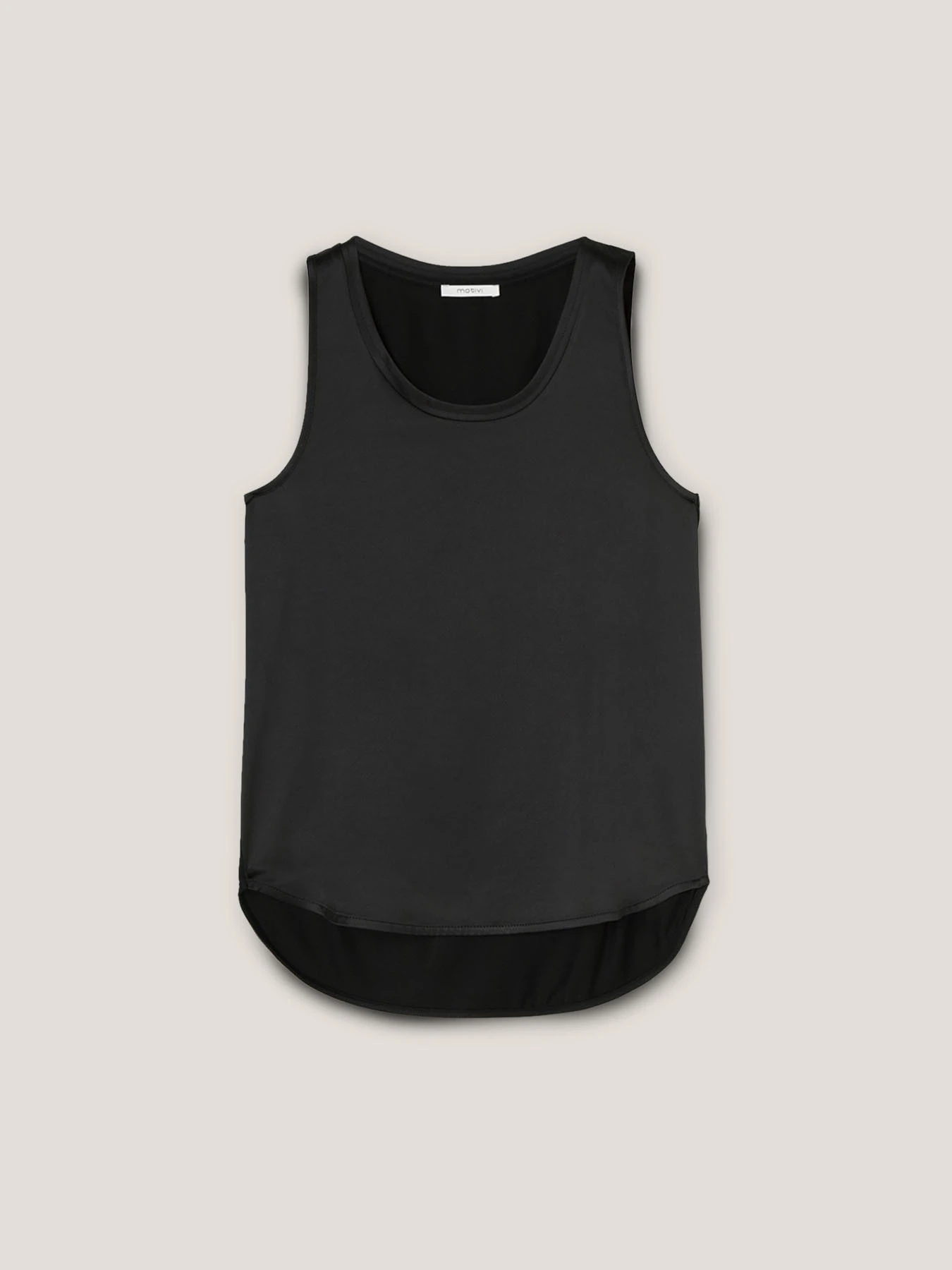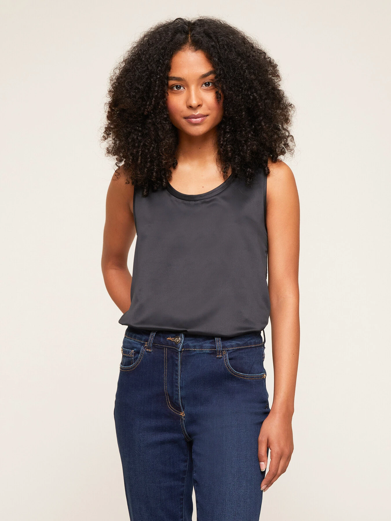 Top in jersey di viscosa stretch; davanti in fluido raso; spalla larga e fondo stondato.