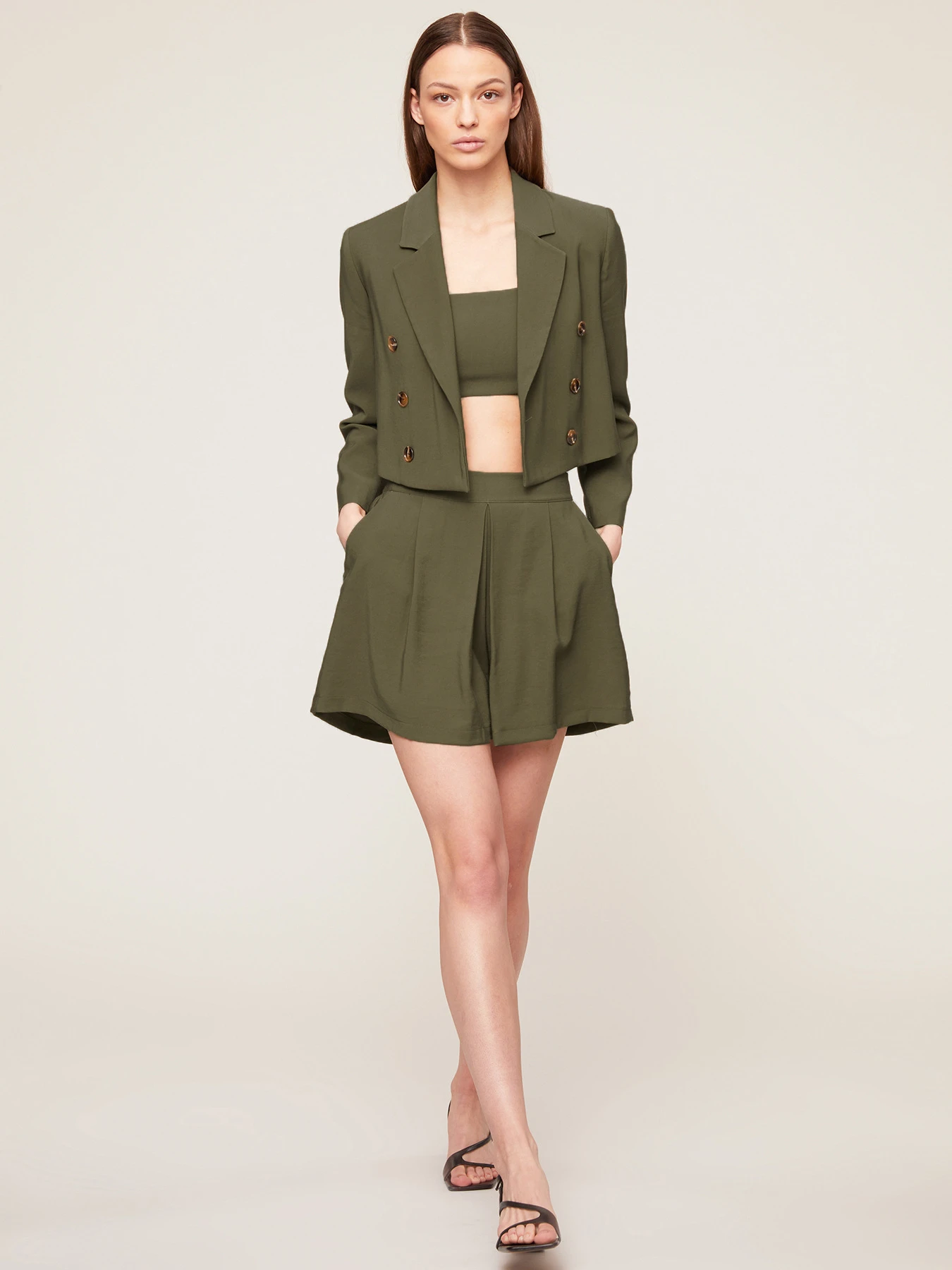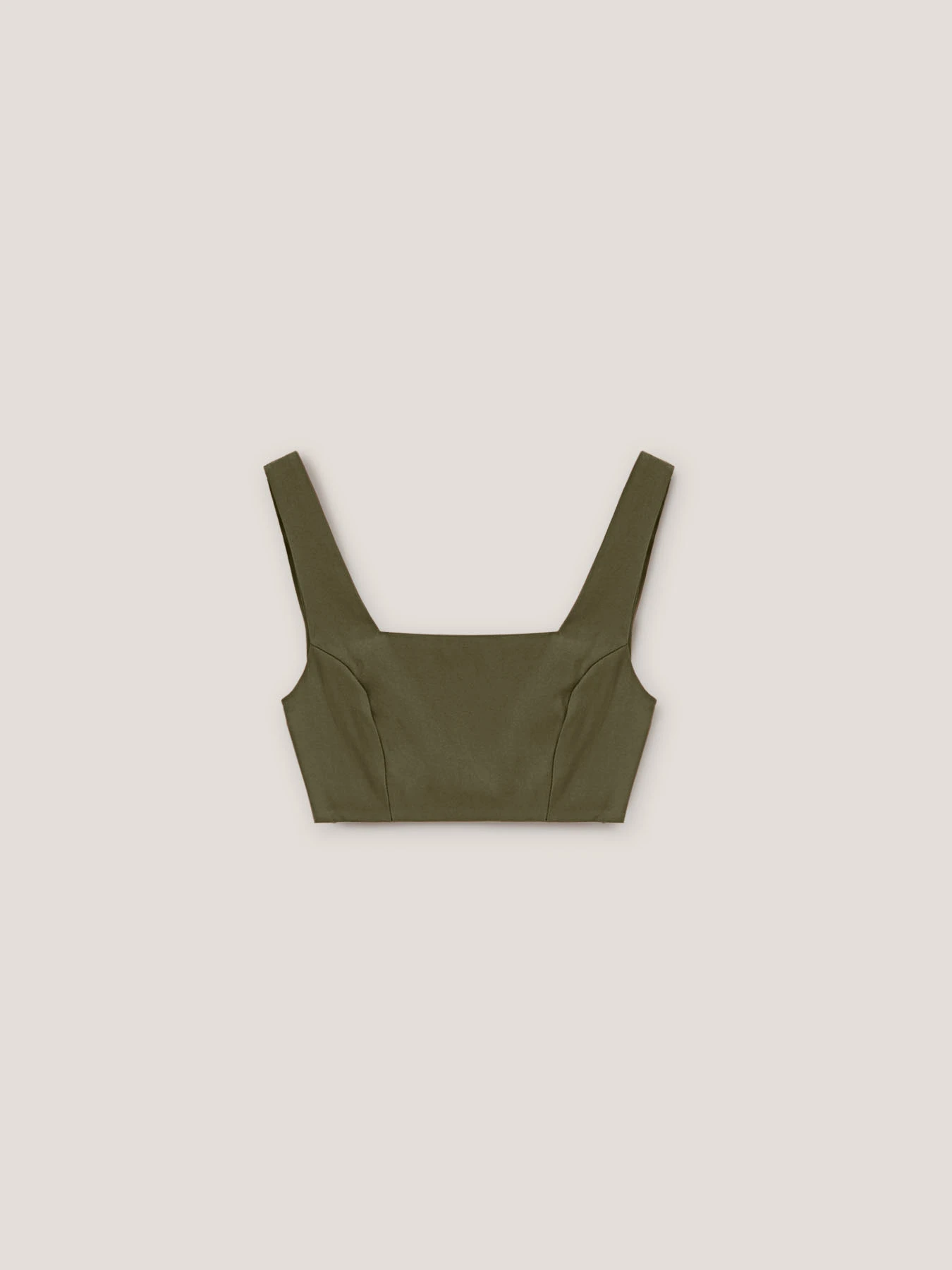 Top corto brassiere in tessuto misto viscosa; coppe sagomate, chiusura laterale con zip; spalla larga, parte elastica posteriore.