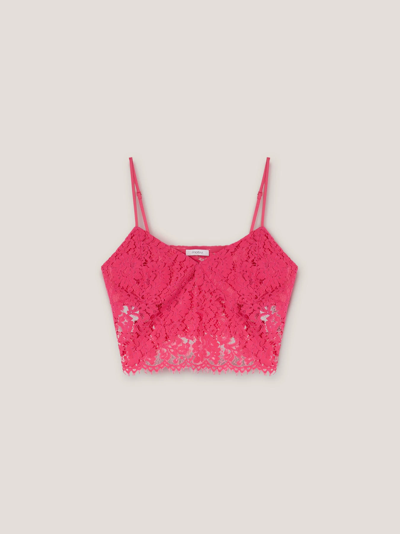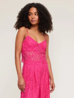 Top corto in pizzo; scollo a cuore con coppe sagomate; spalline fini regolabili, chiusura laterale con zip.
