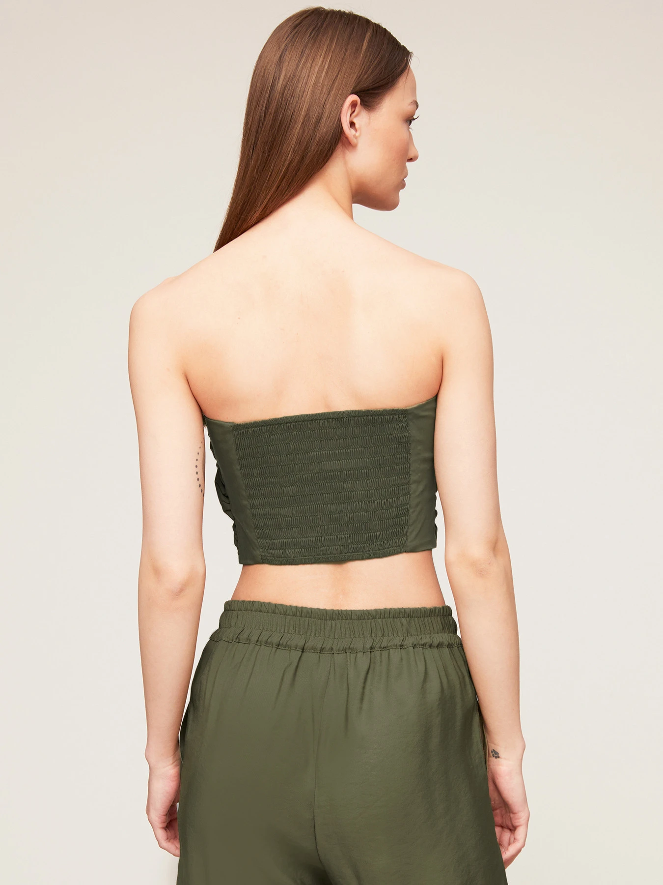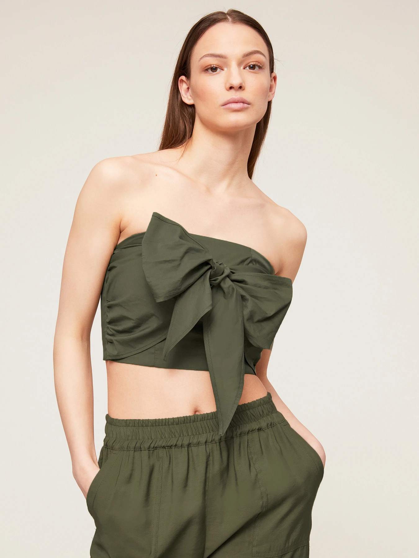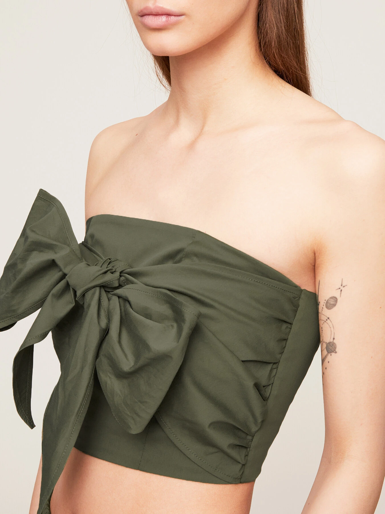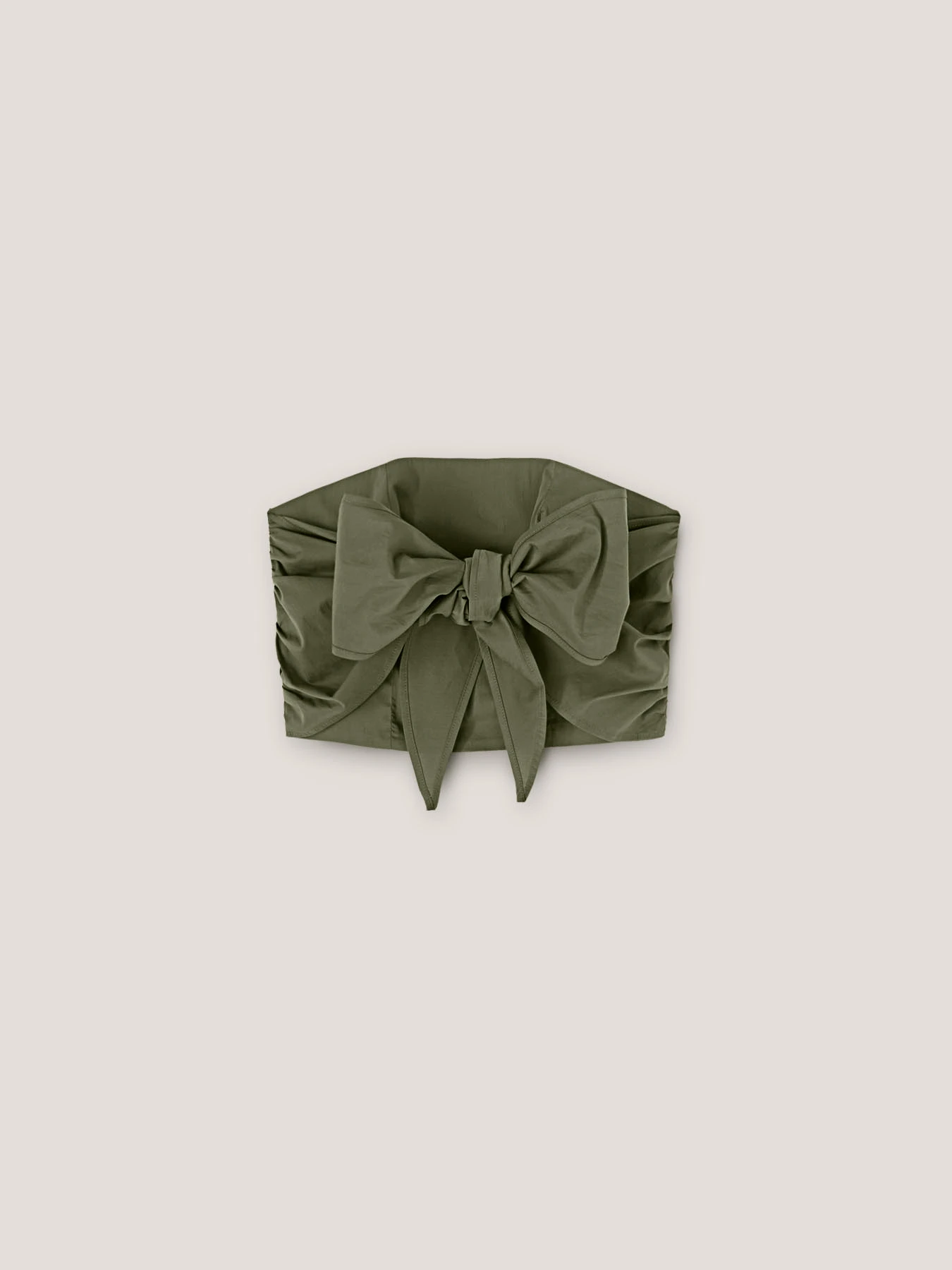 Top a fascia in popeline misto cotone; modello senza spalline con scollo diritto; parte posteriore con cuciture elastiche, motivo fusciacca da annodare a fiocco.