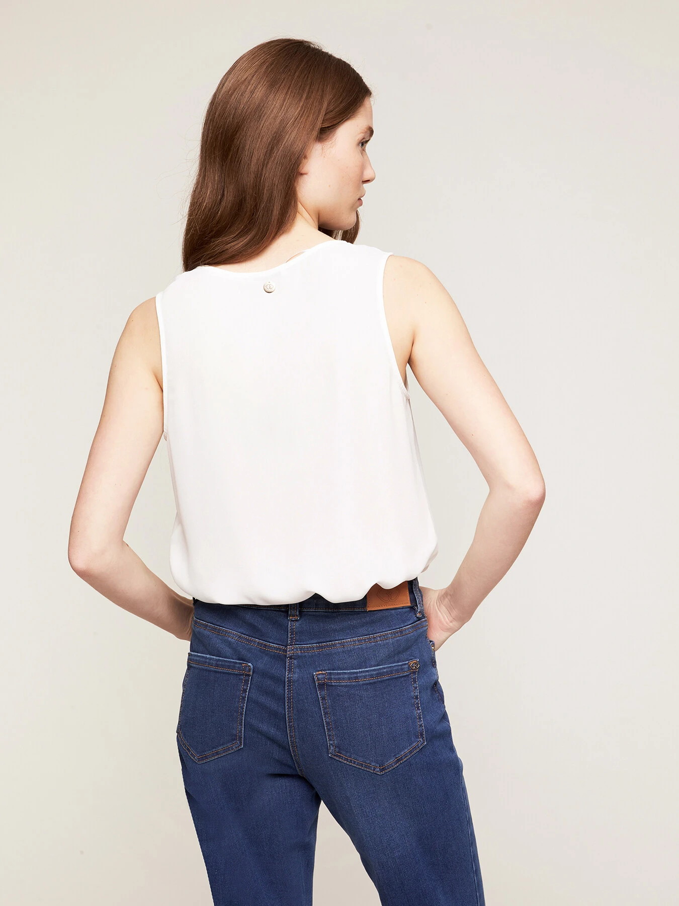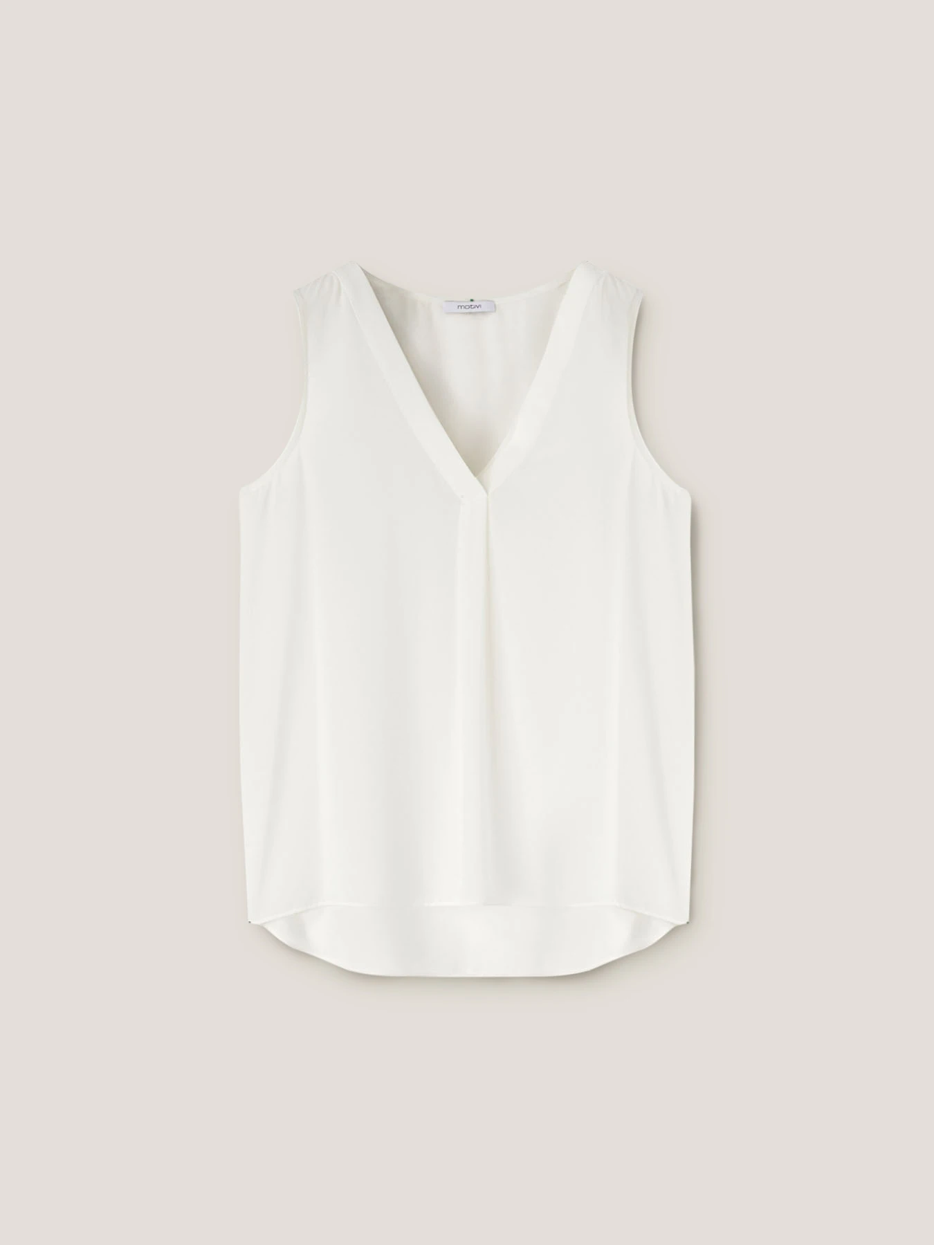 Top in fluido tessuto crêpe; scollo a v con piega a cannoncino; spalla larga.