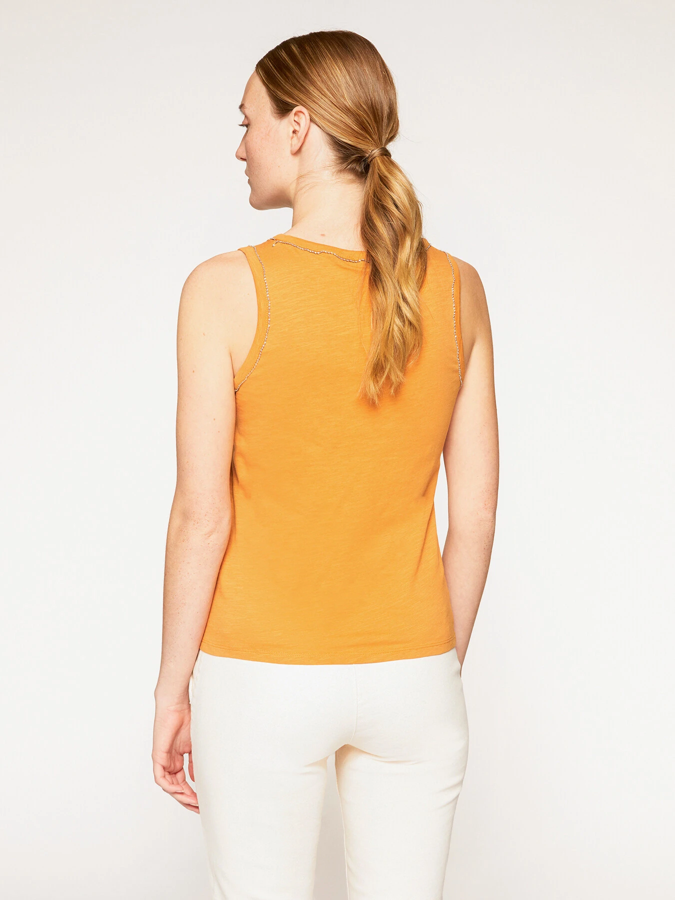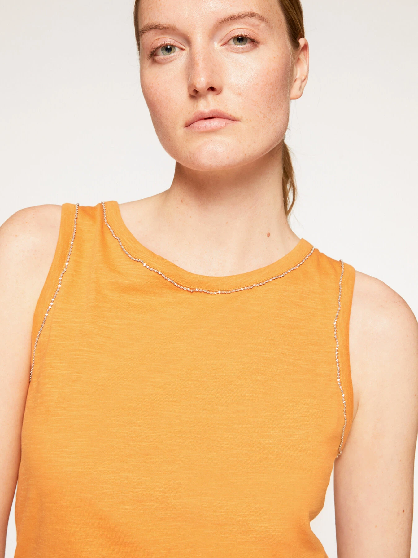 Top in jersey di cotone fiammato a spalla larga; vestibilità regular, ampio scollo tondo; ricamo con catenella metallica lungo i profili.; Scegliendo i nostri prodotti in cotone state supportando il nostro contributo alla missione di Better Cotton promuovendo una produzione più responsabile del cotone. Questo prodotto proviene da un sistema di bilancio di massa e pertanto potrebbe non contenere Better Cotton.