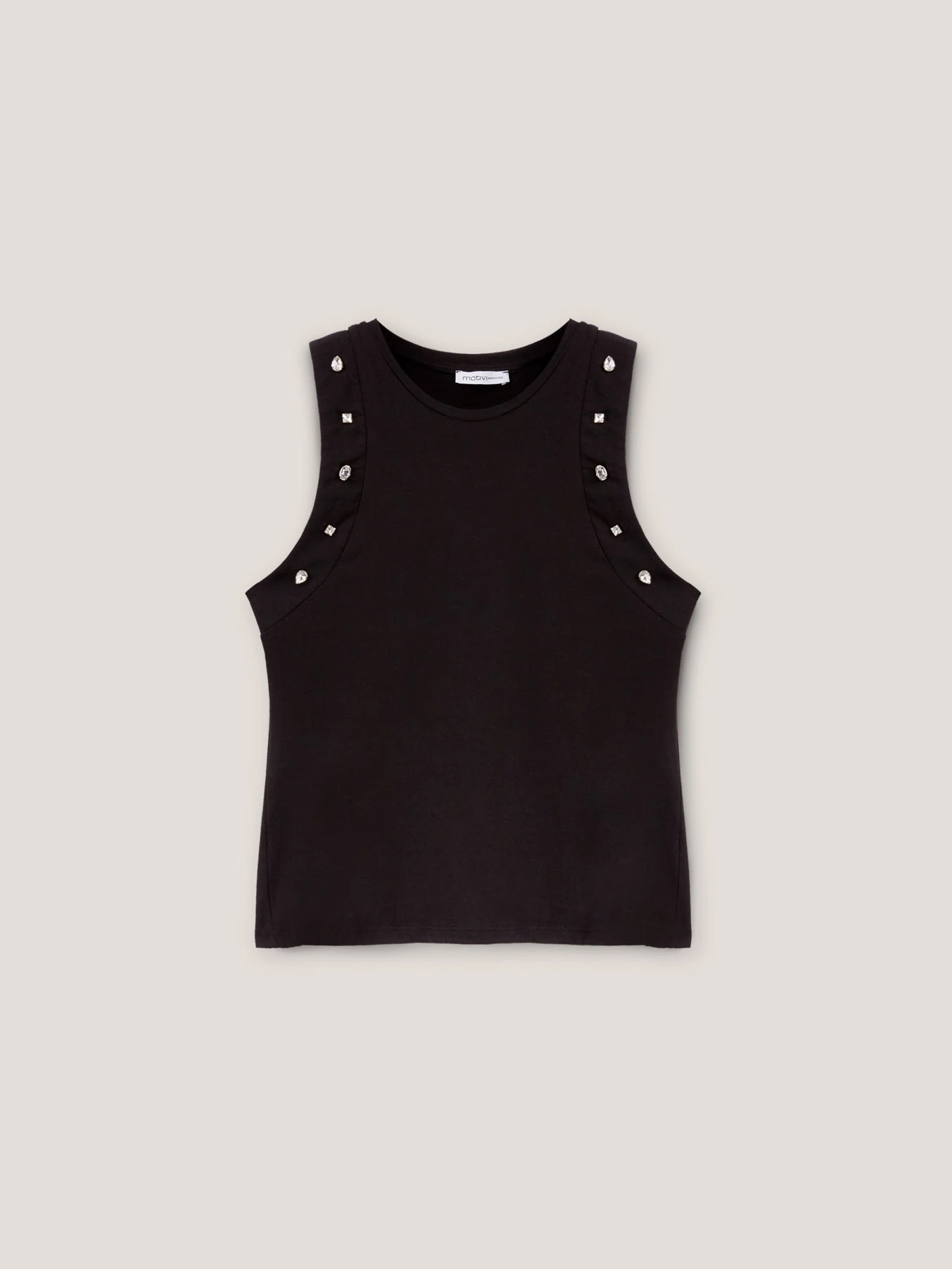 Top in jersey di cotone elastane; modello con scollo tondo e spalla larga; pietre crystal ricamate lungo il bordo del giromanica. MADE IN ITALY