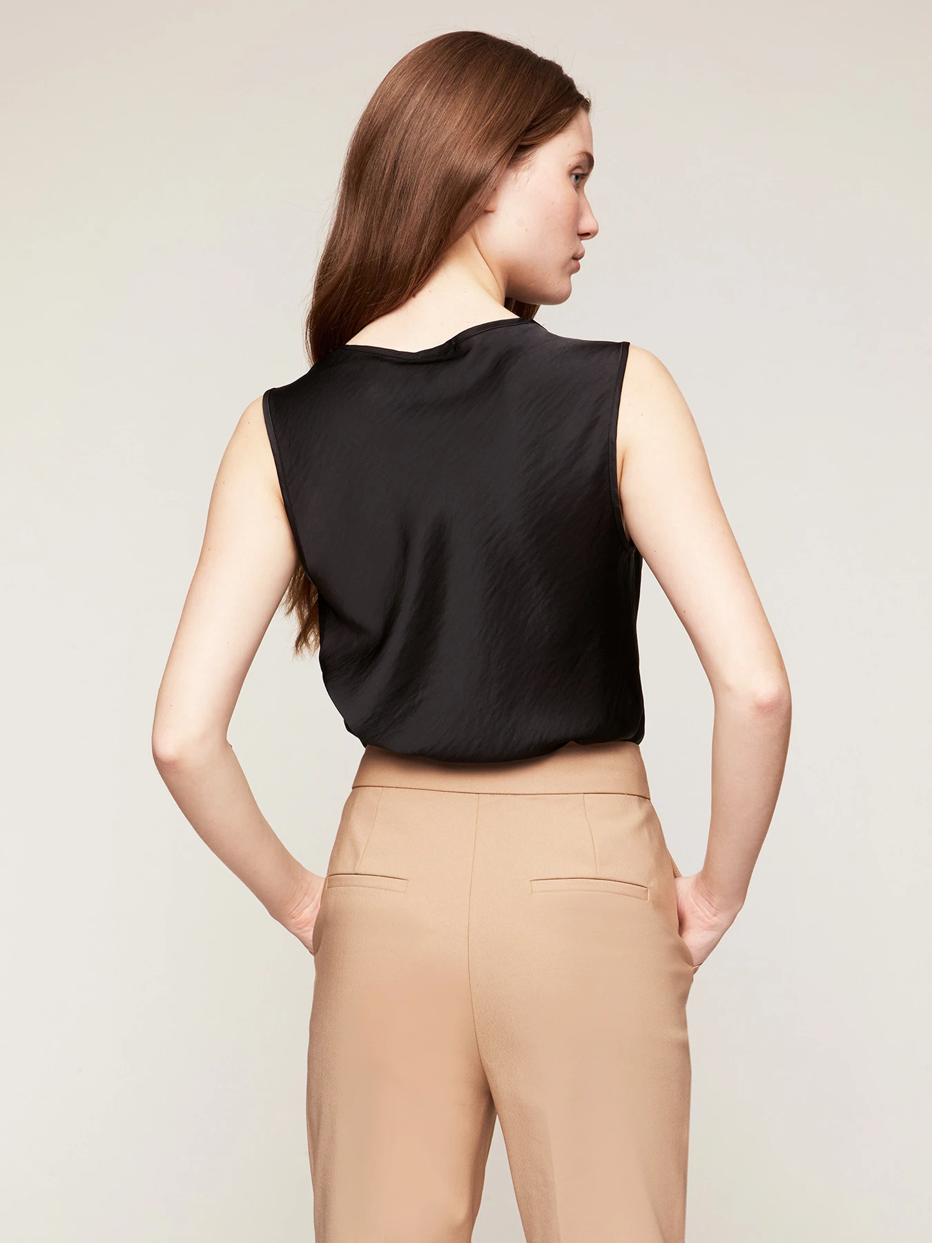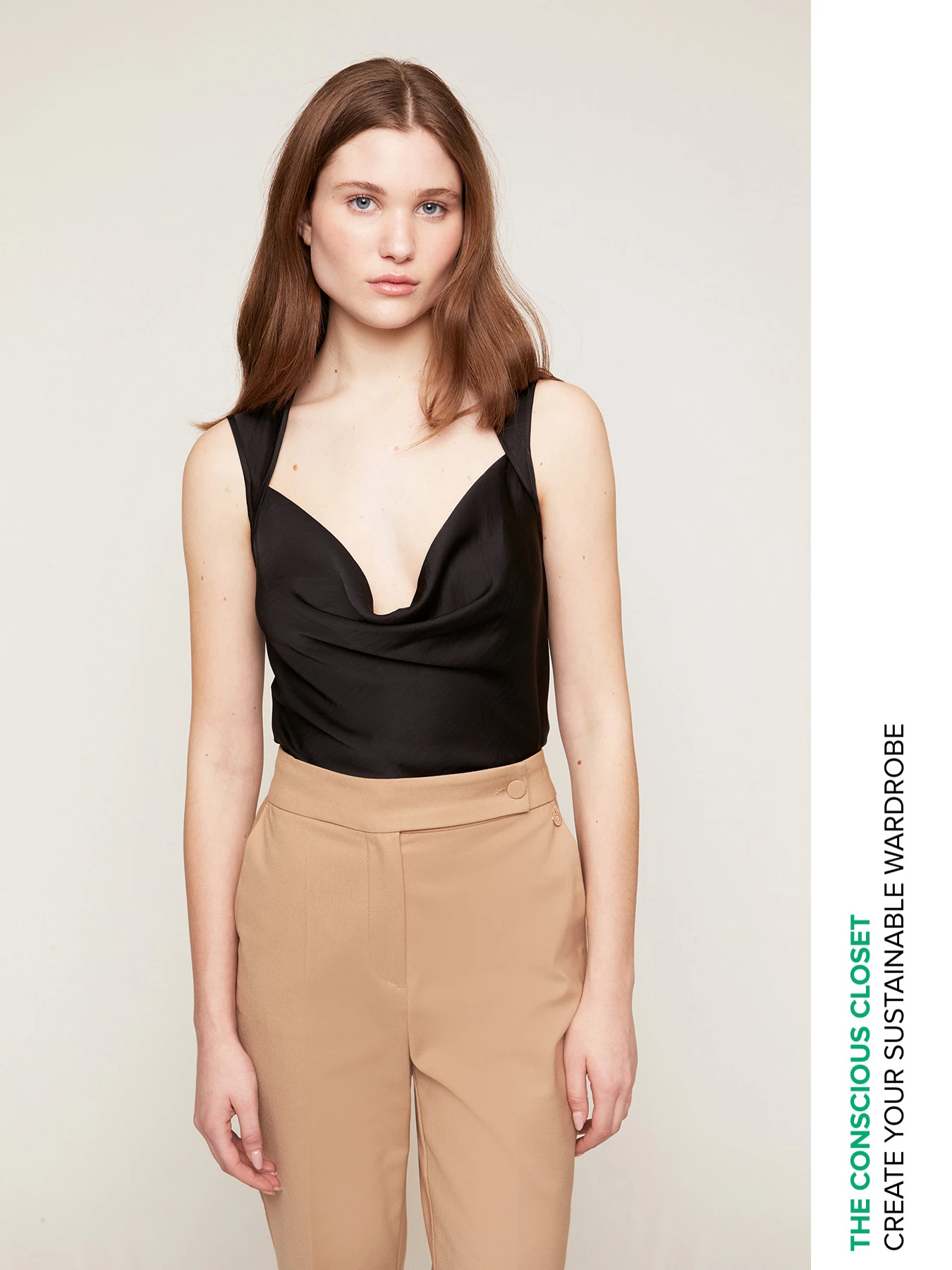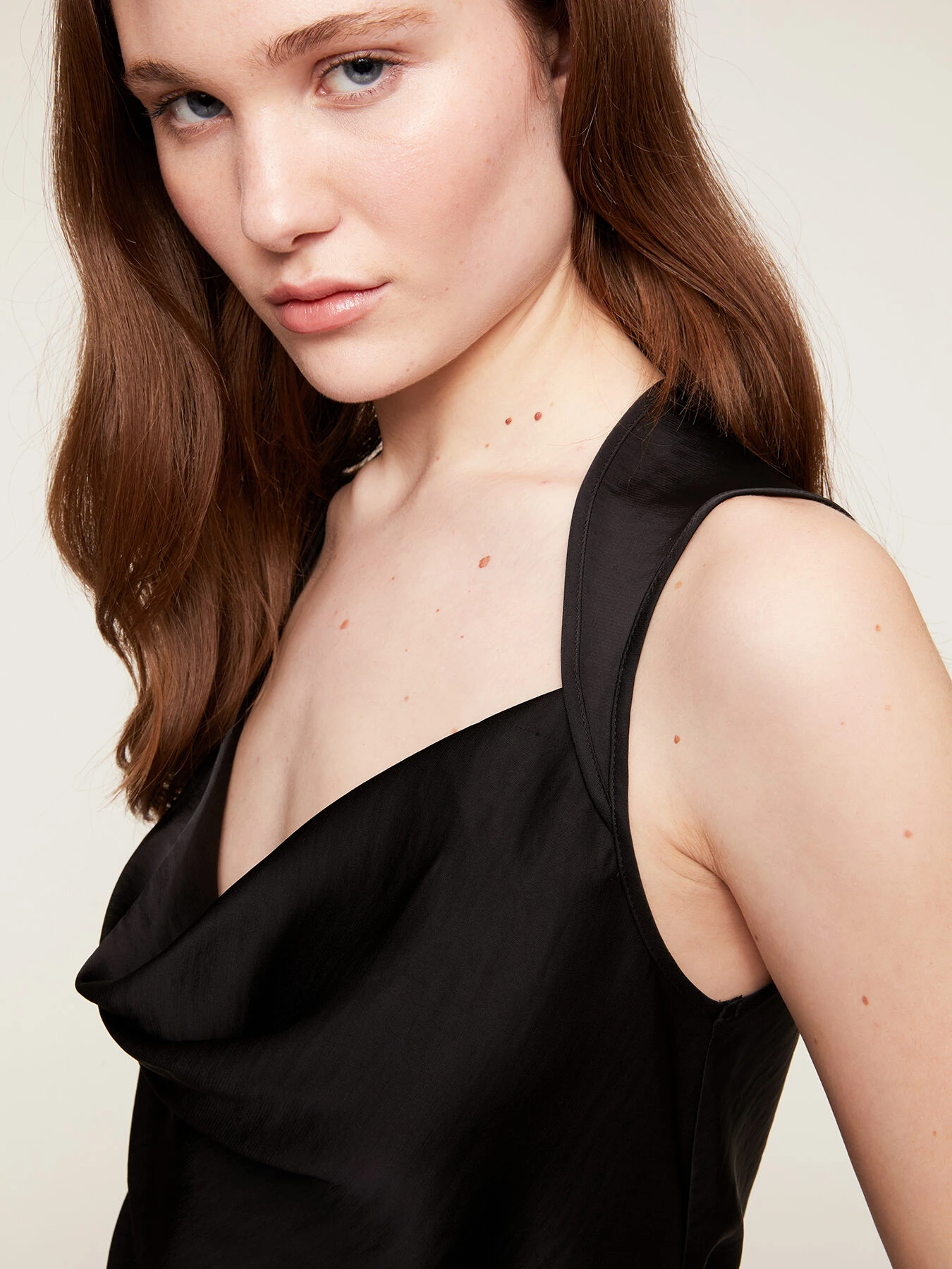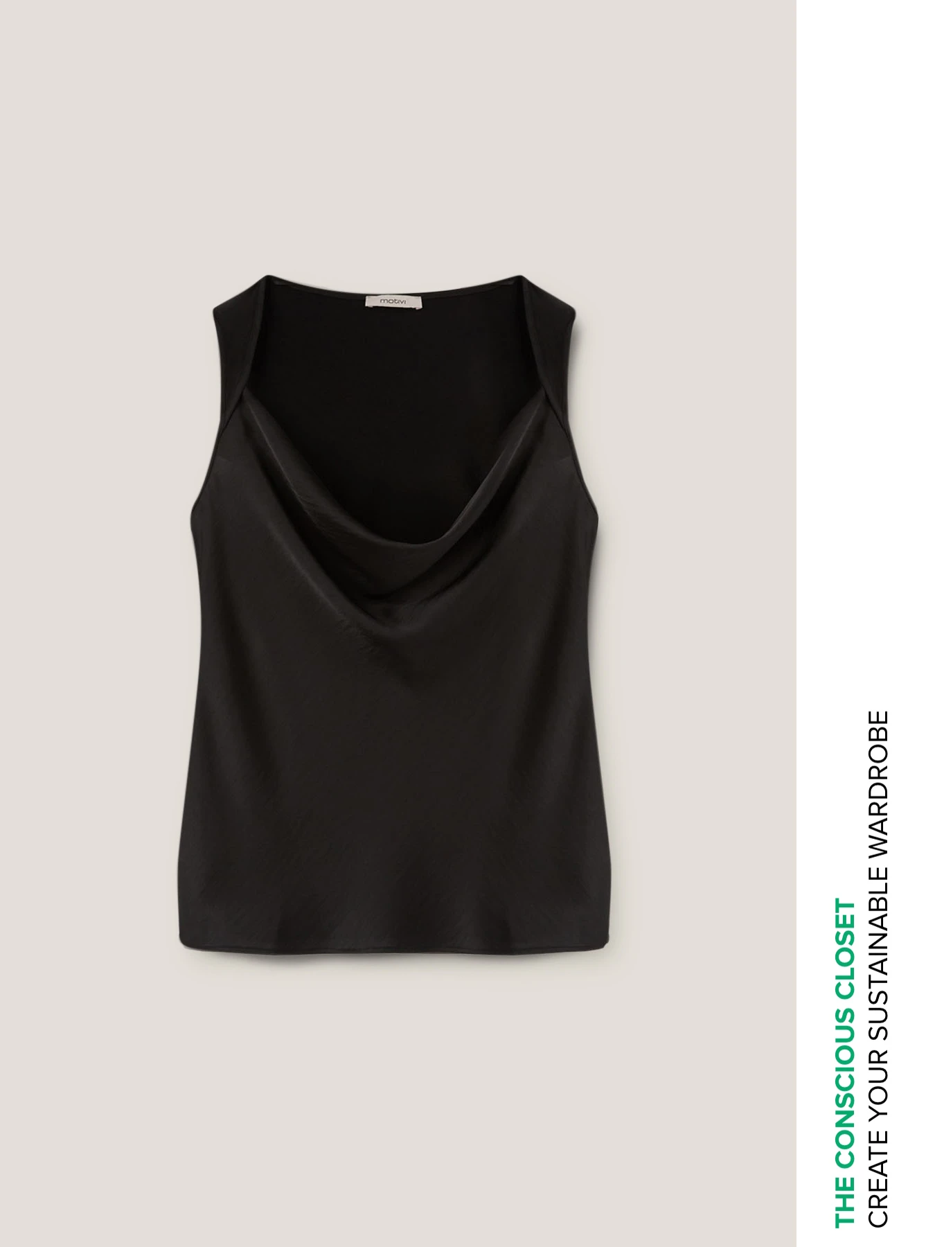 Top in raso di poliestere riciclato tinta unita; modello senza maniche con spalla larga; scollo frontale con motivo drappeggiato.; Più del 50% del prodotto è realizzato con materiale riciclato.
