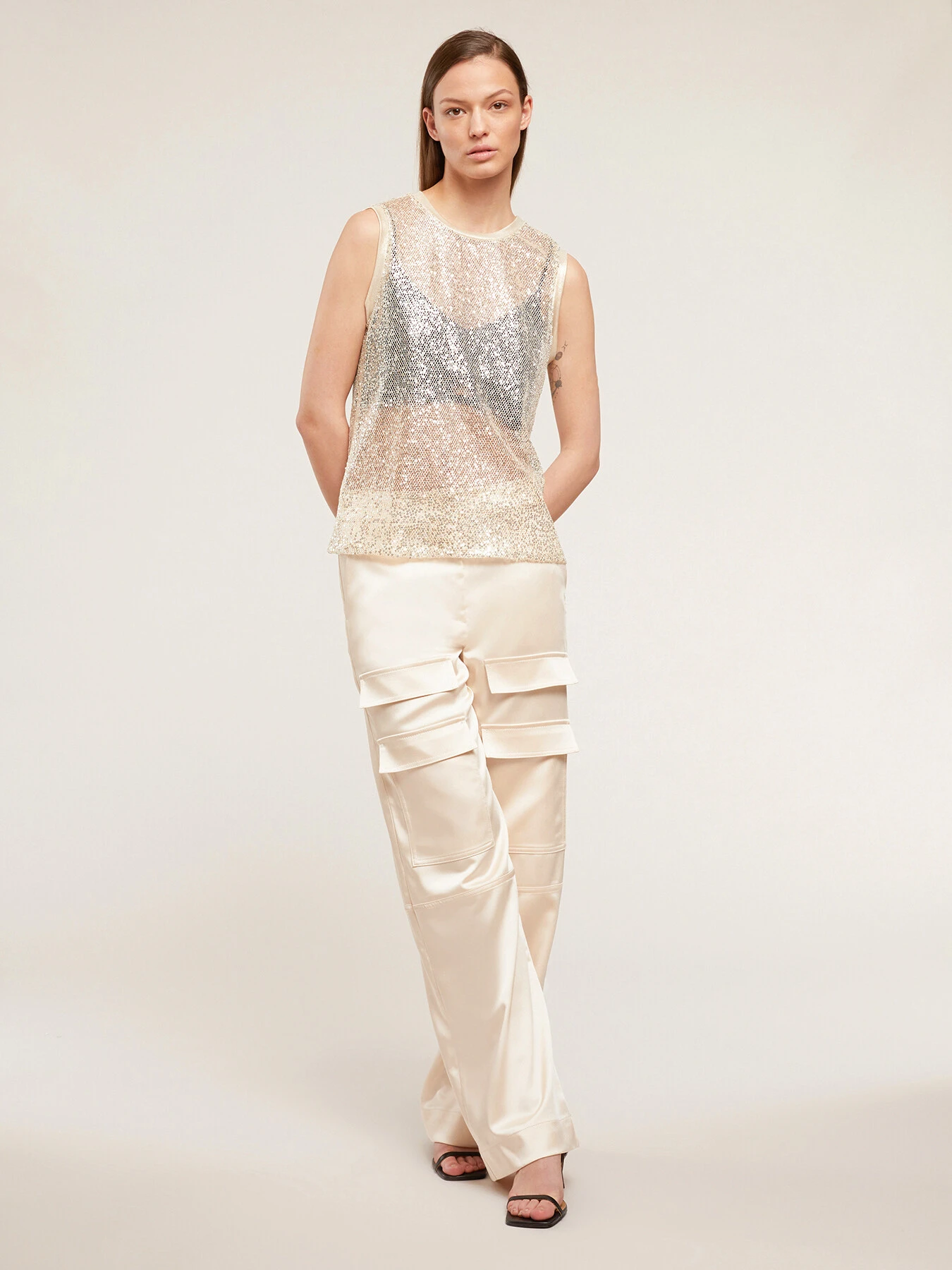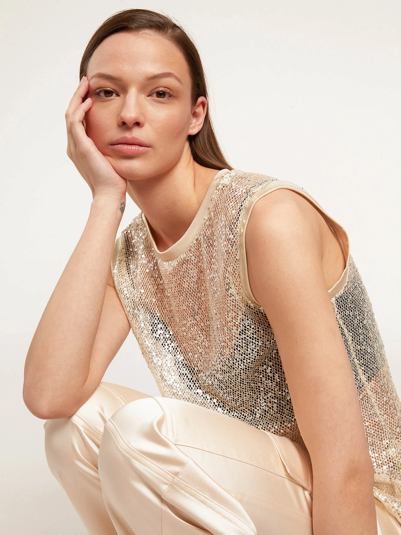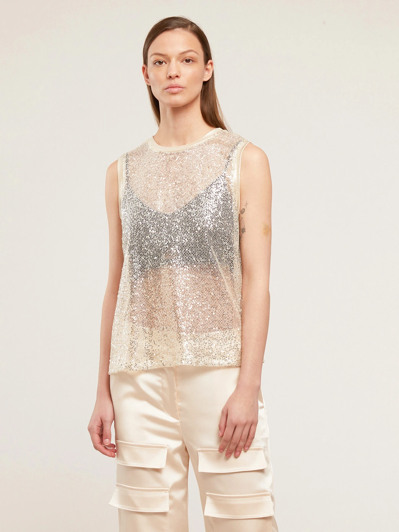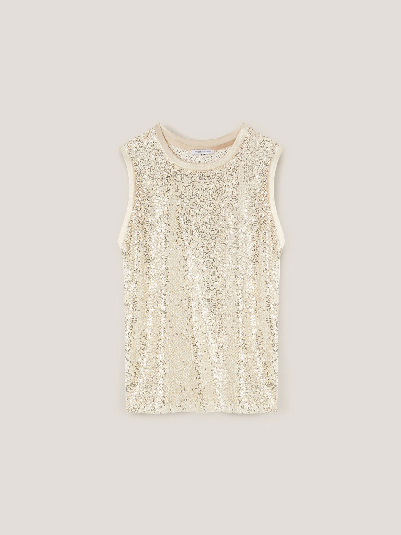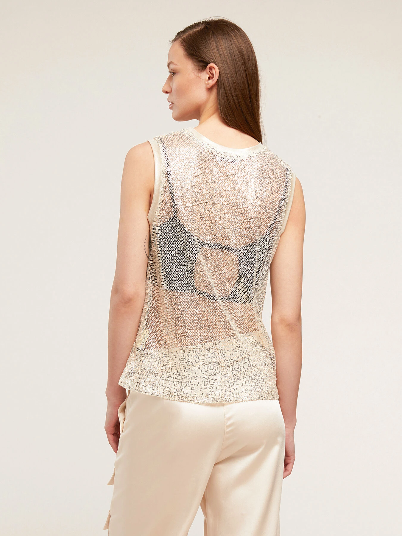 Top in rete con paillettes; modello senza maniche a spalla larga; scollo tondo. MADE IN ITALY