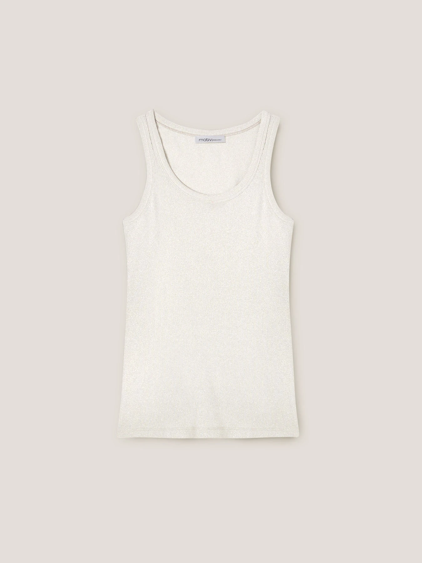 Top lurex in jersey a coste misto viscosa; modello a spalla larga; scollo tondo.