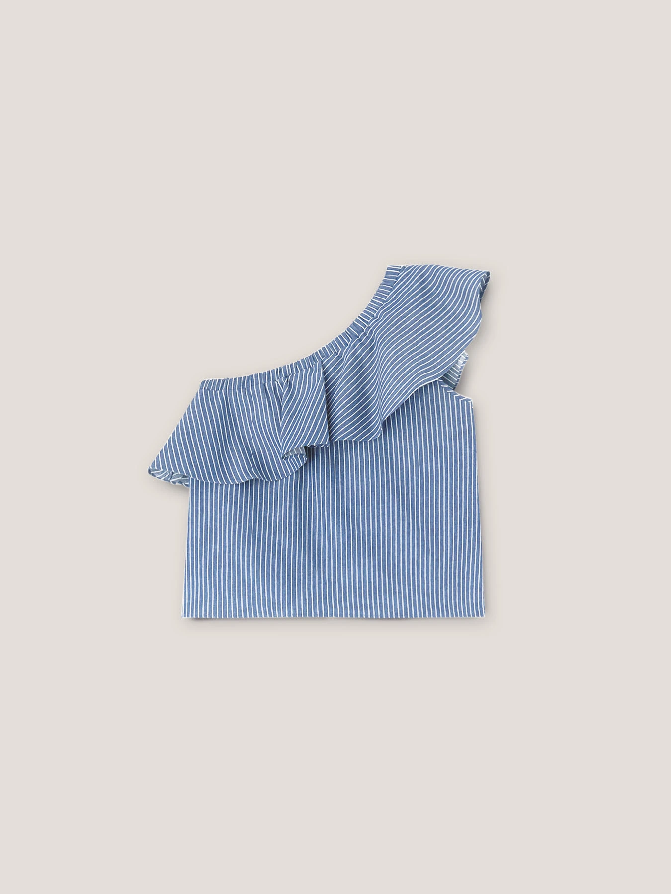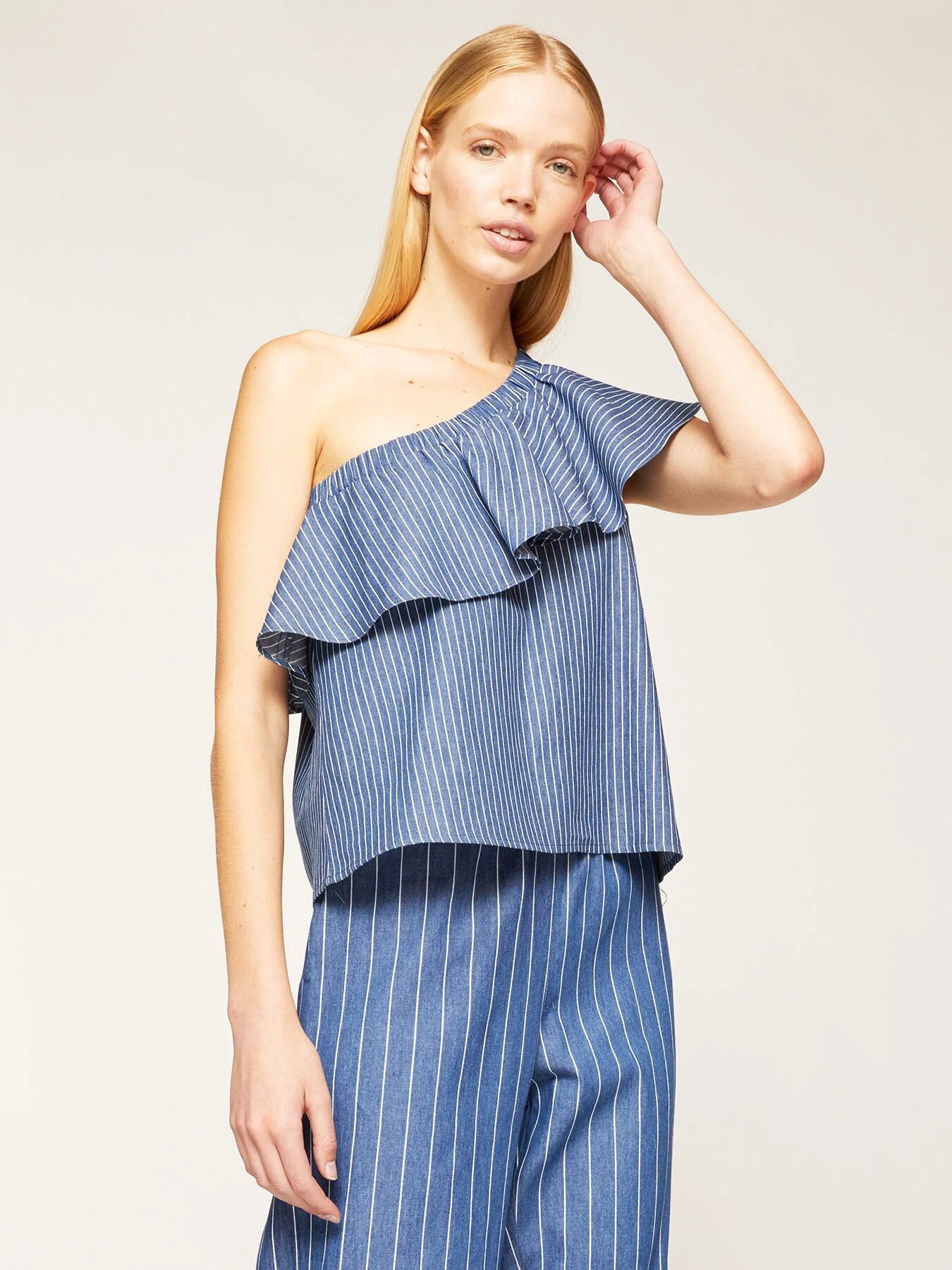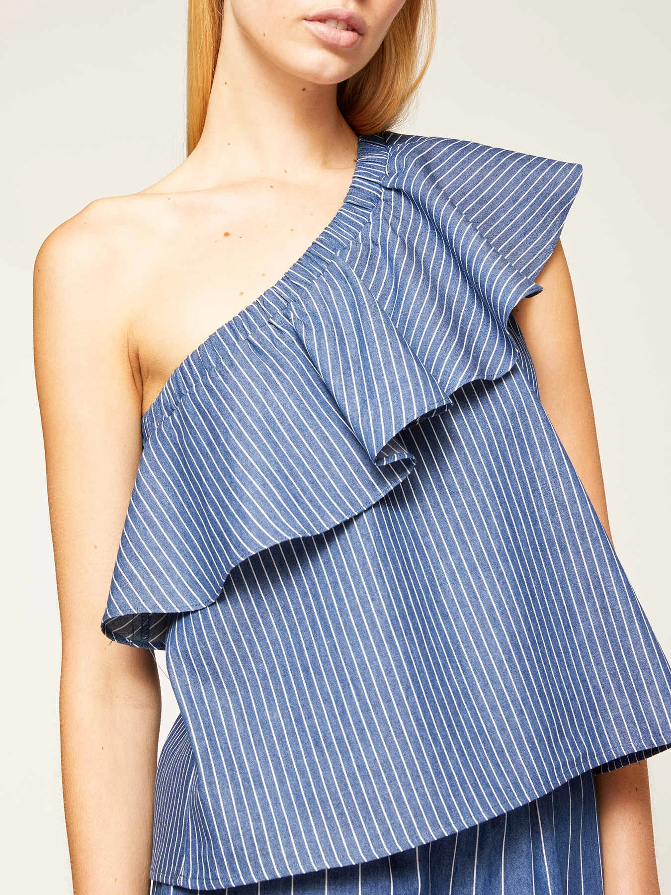 Top in tela di cotone effetto denim gessato; modello senza maniche con taglio monospalla; maxi srouches su scollatura con elastico interno.