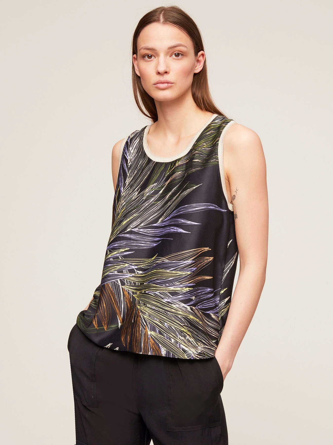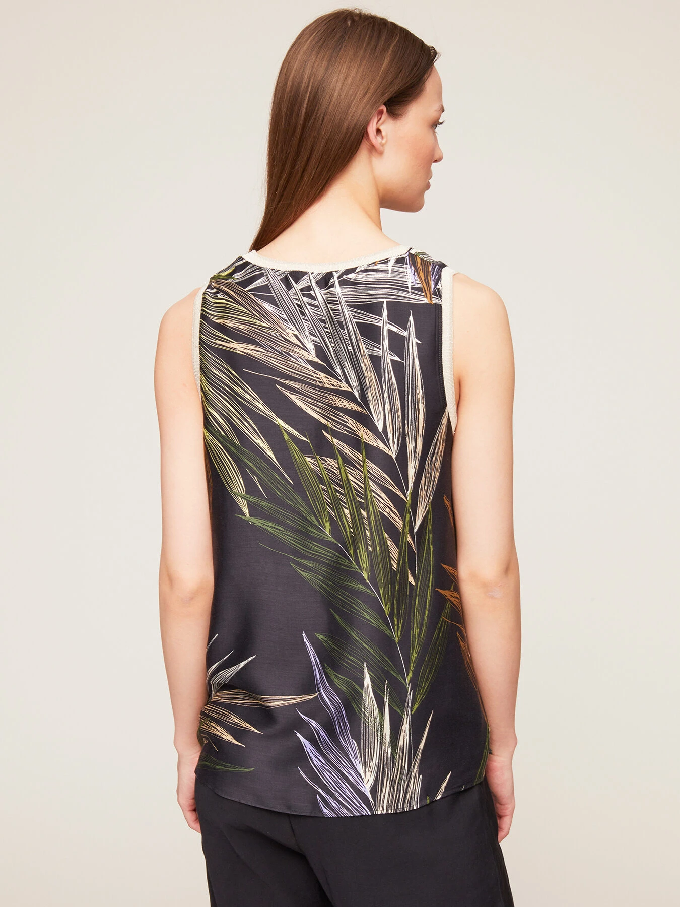 Top in raso di viscosa fantasia foliage; modello con scollo tondo e spalla larga con bordo a coste lurex oro; vestibilità regular.