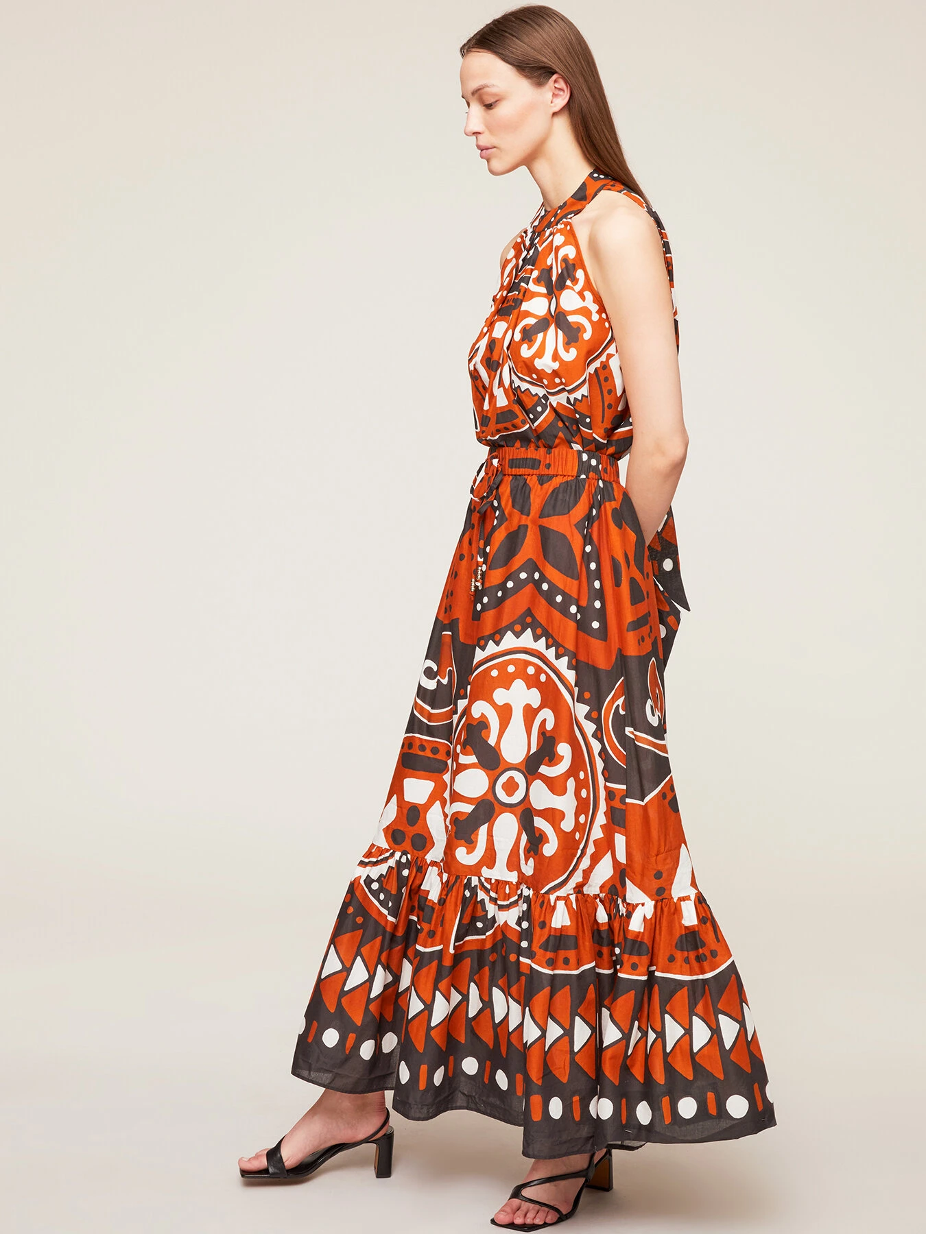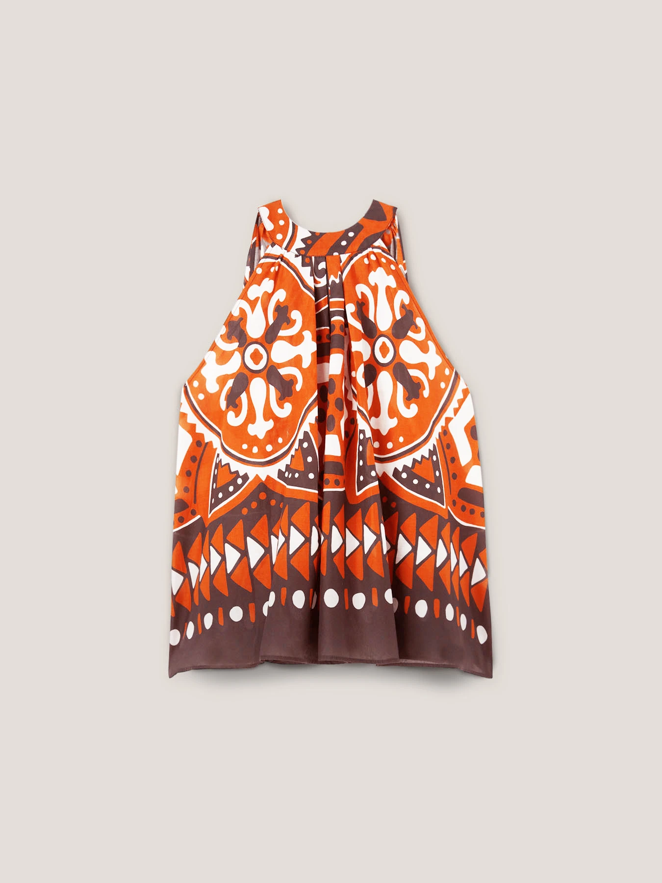 Top svasato in mussola di cotone fantasia etnica; modello senza maniche; scollatura all’americana con motivo a goccia posteriore e nastri da annodare.