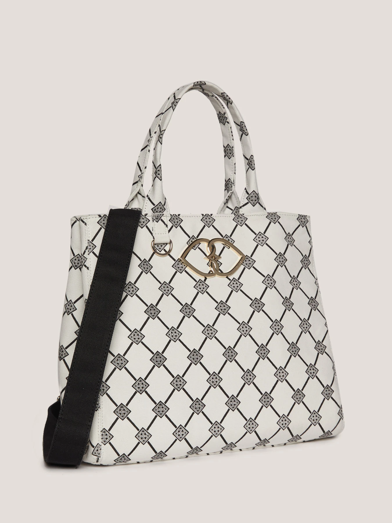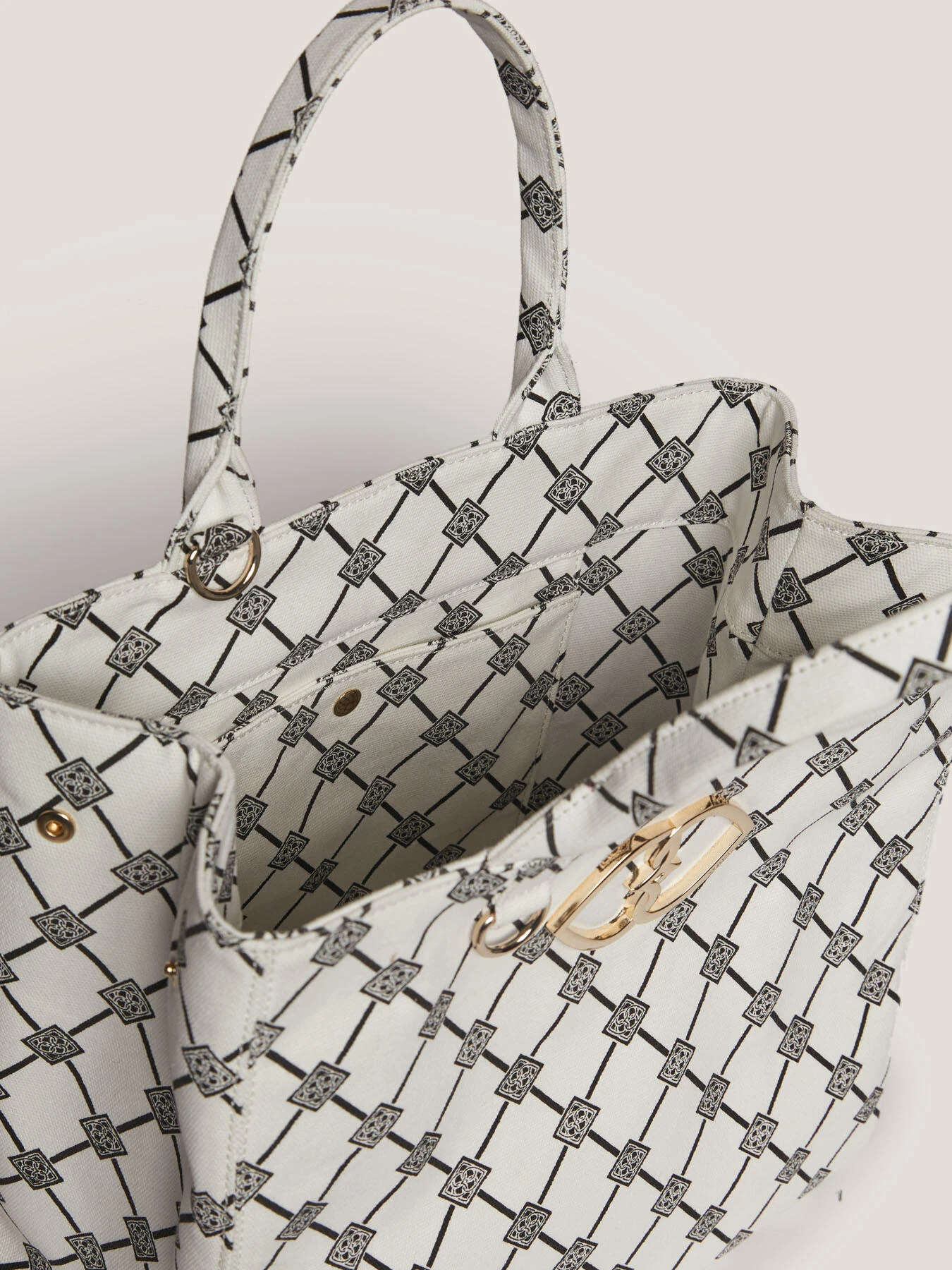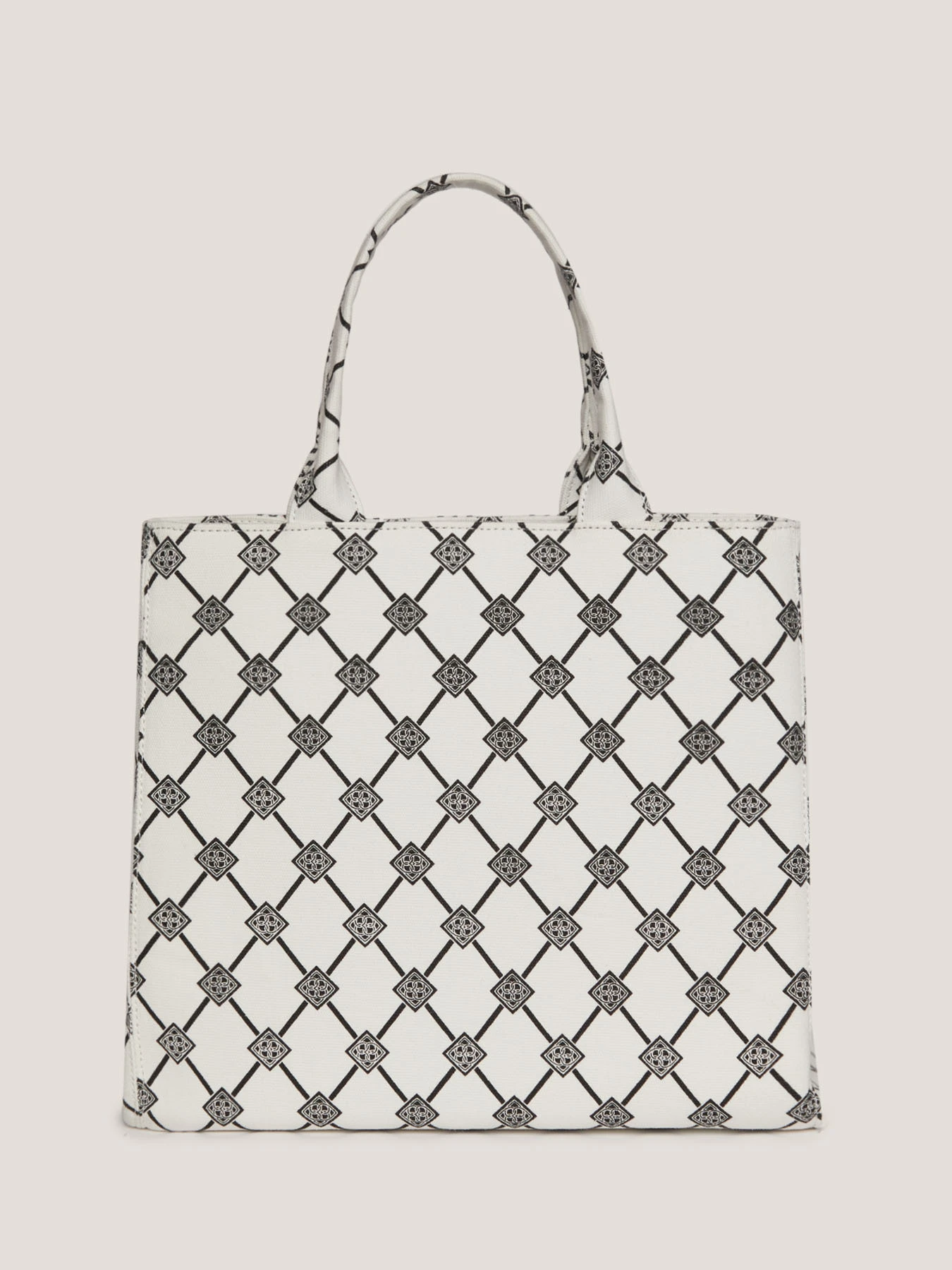 Tote bag in cotone stampato; tracolla regolabile in canvas unito, placca metallica Double Love, tasca interna; dimensioni: altezza 33 cm, larghezza 32 cm, ampiezza 12 cm.